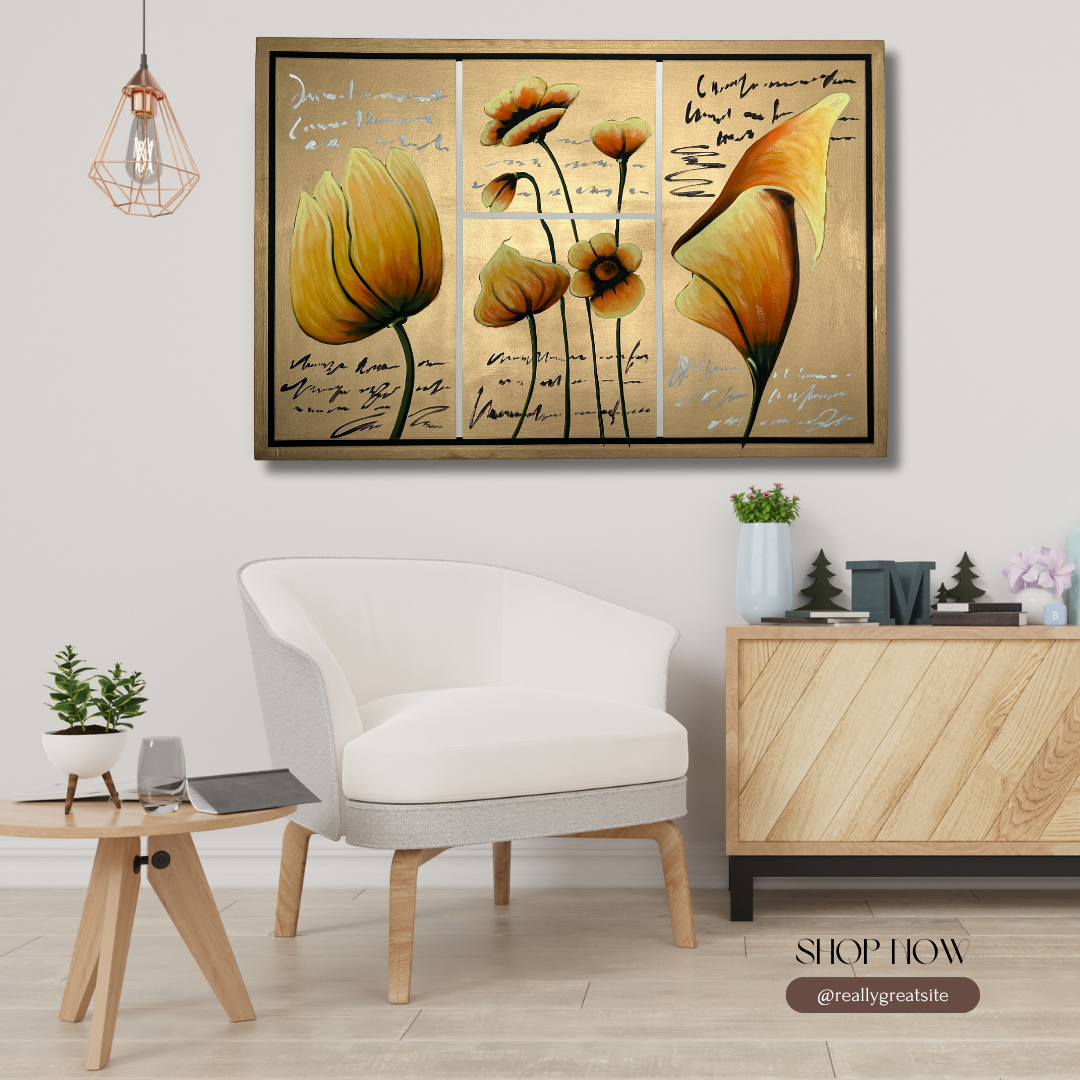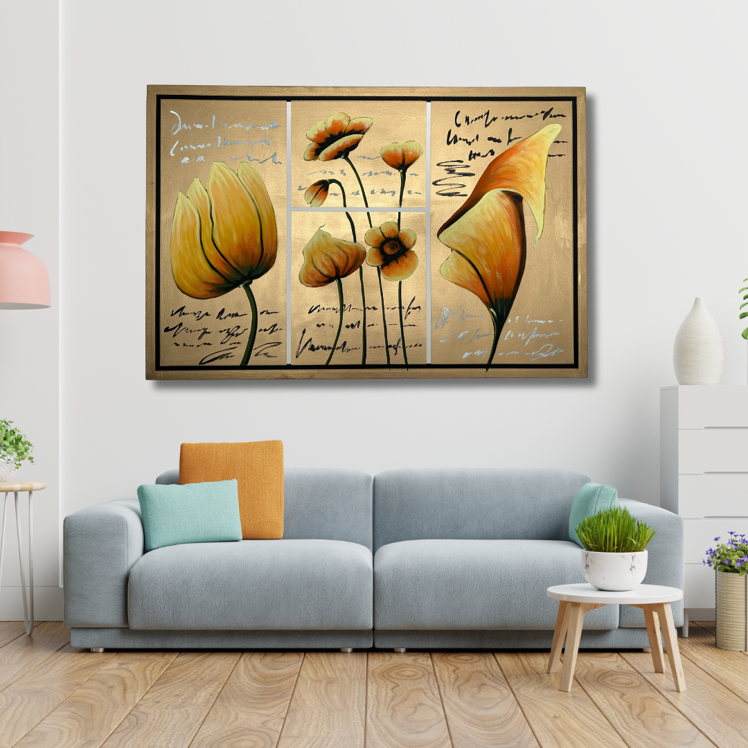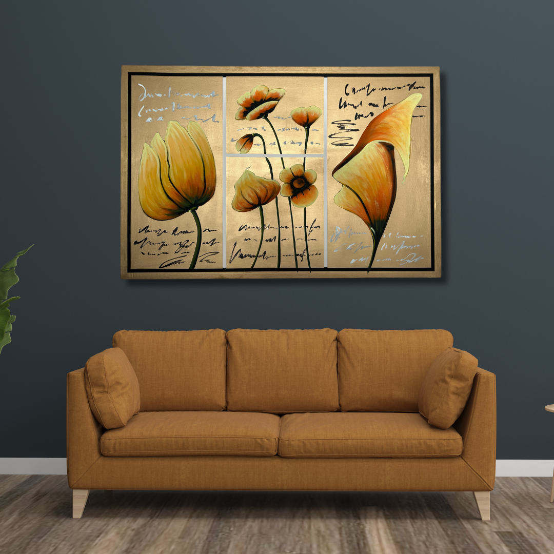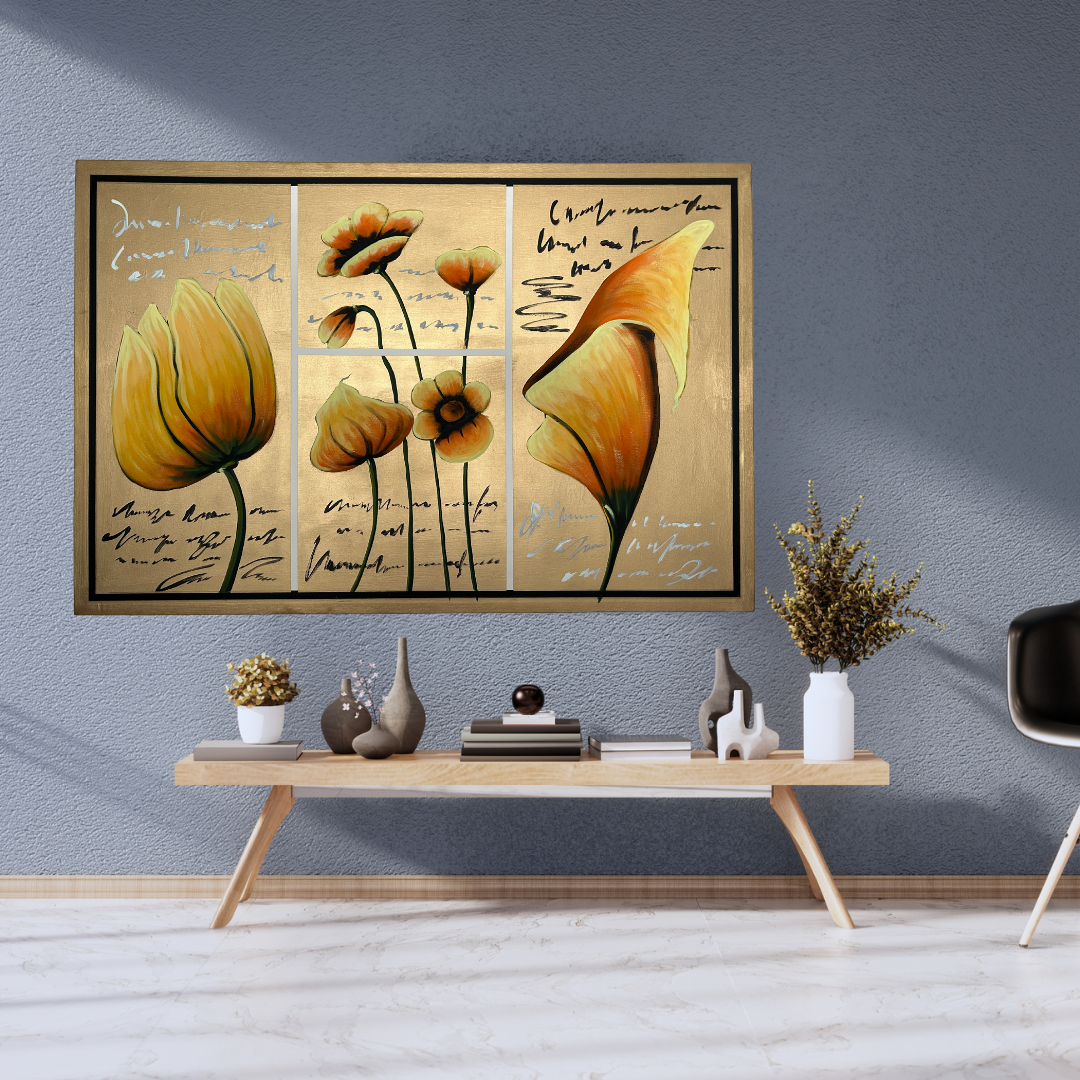 Creado con una exquisita técnica mixta, "Susurros de la Primavera" combina la profundidad y el vibrante color del acrílico con texturas sutiles y acabados metálicos que capturan y reflejan la luz. Las suaves tonalidades amarillas y anaranjadas de las flores se posan sobre un fondo dorado, creando un contraste visual que evoca calidez y armonía. La caligrafía abstracta añade un toque poético y enigmático, invitando a la contemplación y a la imaginación.