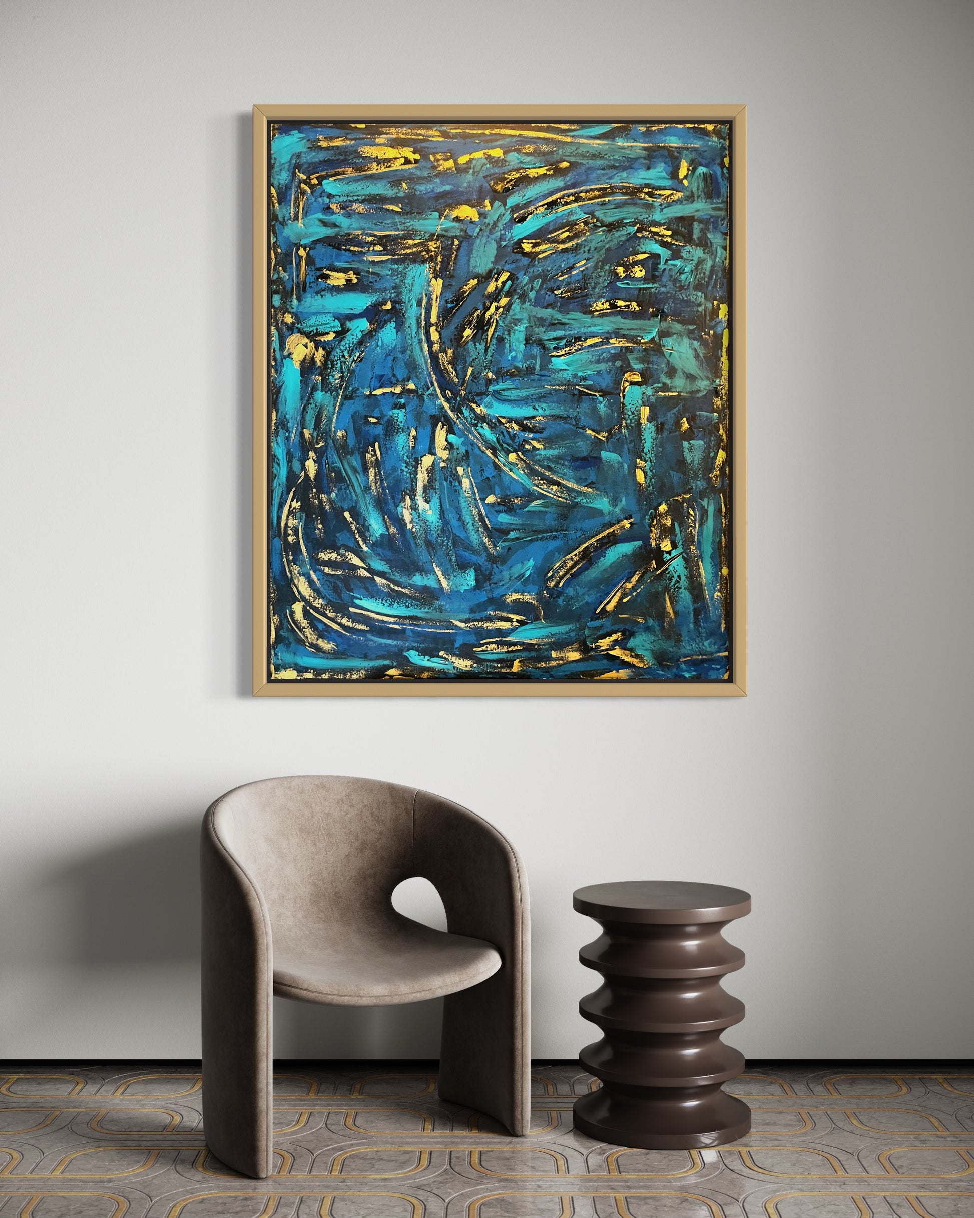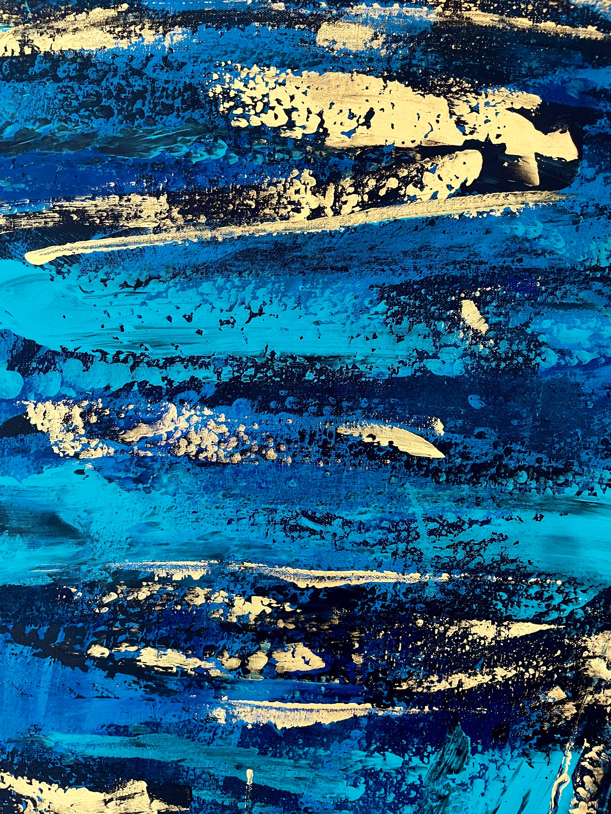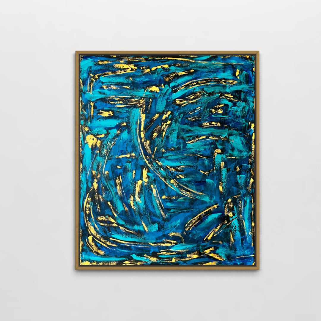 El lienzo está dominado por trazos dorados que se entrelazan y se superponen, creando la ilusión de un cardumen en constante movimiento.