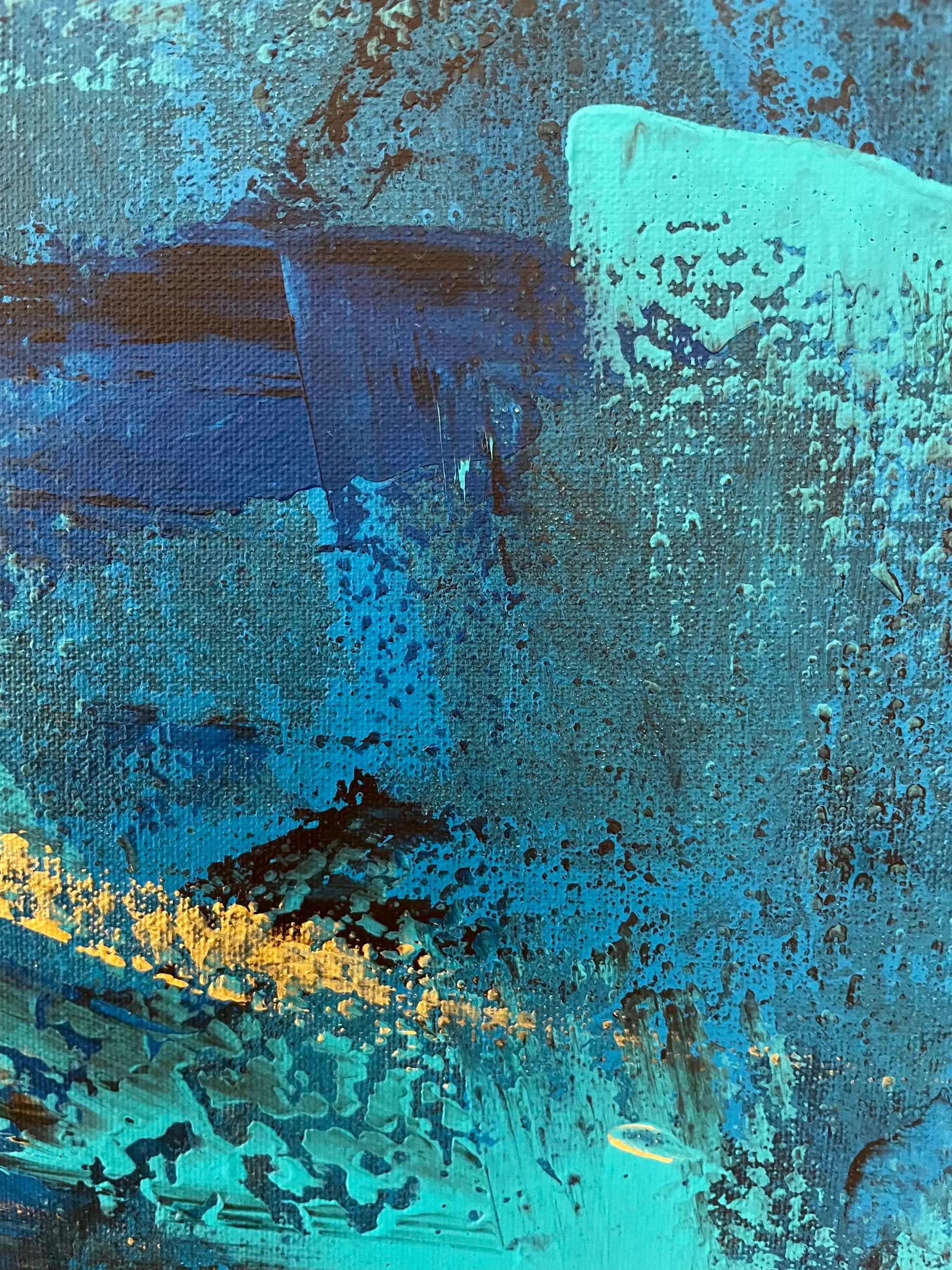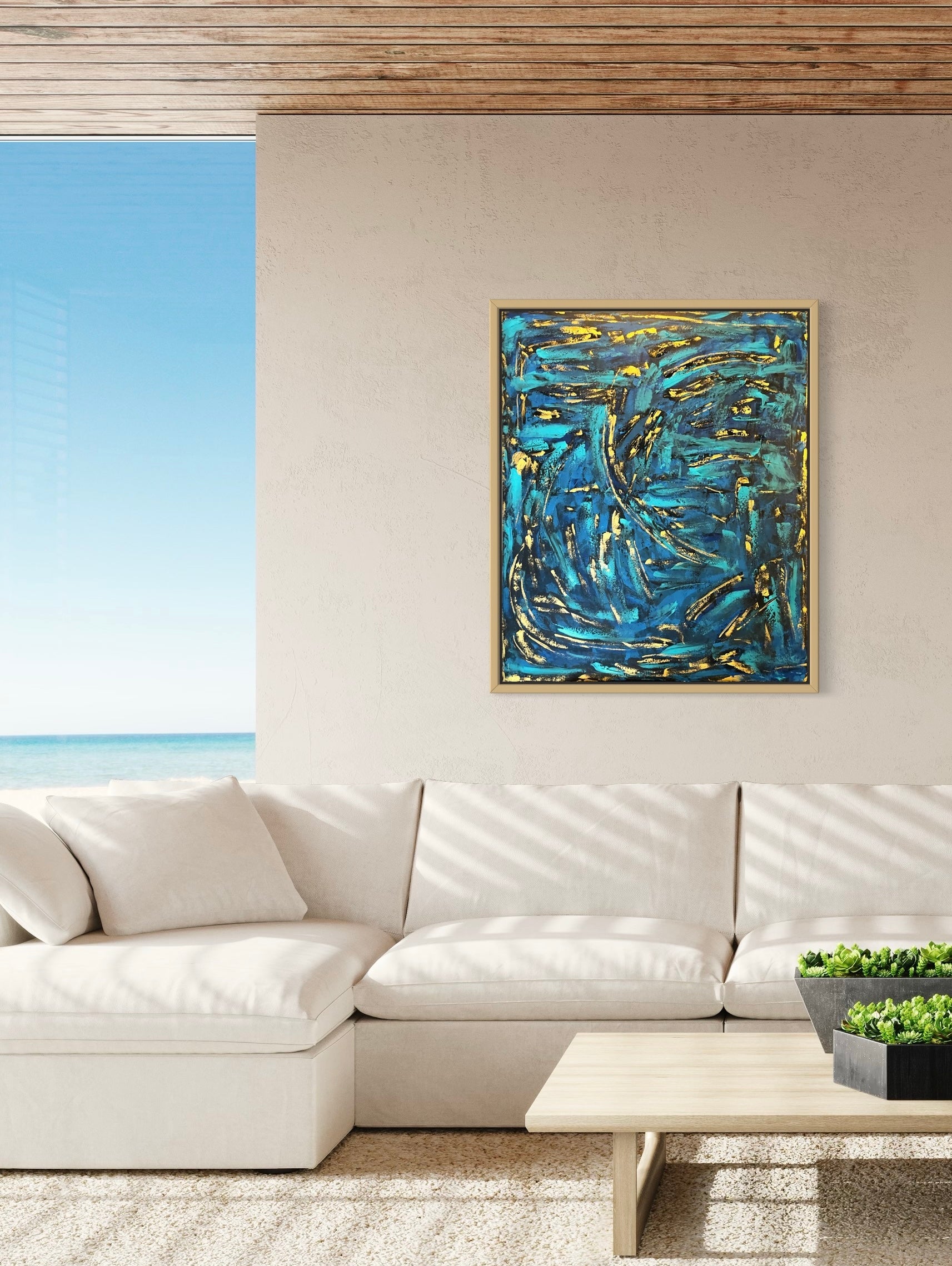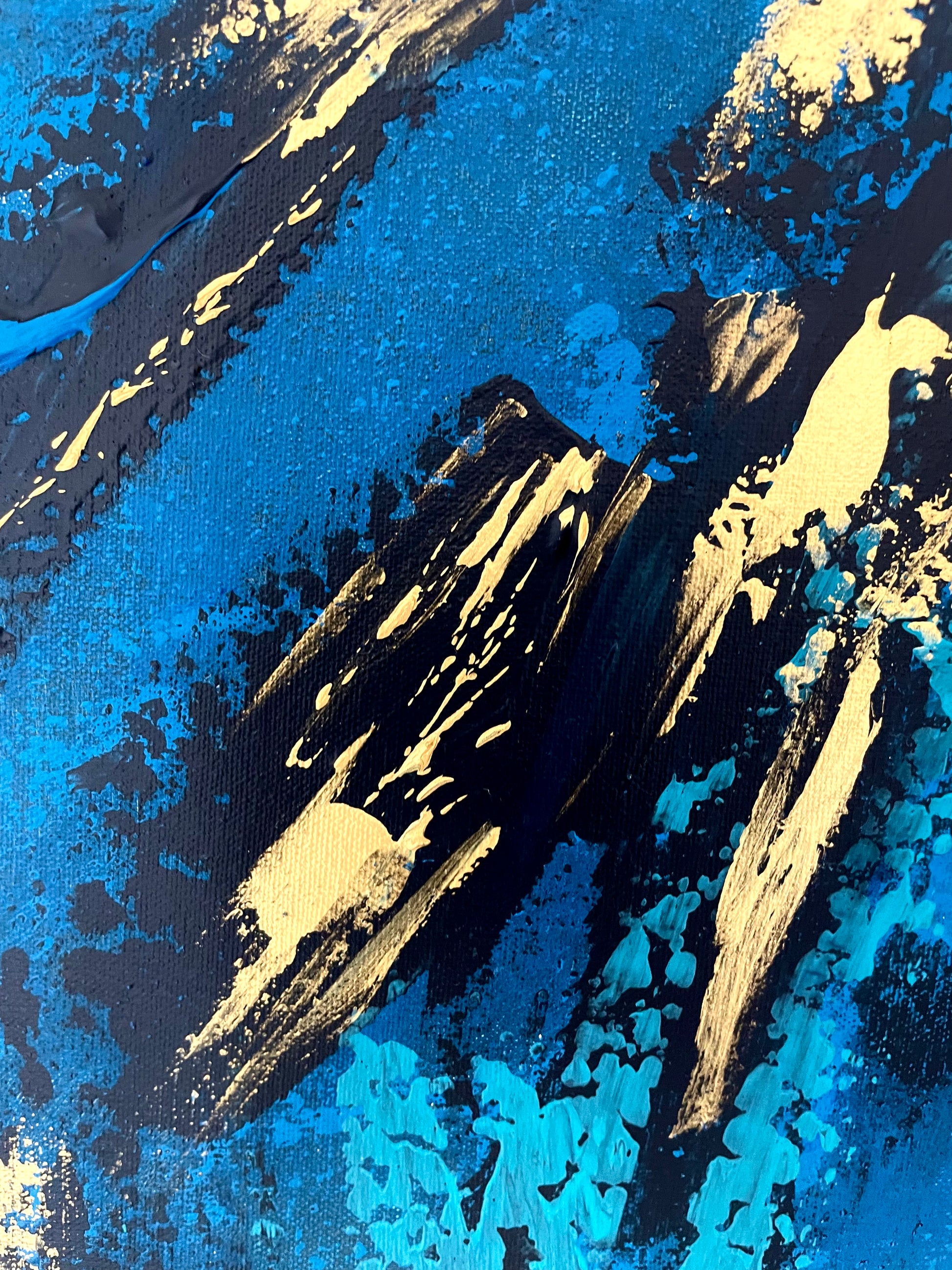 El lienzo está dominado por trazos dorados que se entrelazan y se superponen, creando la ilusión de un cardumen en constante movimiento.