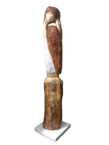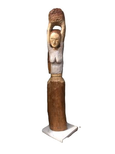 Tallando una rama de jacaranda encontré una mujer cargando la esperanza. Talla en madera de 87cm, base de mármol.