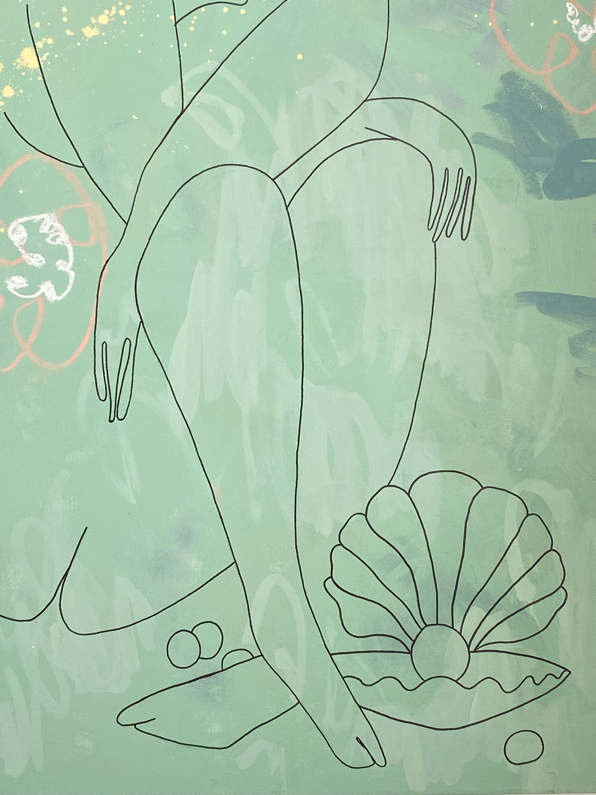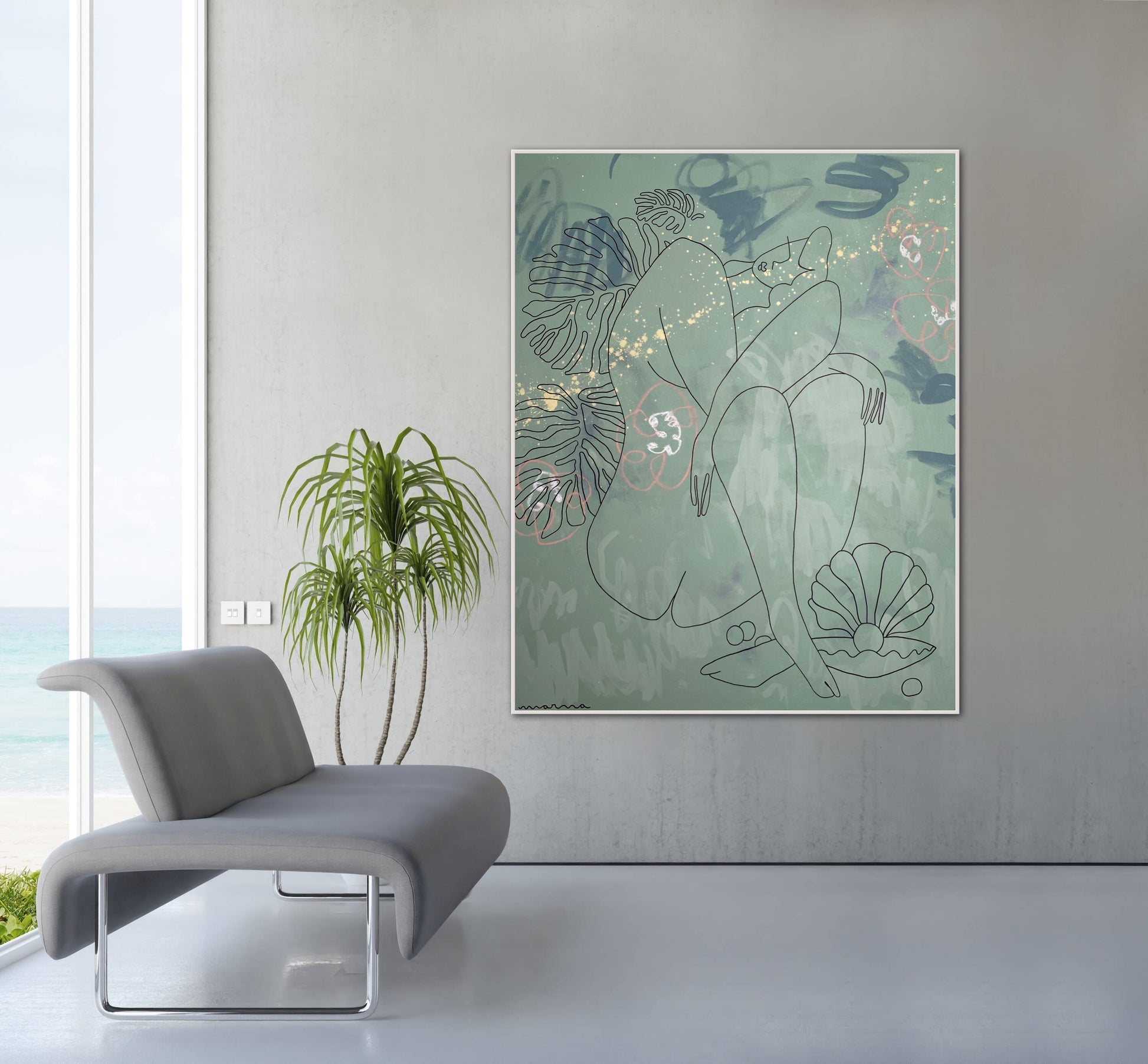 Una musa está sentada, inmersa en sus pensamientos, contemplando con gratitud la belleza de su vida en el Caribe.