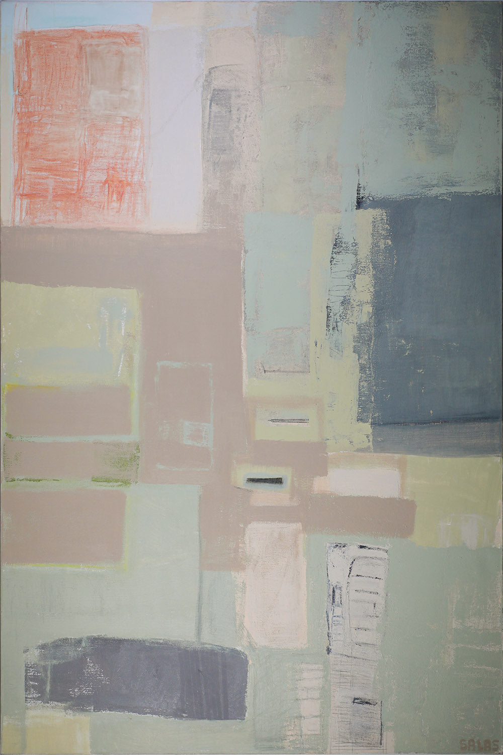 El cuadro es un mapa imaginario que traza paisajes internos, emociones contenidas que tienden puentes entre lo terrenal y lo etéreo.