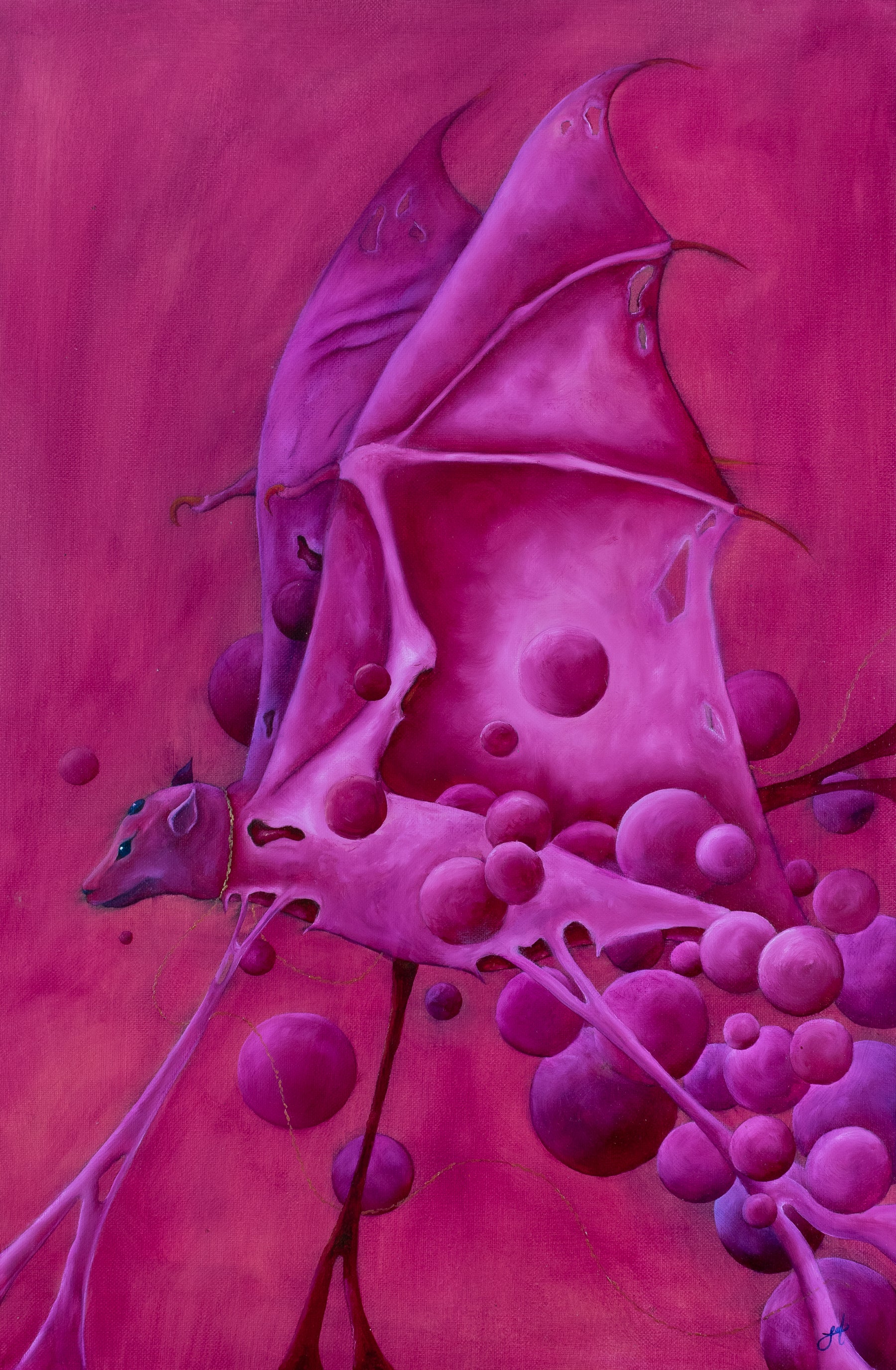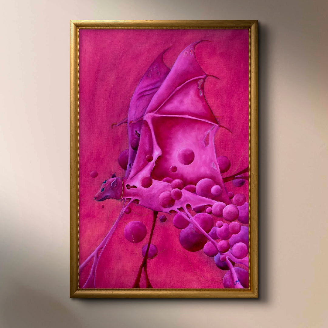 Aves cubiertas en tonos de carne madura, sangre diluida y polvo rosado. No cantan, no vuelan, solo observan, habitan un espacio suspendido entre lo hermoso y lo nostálgico, entre lo que alguna vez fue vivo y lo que ya no puede escapar.