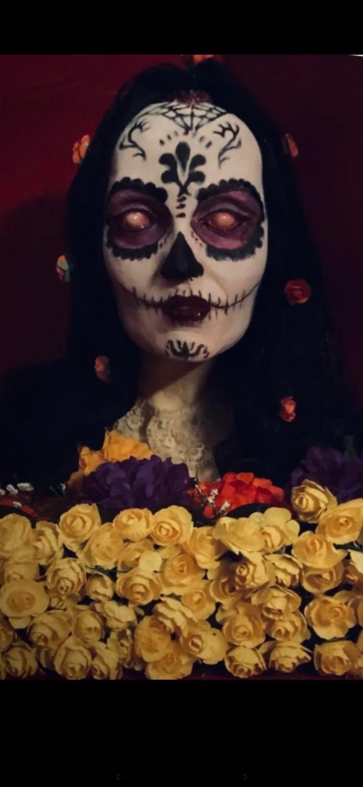 "Catrina" inspirada en las hermosas creaciones de José Guadalupe Posadas. Ella es un recordatorio de nuestra mortalidad y de abrazar la vida. De sus amplios y vivos colores de la tierra y sus flores, la mujer nace para expresar su malestar su malestar sobre esta vacua sociedad. Representa igualmente la tradición de la muerte y el bello "Dia de Muertos" en México.