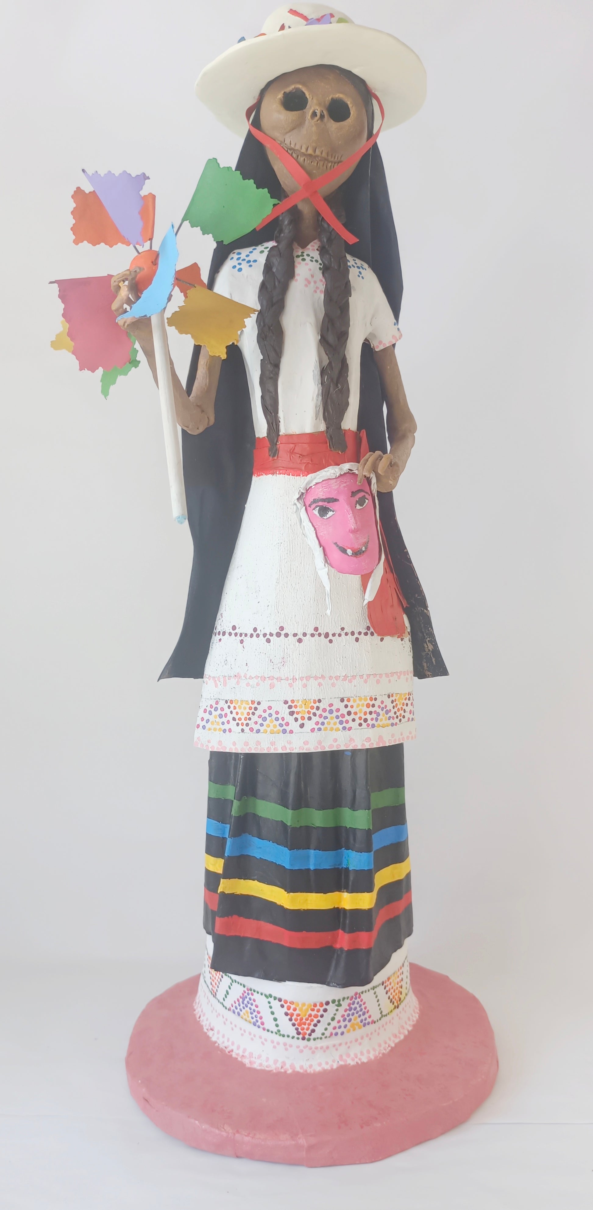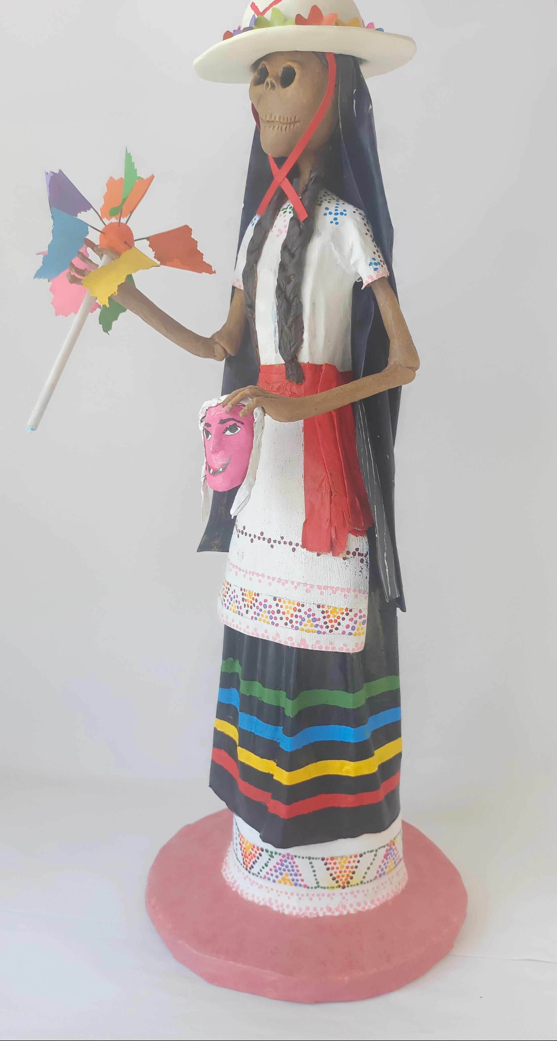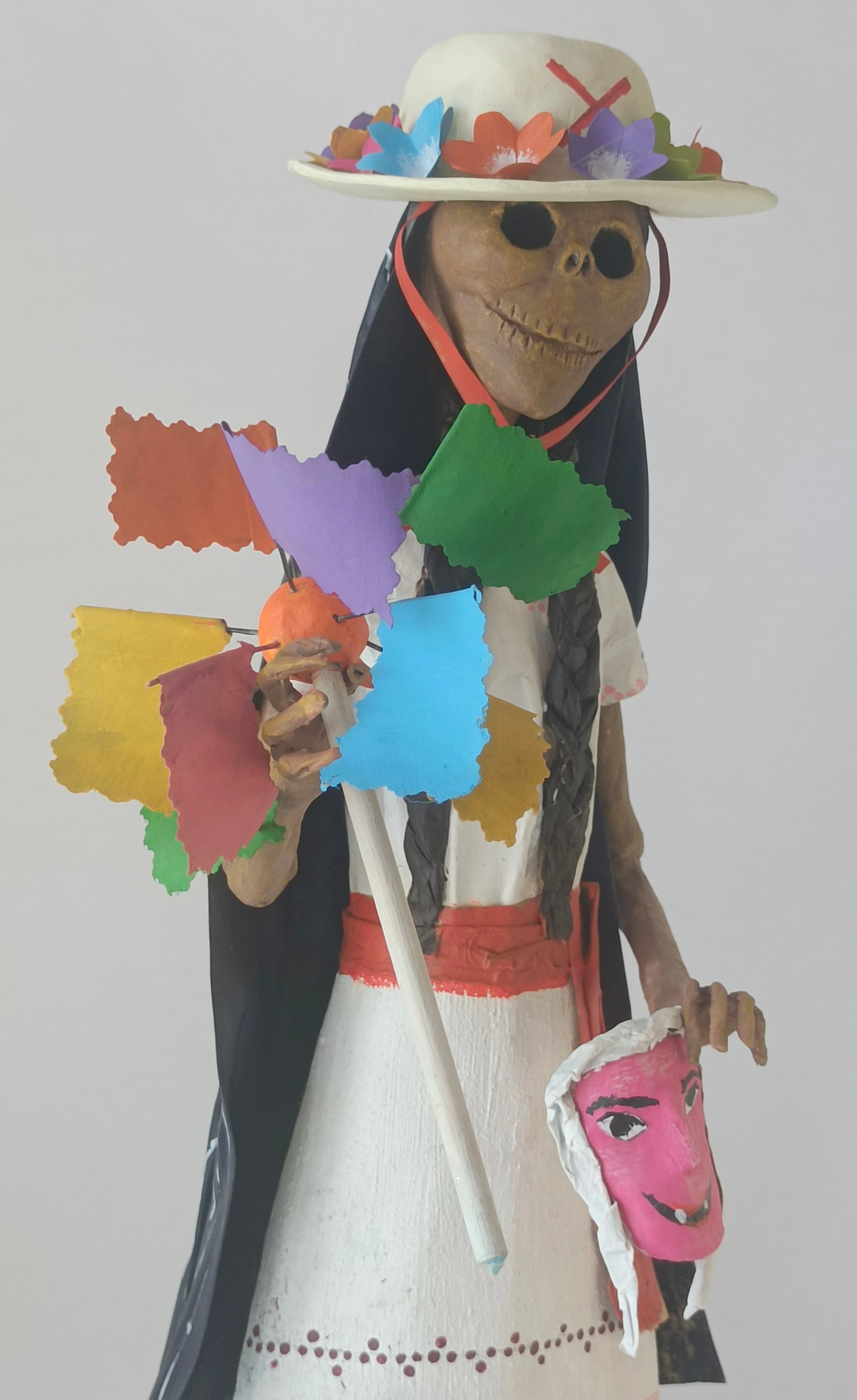 Destaca en esta catrina que se le agrega un sombrero adornado con flores de papel y una mascara de la Danza de los Viejitos, originaria del mismo Michoacán.