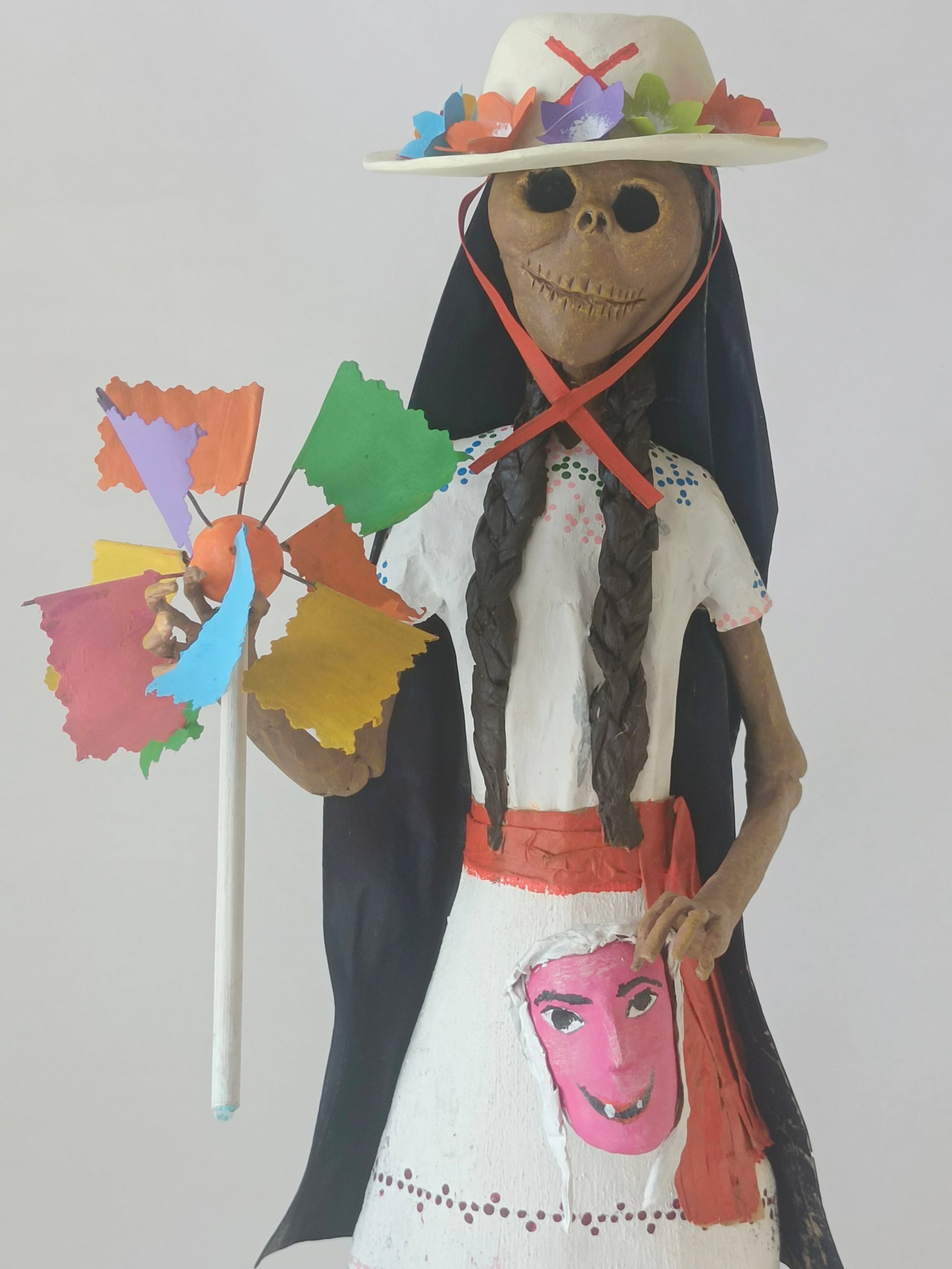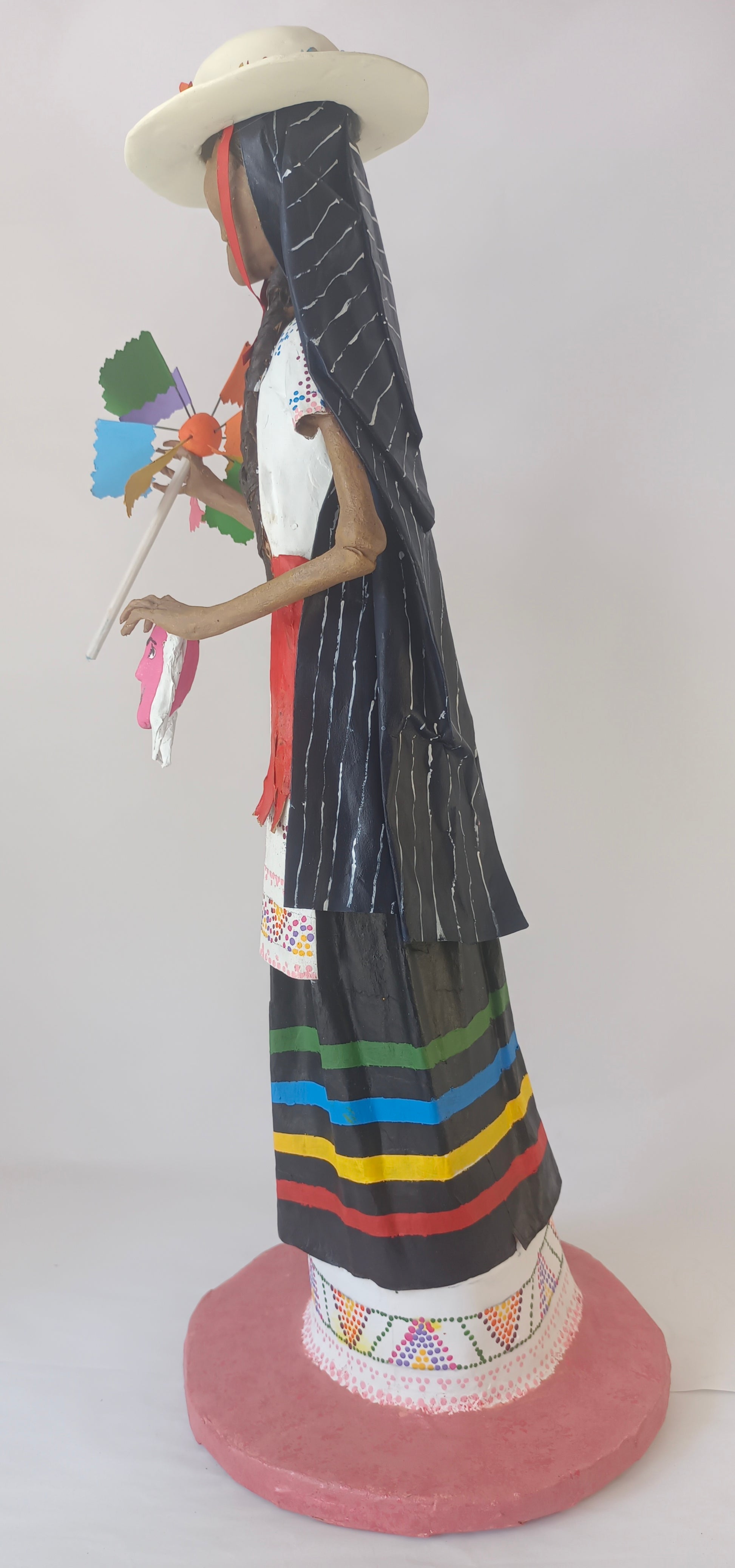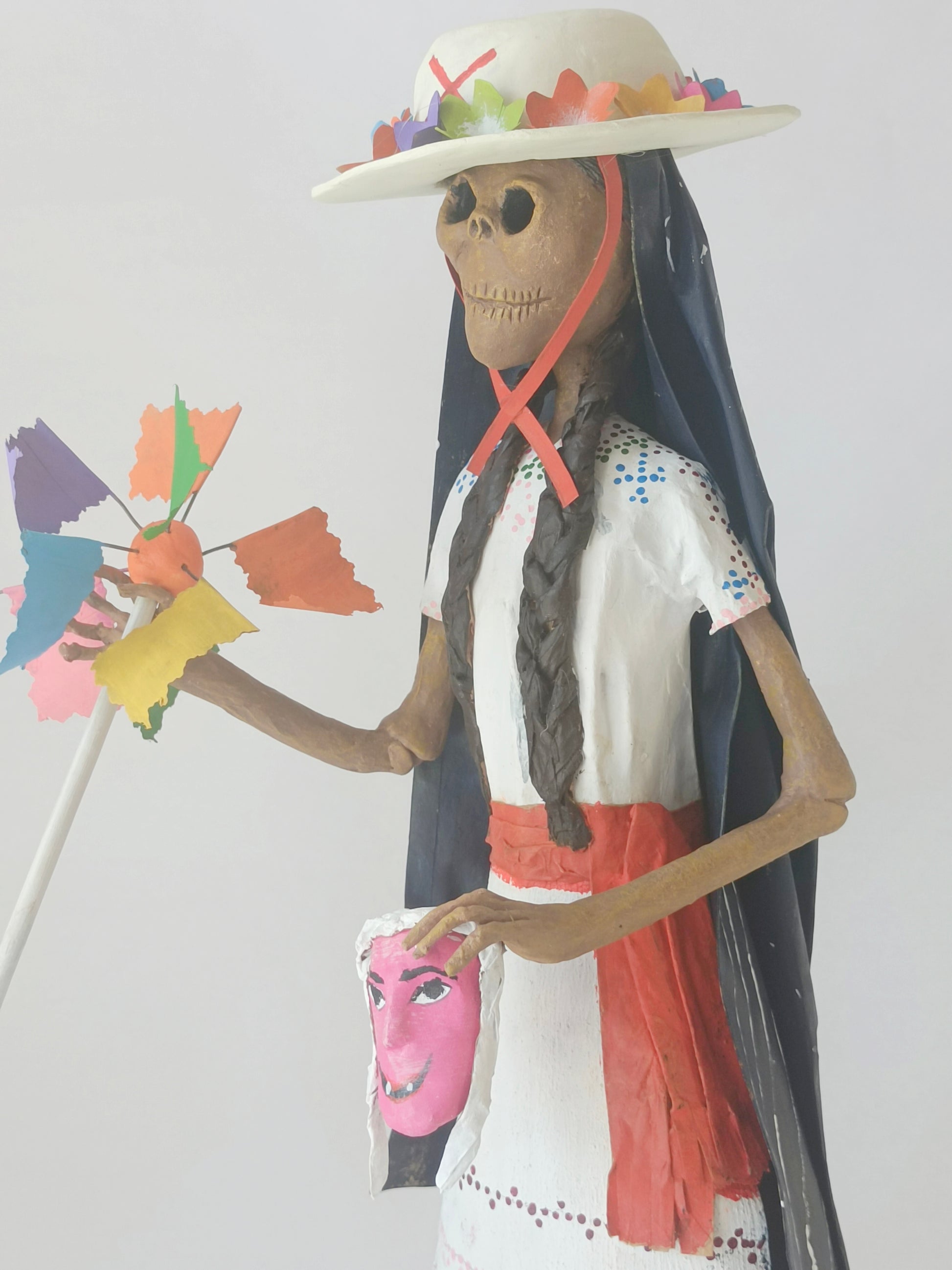 Destaca en esta catrina que se le agrega un sombrero adornado con flores de papel y una mascara de la Danza de los Viejitos, originaria del mismo Michoacán.