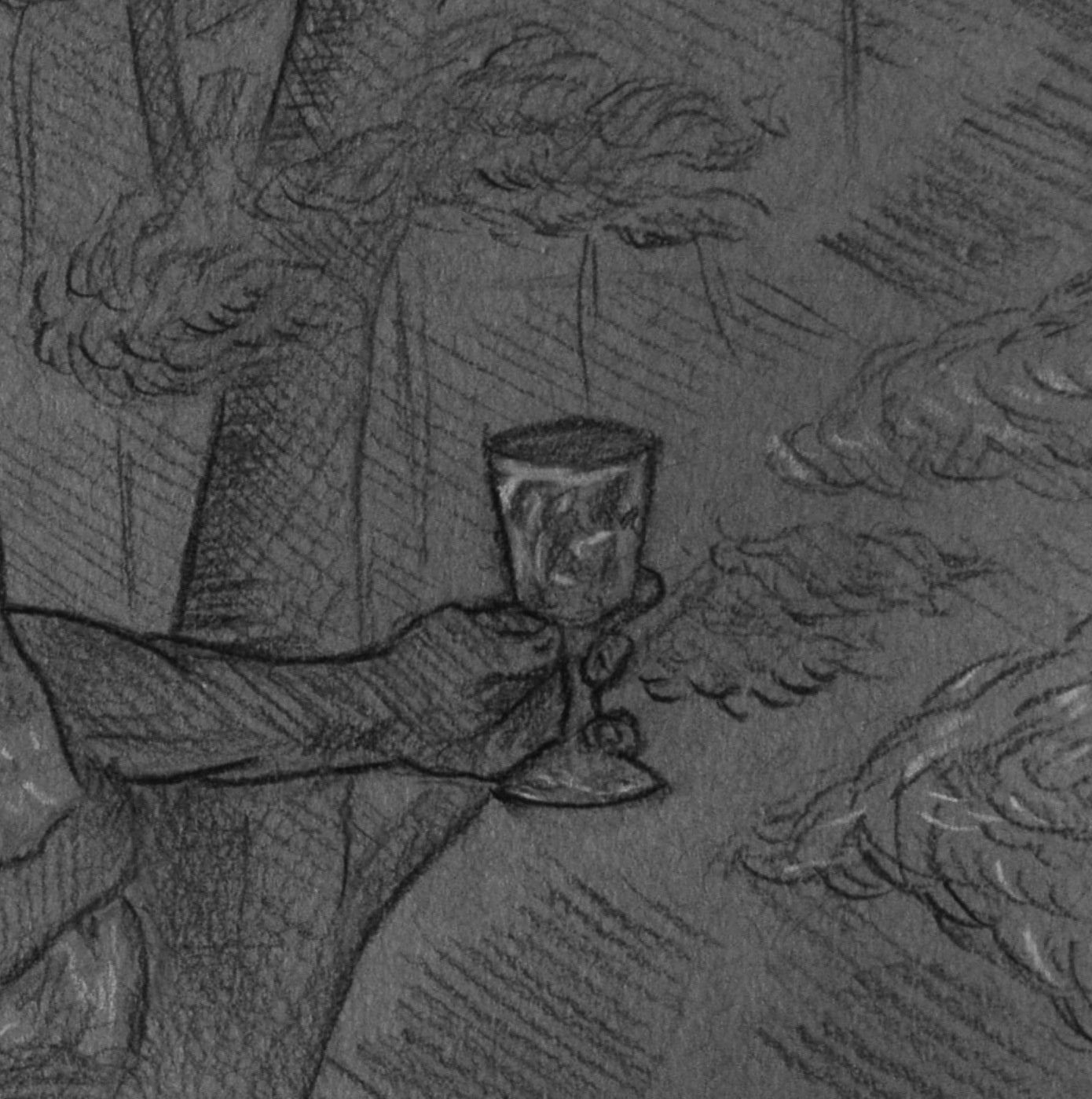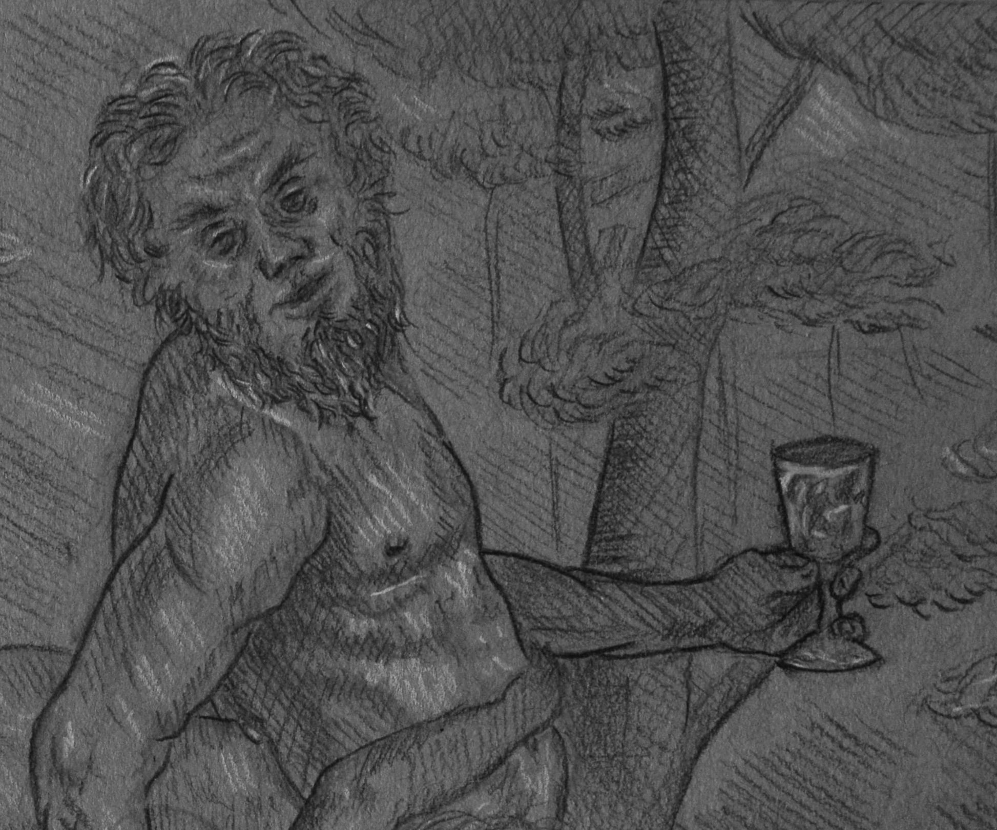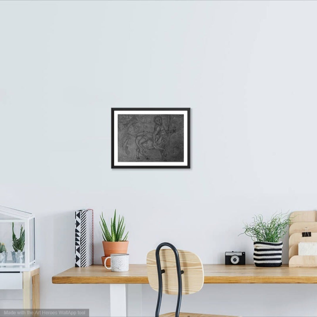 Dibujo de escena mitológica retratando el regreso de un centauro y una ninfa, ambos en estado de ebriedad, regresando de una festividad báquica.
