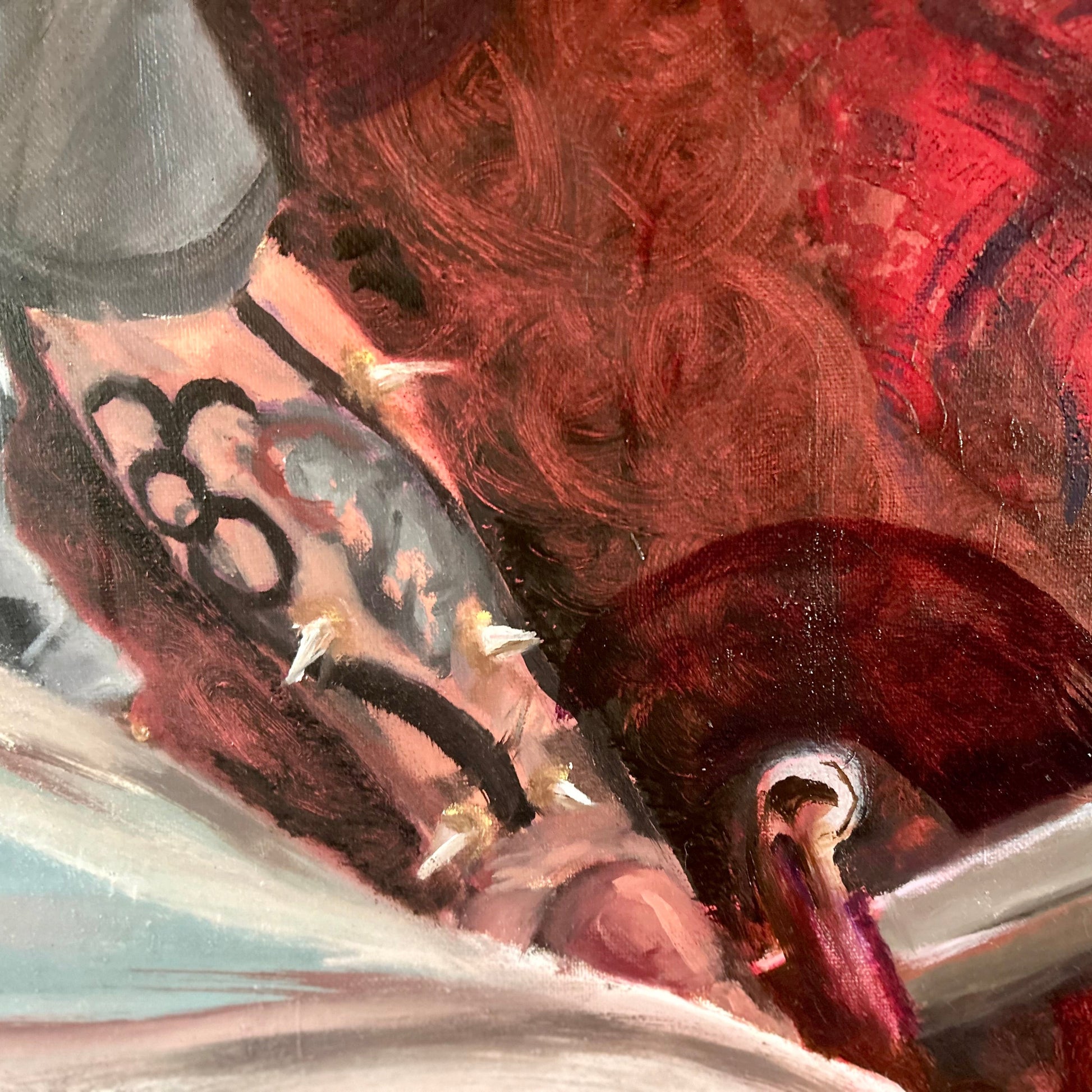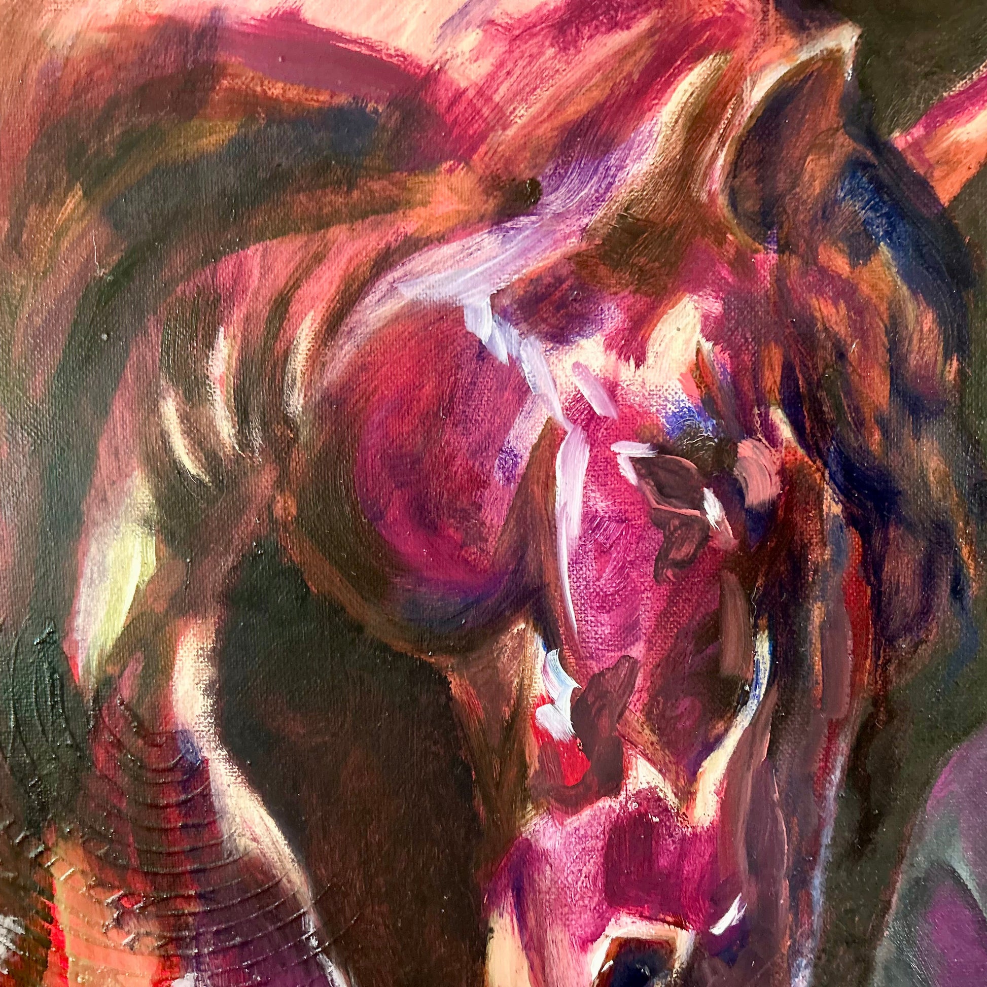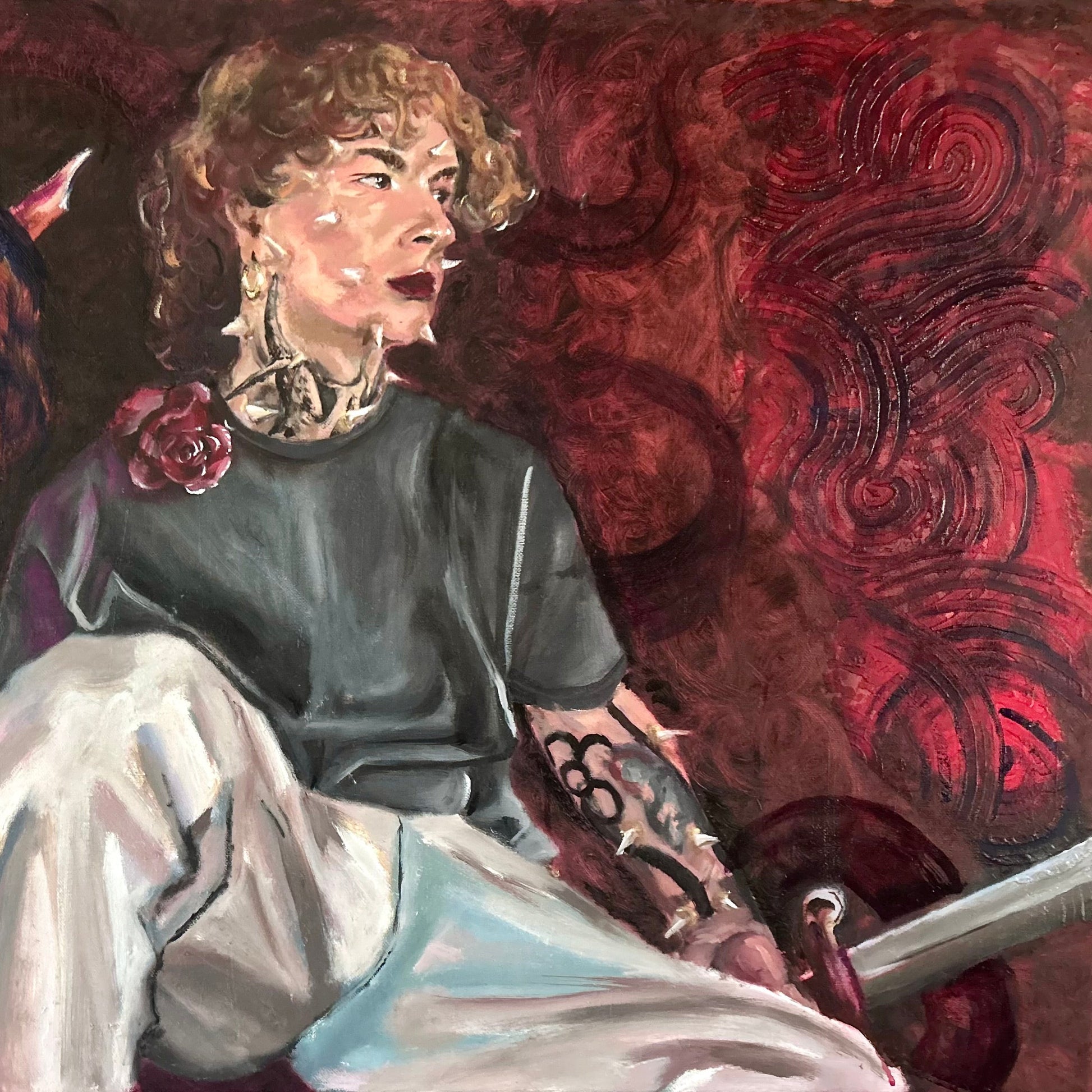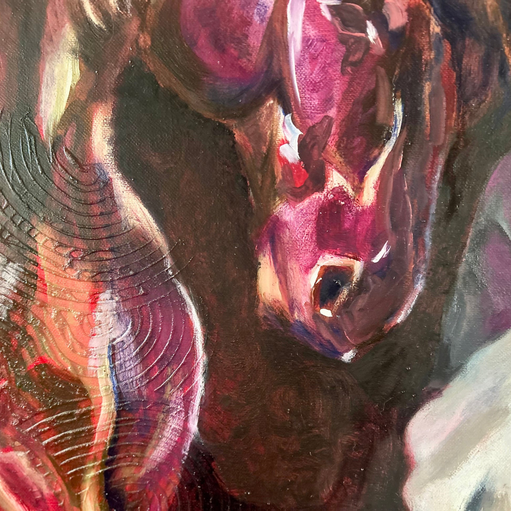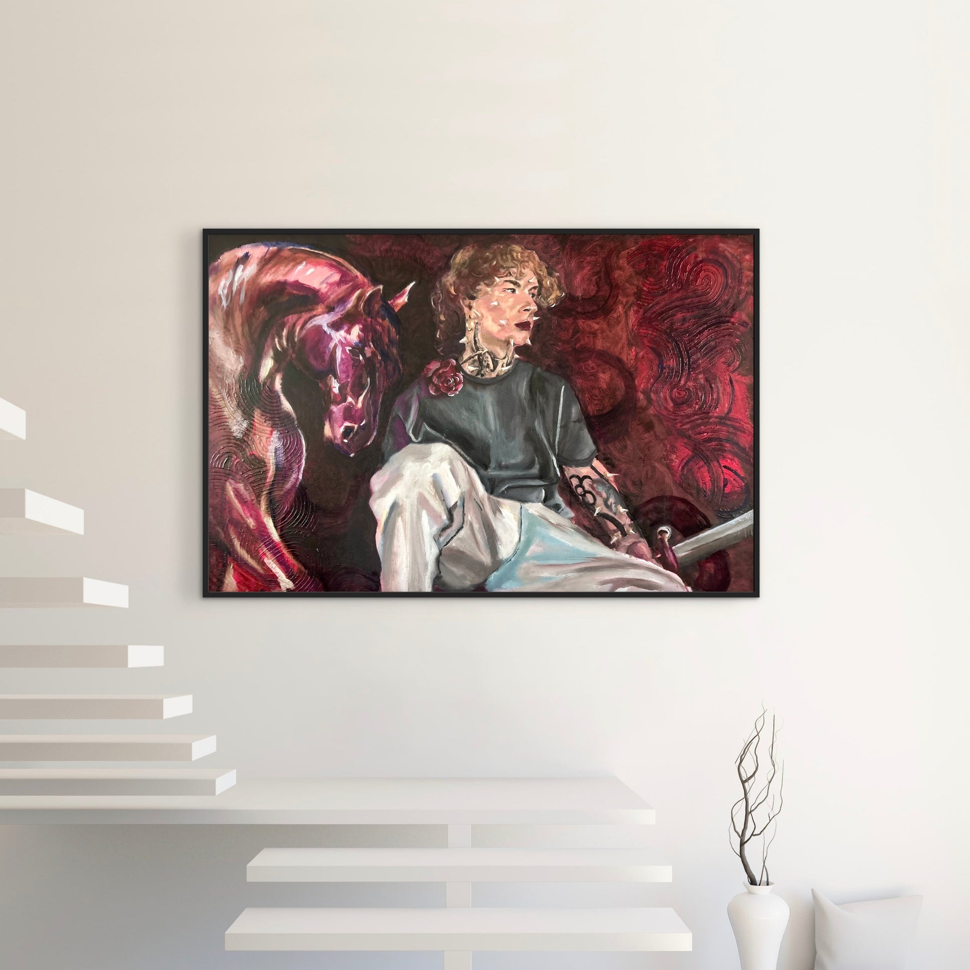 La figura y el caballo conviven en una atmósfera roja que respira tensión emocional, como si ambos compartieran un secreto antiguo. Entre gestos contenidos y miradas que no se encuentran, surge un espacio interior donde la vulnerabilidad y la fuerza se rozan.”