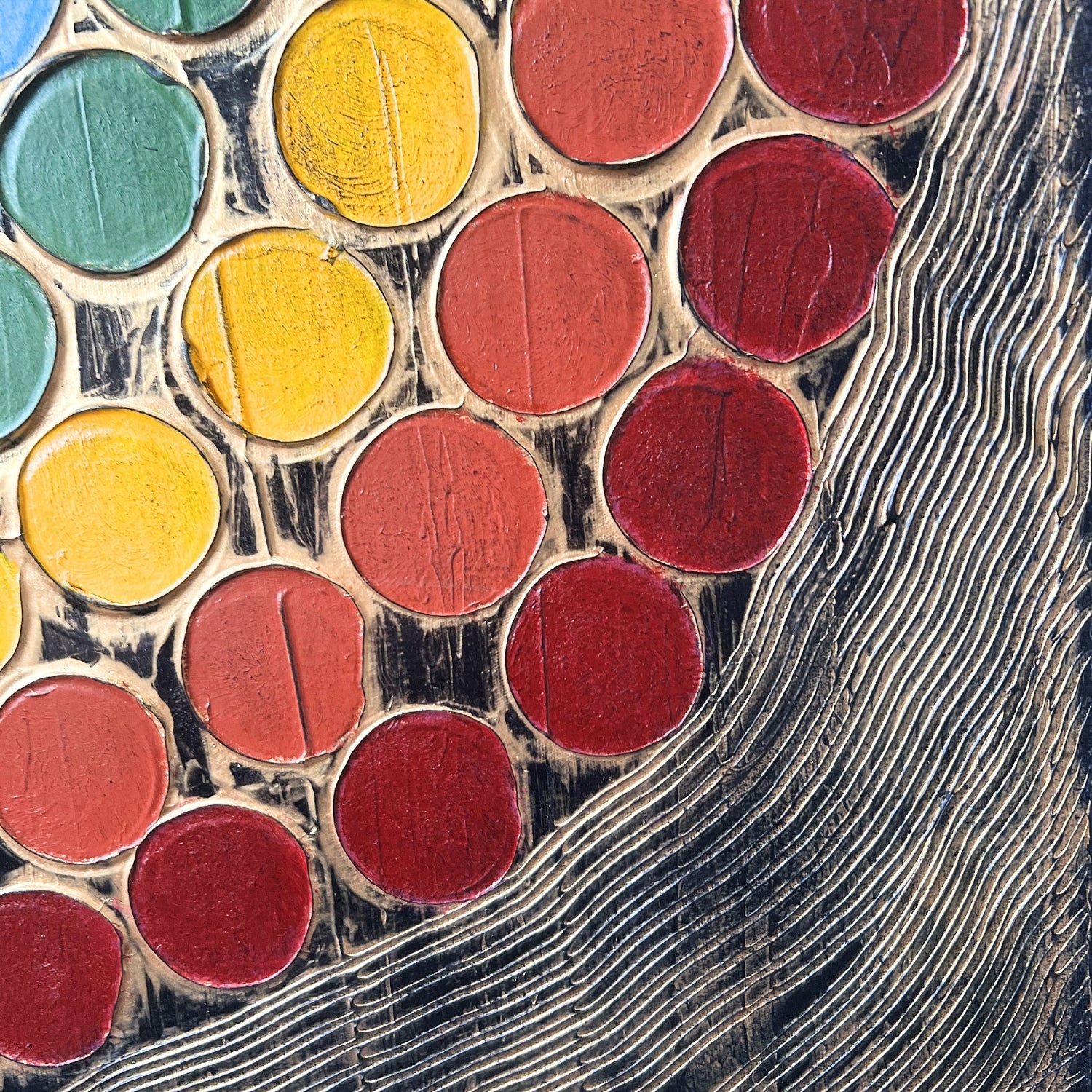 Los hilos de cada color están basados en hilos de cuentas de piedras que uso para engarzar en joyería. Esta obra une mis dos pasiones en la vida: el arte y las joyas.