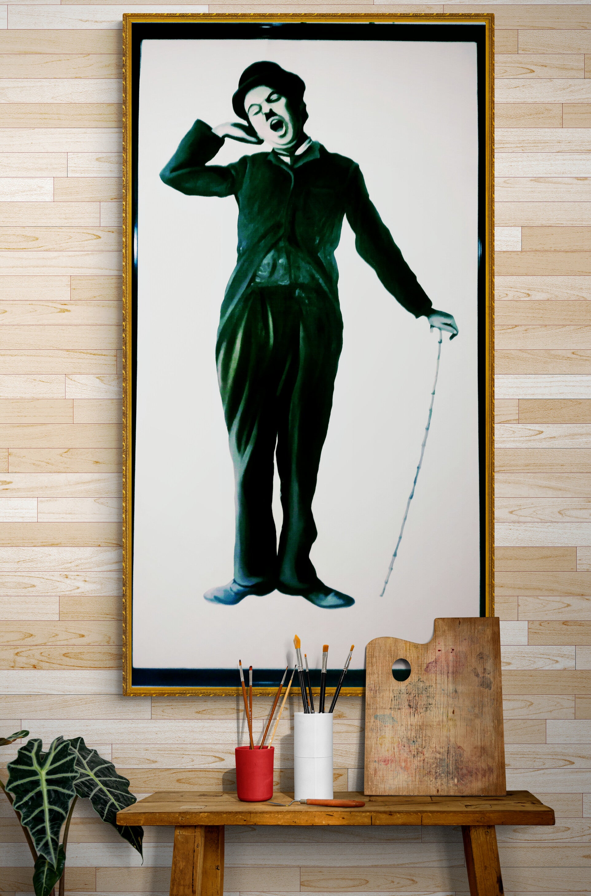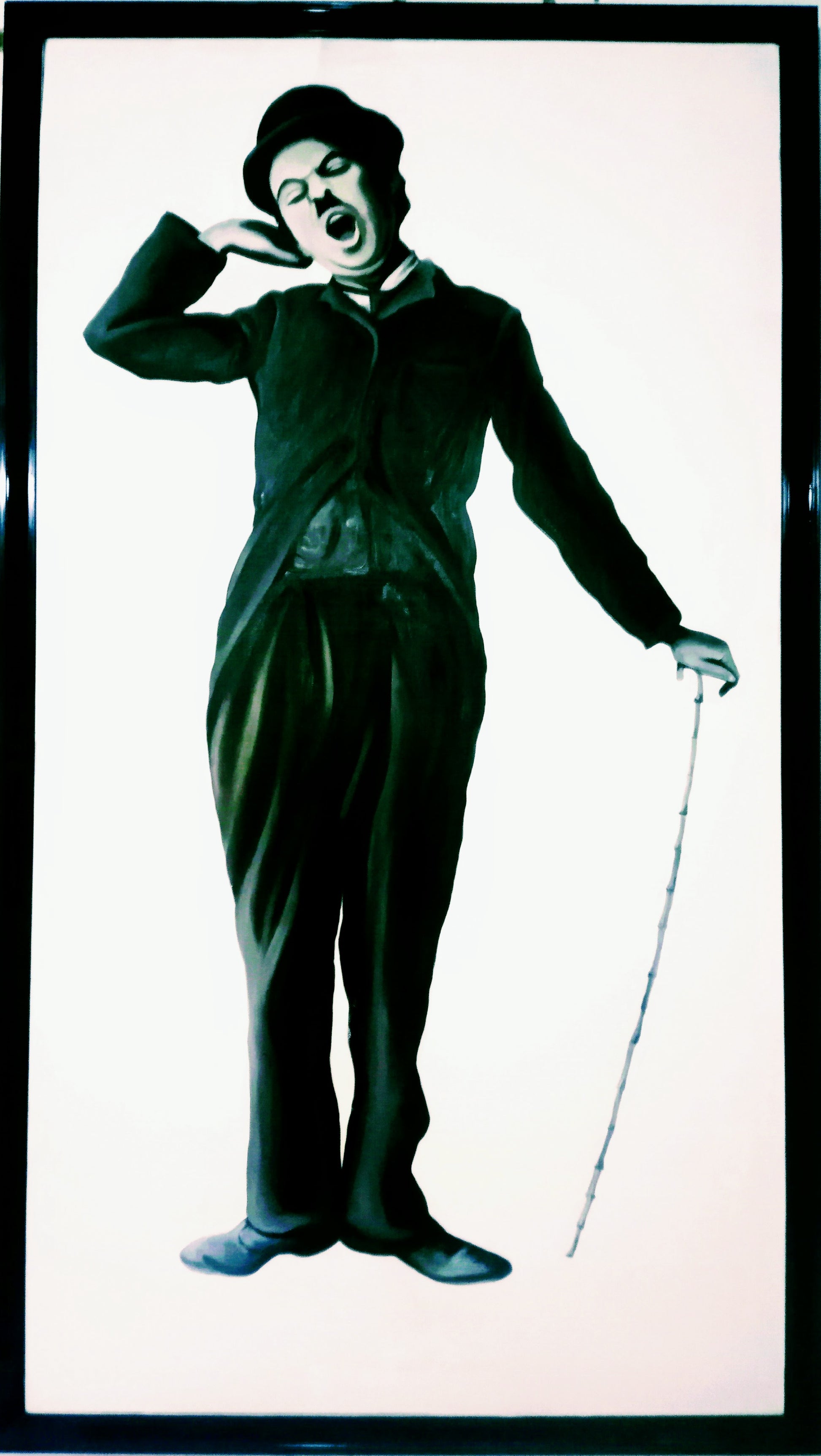 Es una obra en formato grande al óleo, con un estilo figurativo que retrata a Charles Chaplin quien fue pionero en el cine moderno, la obra capta en una de sus expresiones famosas bostezando. Emite un momento de cansancio muy cómico de su personaje.