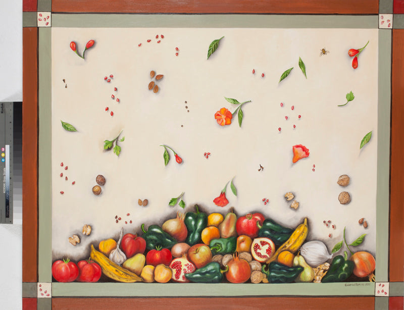 Cada septiembre, los ingredientes del famoso platillo mexicano "Chiles en nogada", se cosechan para crear el más barroco de los manjares: chiles poblanos, nuez de castilla, granada y perejil, creando un platillo inigualable y delicioso, como este cuadro.