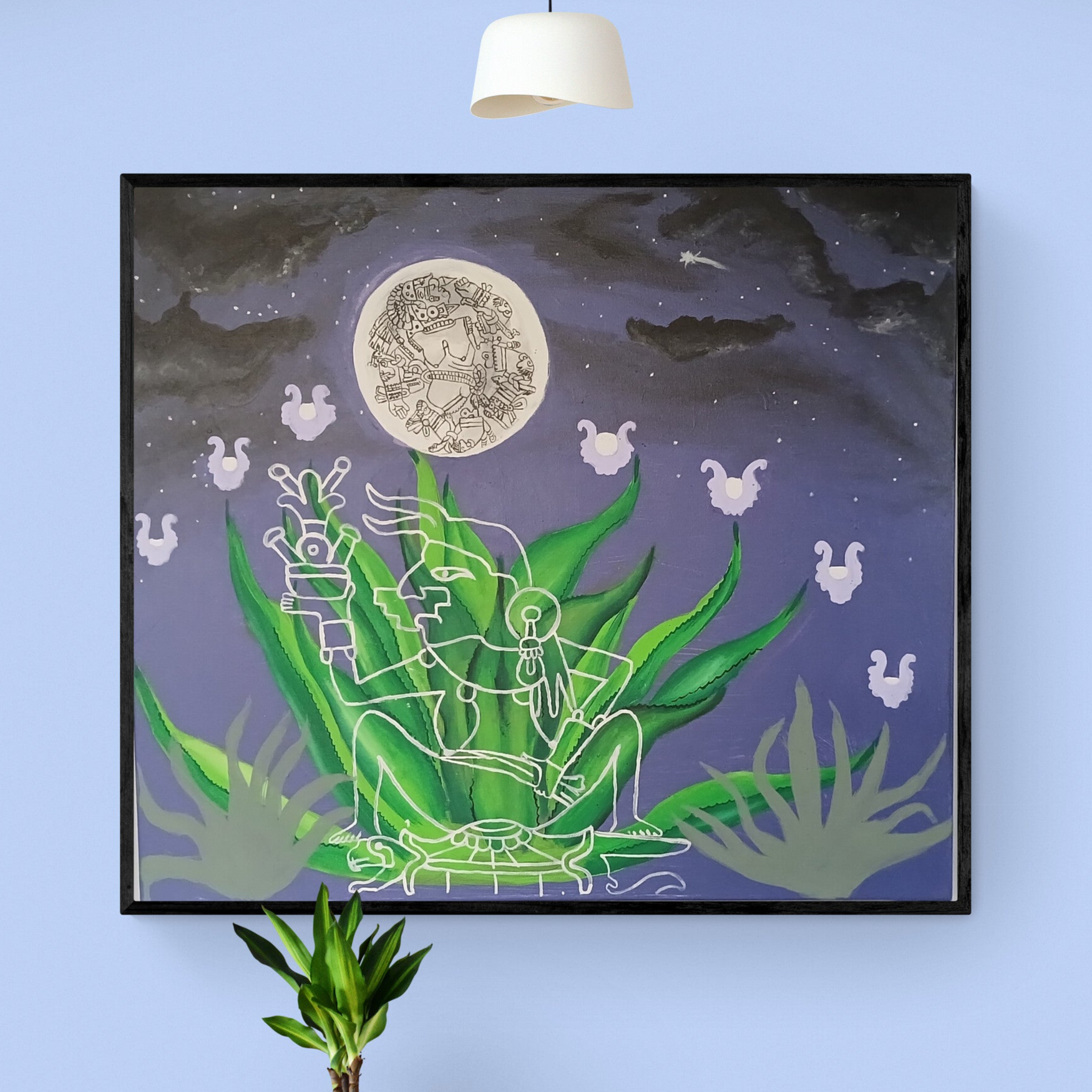 En esta obra representa a dos diosas de la cultura mexicana una de ellas es Coyolxauhqui, la hermana mayor de Huitzilopochtli diosa de la luna ya la diosa del pulque y del maguey Mayahuel. Las dos diosas esta representadas con la luna y el maguey también están presentes como lo representan los códices. Los garros qué se encuentran al rededor de la luna y del maguey es la representa de la bebida extraída del maguey llamada pulque, en los garros representan los ciclo de la luna con el pulque los mexicas creían que la luna se llenaba con pulque cada garrito tiene un ciclo de la luna hasta que tomará su forma de luna llena.