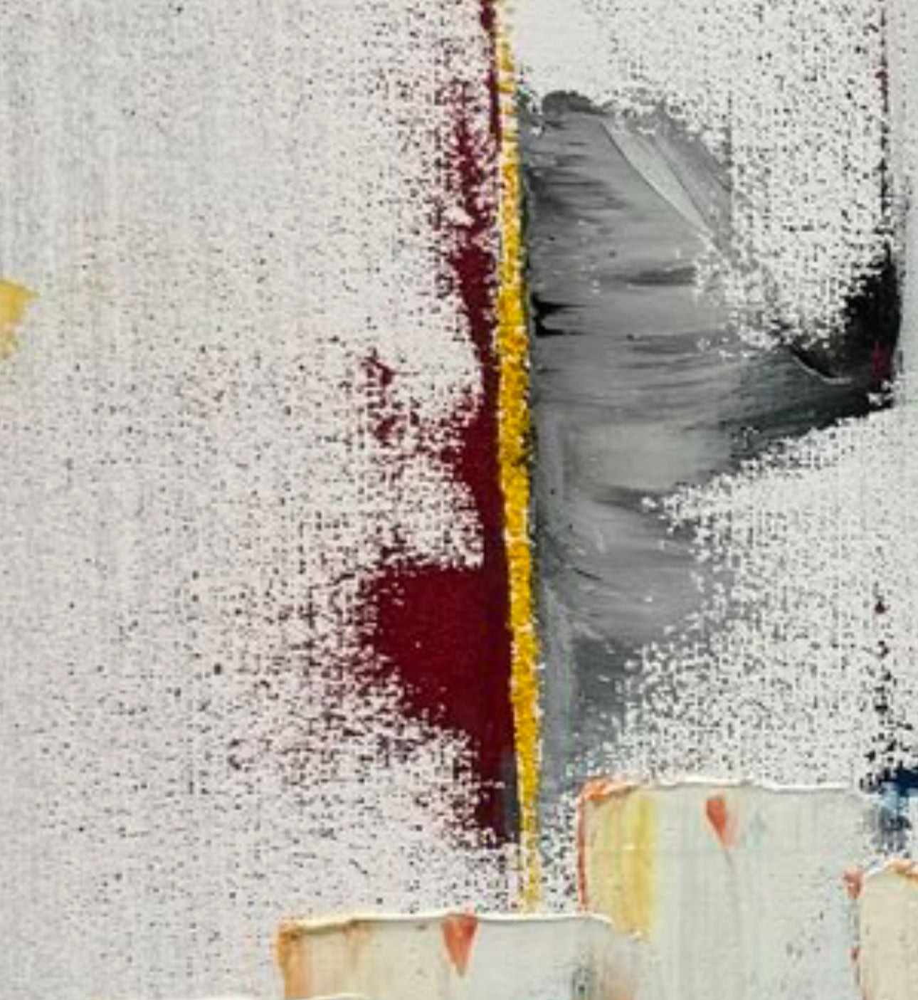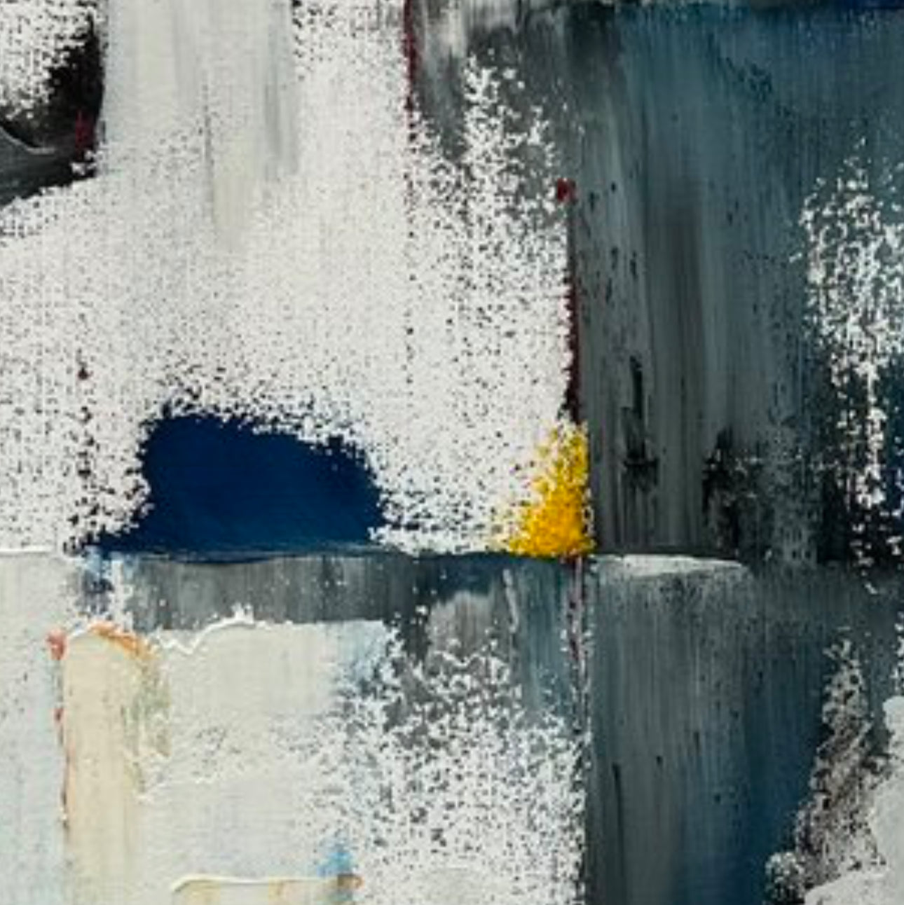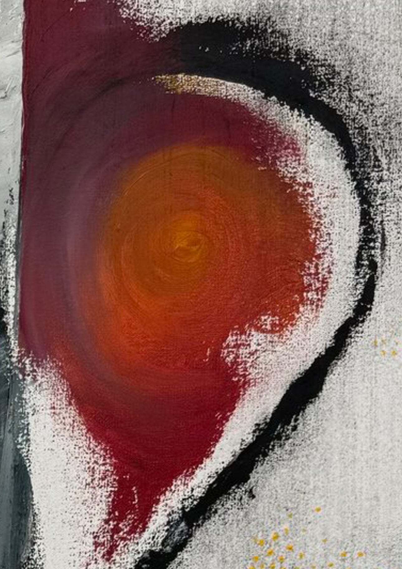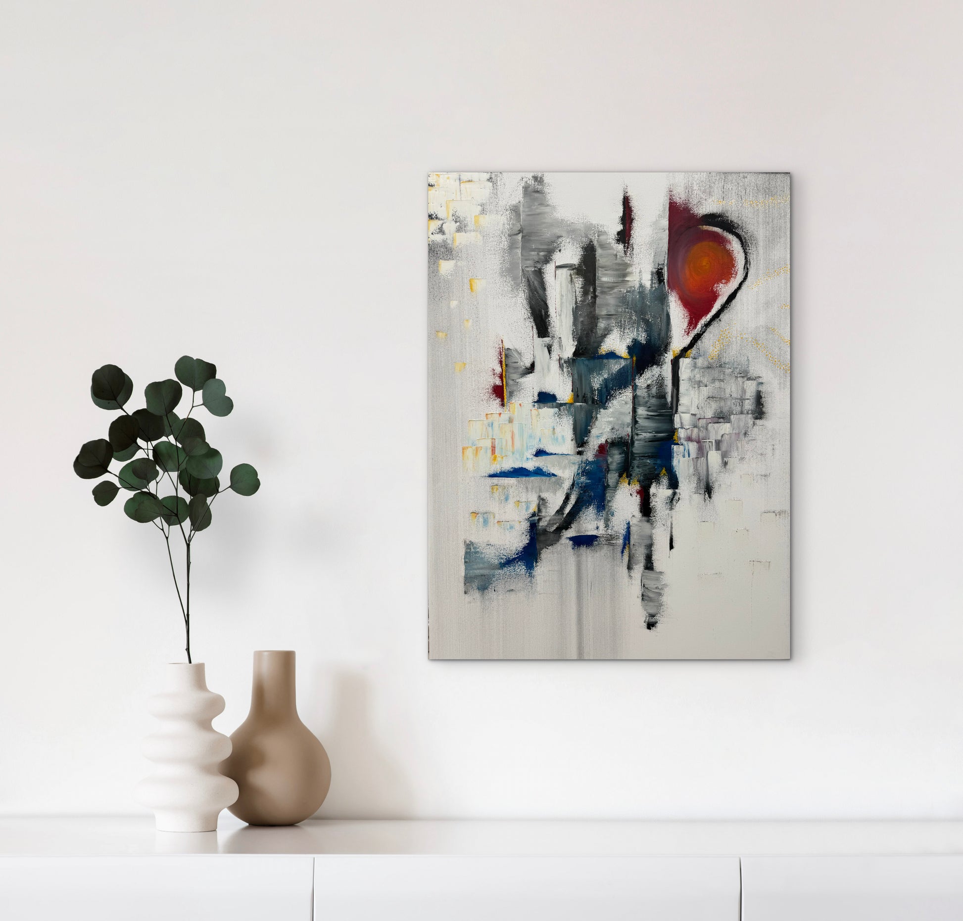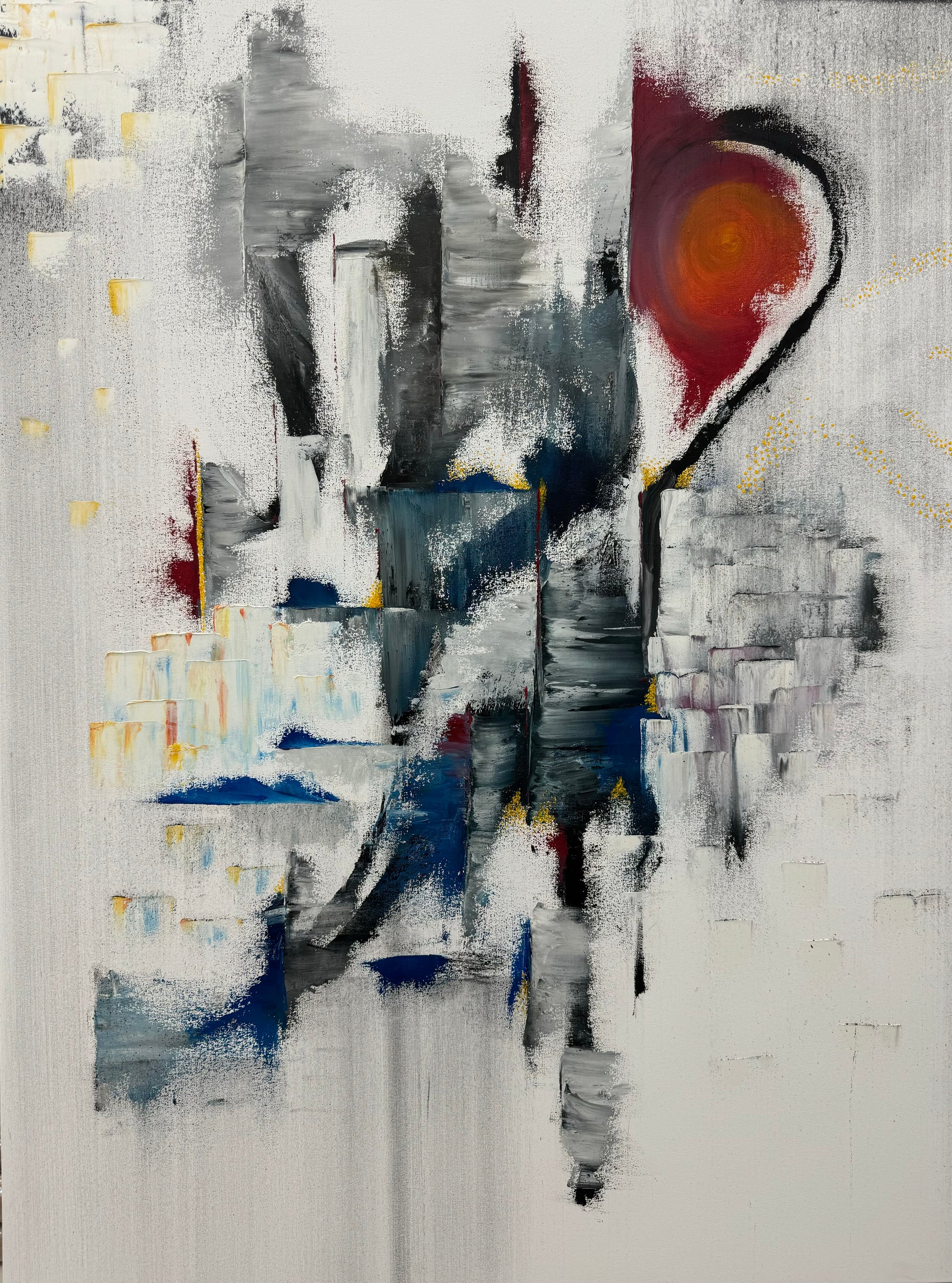 "City at dusk" Es una obra abstracta con una composición que parte de la geometría. Utiliza una textura que incorpora colores con tonos suaves en el exterior y se intensifican al acercarse al centro. Es una mezcla de tonos fríos y el único punto incandescente es una espiral simulando un medio corazón que pareciera iluminar el resto de la obra.