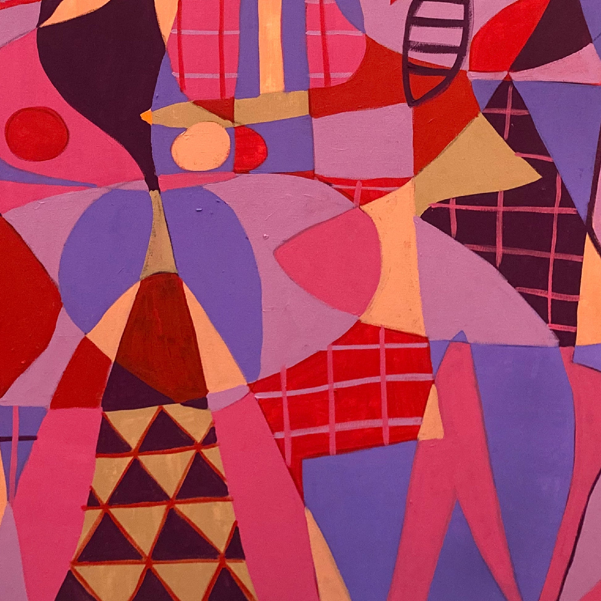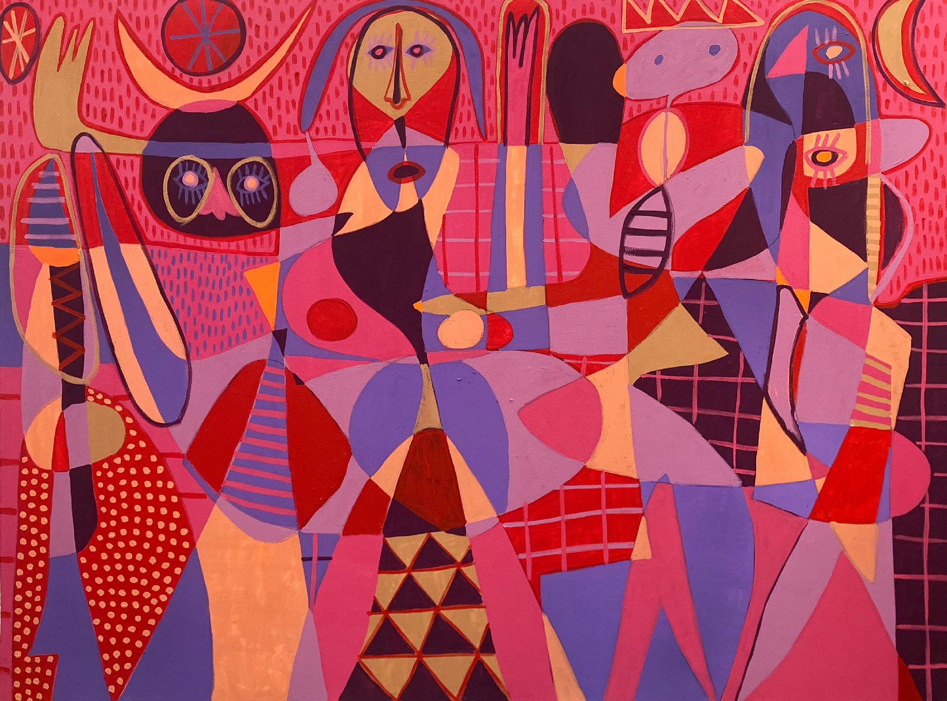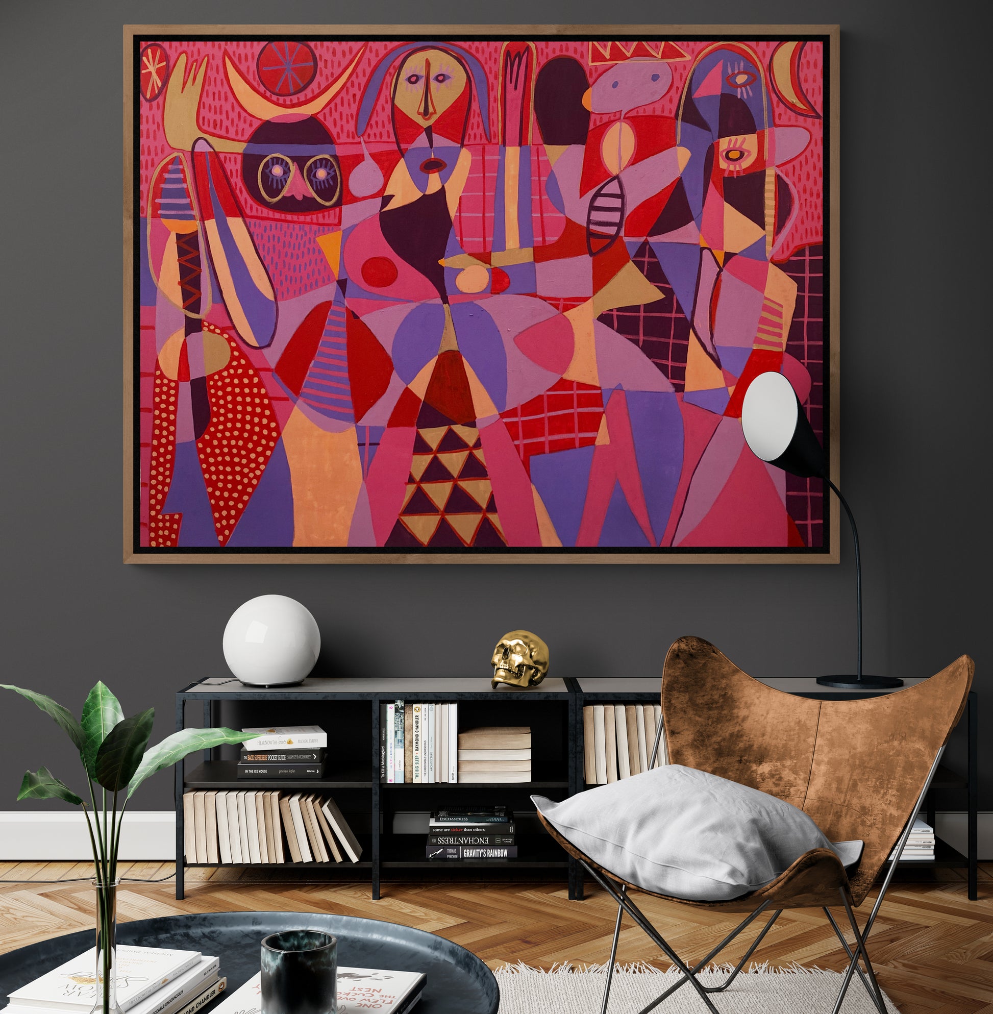 La escena representada no obedece a ningún canon narrativo. Más bien, se trata de un sistema visual autónomo, un ecosistema simbólico que surge del color, la composición y la repetición. La influencia de las máscaras mexicanas no es decorativa, sino estructural. Sirve como punto de partida para construir caracteres vibrantes que sintetizan historia y juego. La pintura no imita, sino que interpreta: genera una versión abstracta de lo culturalmente reconocible, resignificándolo a través del expresionismo abstracto lúdico.