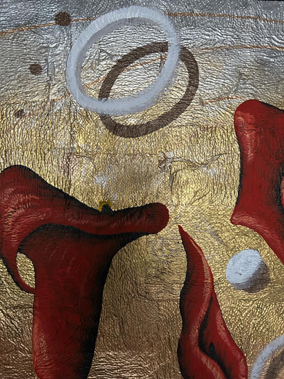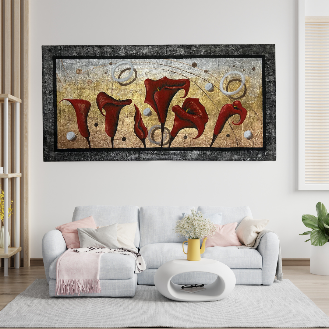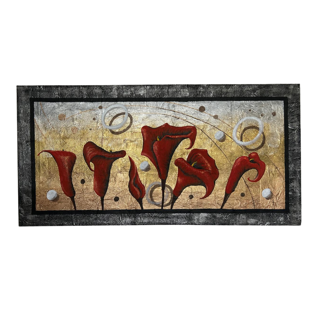 Cada pincelada de óleos y acrílicos se fusiona para crear un paisaje floral onírico, donde los colores profundos y las formas etéreas bailan en la penumbra. Las texturas sutiles invitan al tacto, añadiendo una dimensión sensorial a la pieza, mientras que los destellos metálicos capturan la luz de manera magistral, simulando el brillo de las estrellas o el rocío en los pétalos.