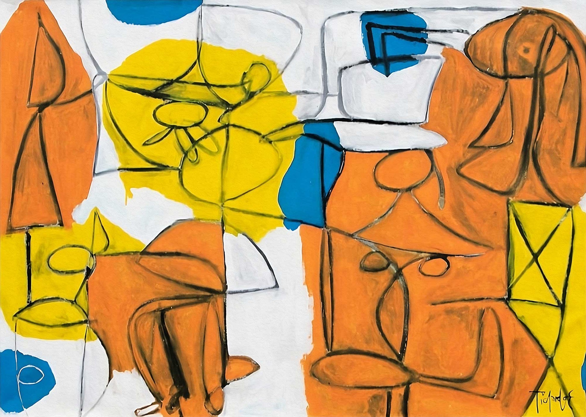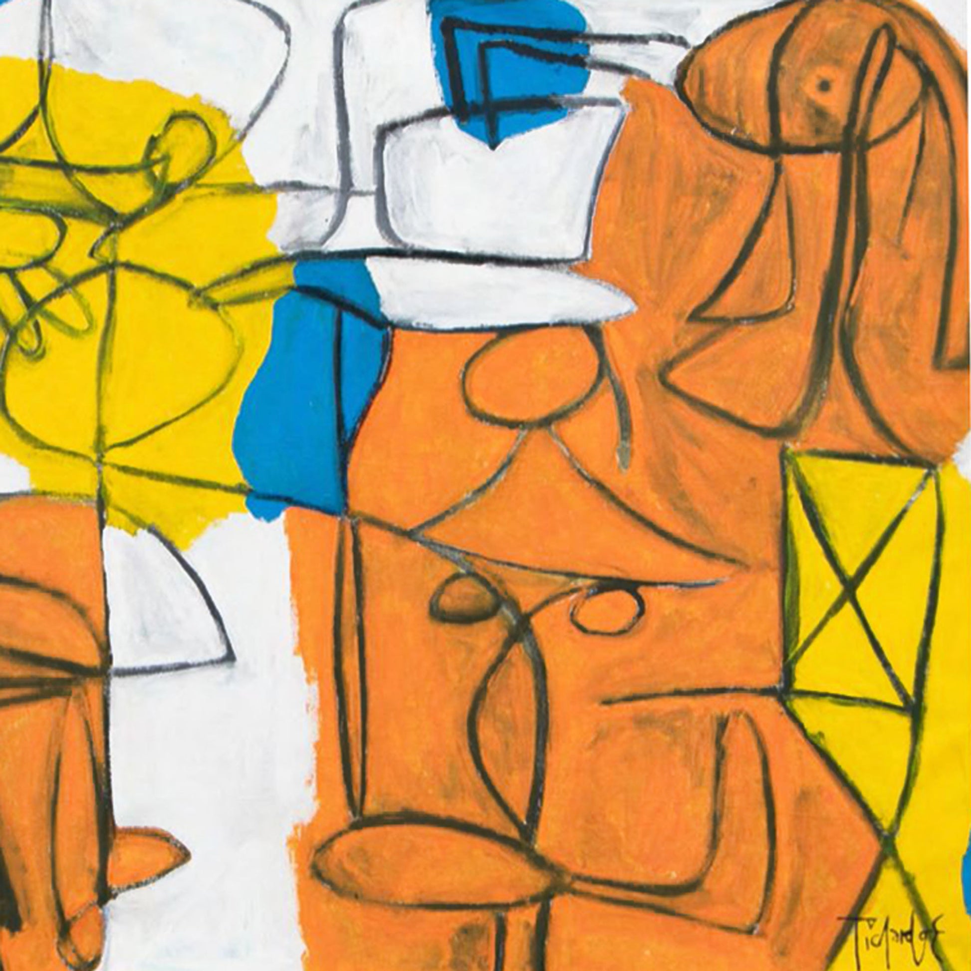 Clase de danza creación de Enrique Pichardo presenta una escena vibrante construida mediante tres figuras delineadas por contornos negros que se mueven dentro de una paleta dominada por blanco, amarillo, azul y naranja. Ejecutada en acrílico sobre tela en un formato de 120 × 80 cm, la composición fluye con dinamismo y equilibrio, revelando un lenguaje que oscila entre la abstracción y la figura, cargado de vitalidad gestual y energía espontánea.