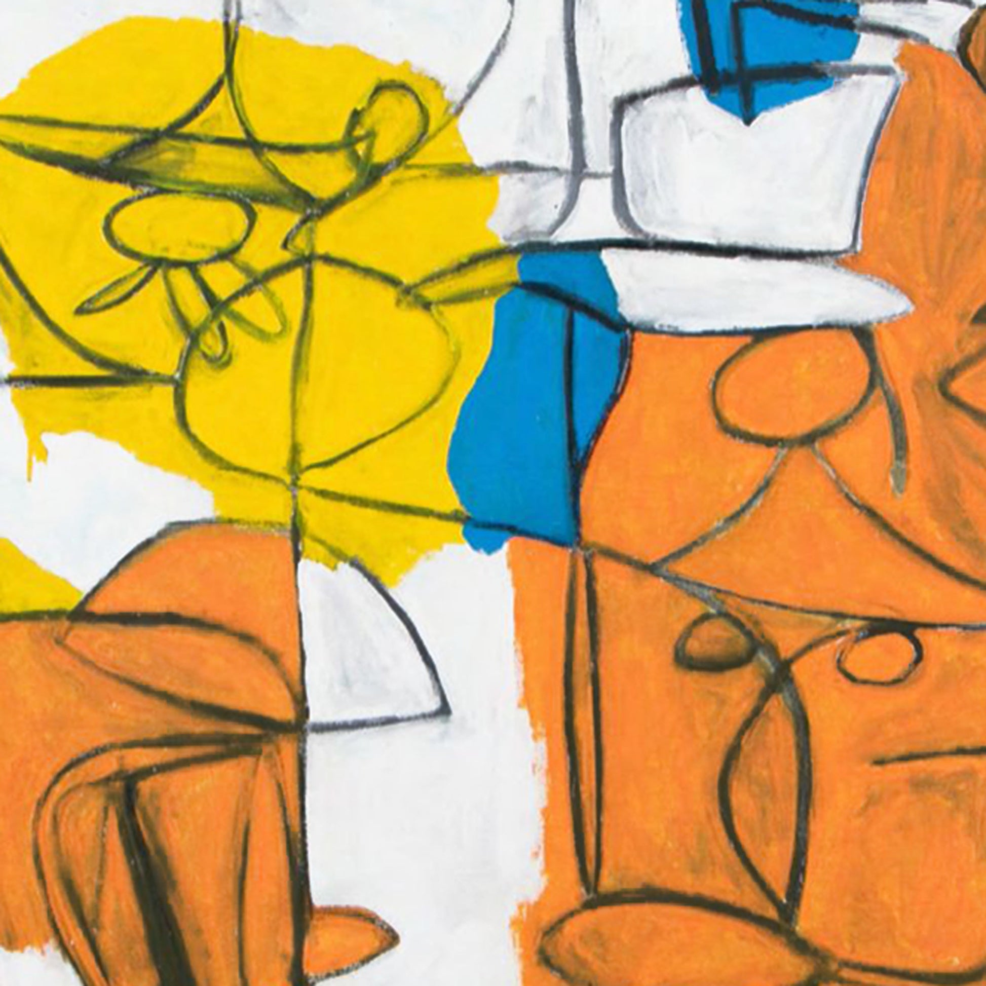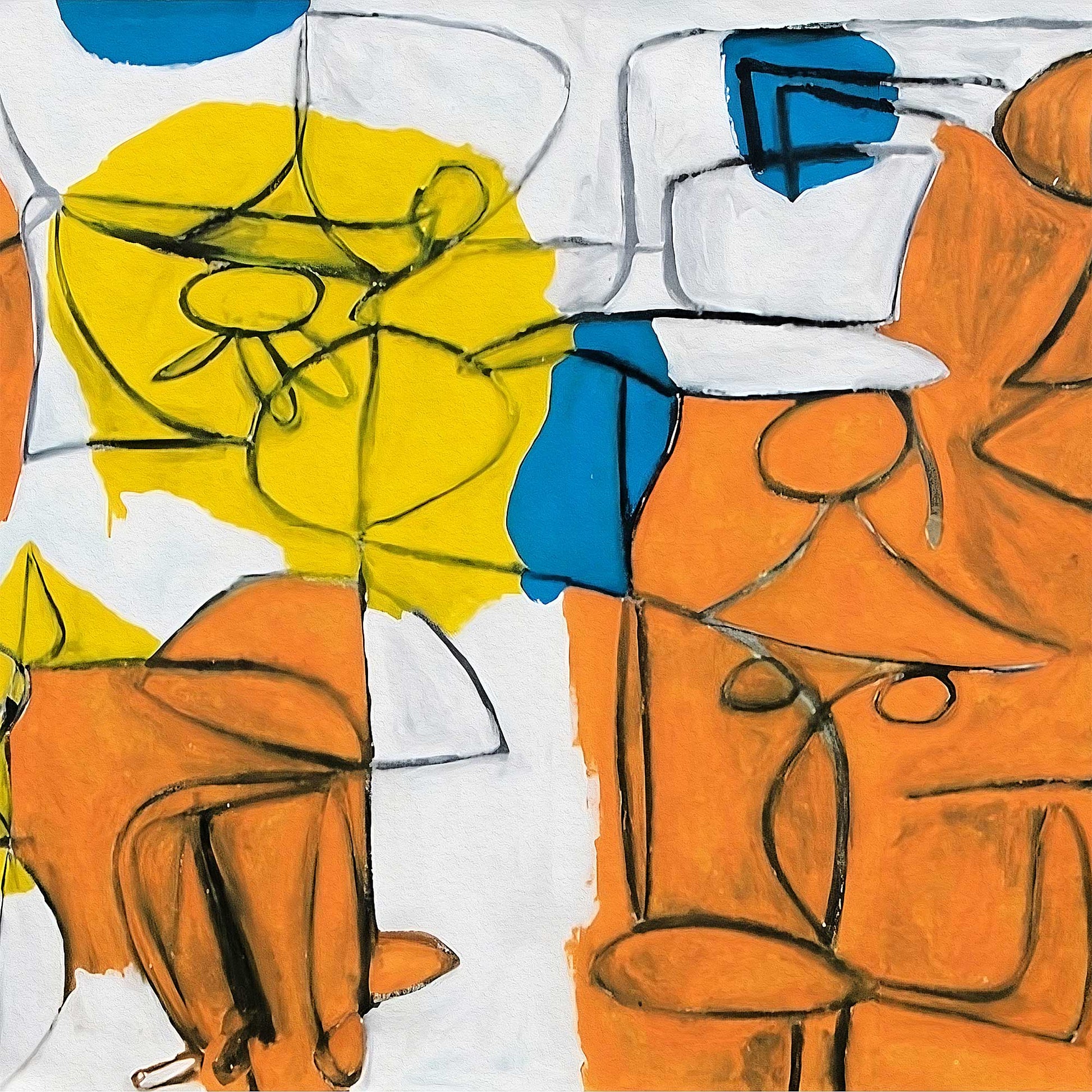 Las formas orgánicas y los trazos firmes mantienen una interacción constante que sugiere pasos, ritmo y sincronía. El contraste entre el blanco y los acentos cálidos y fríos genera armonía visual, mientras que la distribución de las áreas de color aporta estructura y profundidad. La estética se acerca al expresionismo contemporáneo, evocando ecos de artistas como Jean-Michel Basquiat y Karel Appel, sin perder la identidad lúdica y personal que caracteriza la obra de Pichardo.