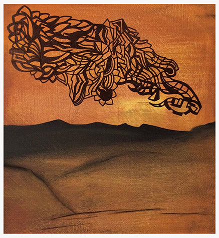 Esta obra representa el espectáculo mítico de los seres yacentes en mente humana. Una historia subjetiva que adquiere, de origen, carácter de verdad fragmentada, dentro de la realidad simbólica. Paisaje desértico, carente de raíces, donde el paseante, caminante en un amplio espacio energético, cruza umbrales y atestigua manifestaciones de seres encarnados, en promesas de un tiempo en constante movimiento. Obra firmada, sin marco.