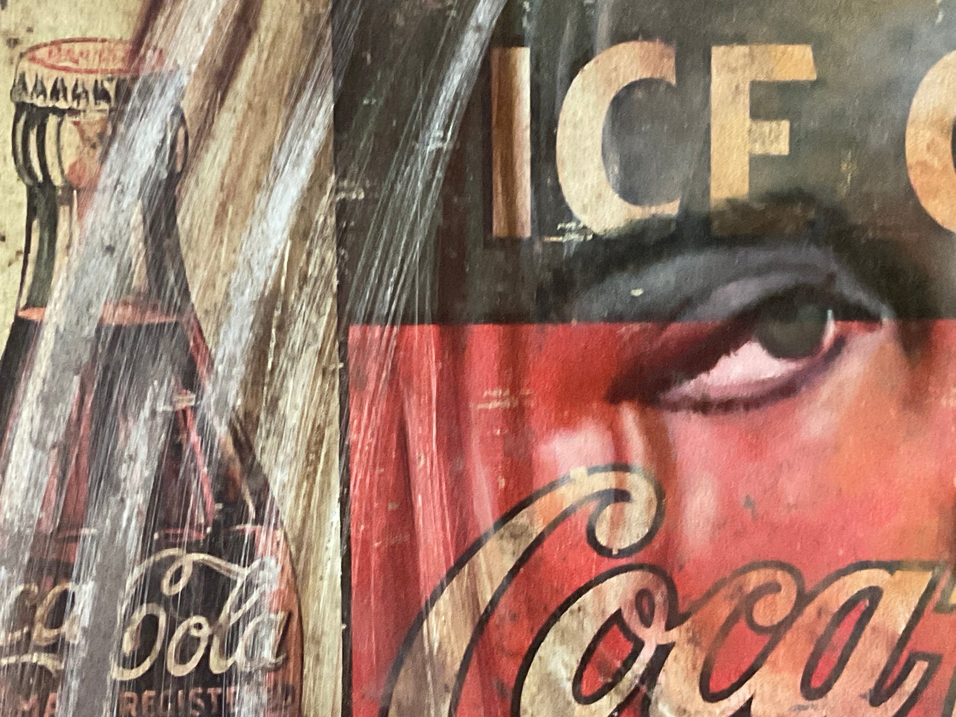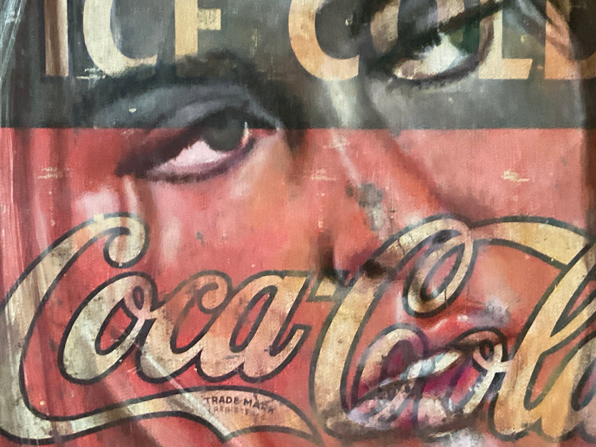 Me emociona las oportunidades, y ahora me llegó esto. Un viejo panel de propaganda de la marca Coca-Cola, directamente rescatado de la selva, de entre mucha basura es en donde hago el retrato de un artista del porno; combinado la sensualidad, la mercadotecnia, el sexo y la basura resultando esta pieza de obvio sentido aunque diversas evocaciones.