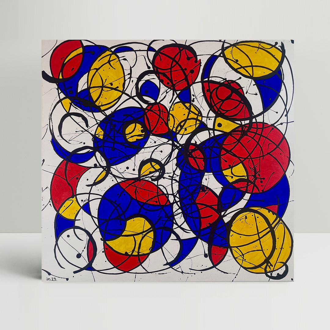 Es un lienzo abstracto de gran energía. Presenta una superposición dinámica de círculos en colores primarios (rojo, azul y amarillo), con líneas negras que sugieren movimiento y caos controlado. Una obra vibrante y moderna.