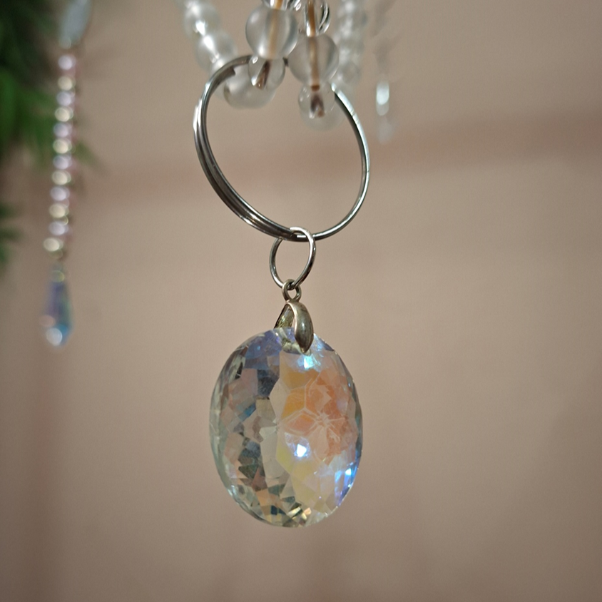 Del aro cuelgan tiras con dichas cuentitas haciendo "columpios" a su alrededor. También cuelgan tiras de cuentas esféricas de cristal de las cuales pende un bello dije de cristal en forma de disco. La función de este adorno es que cuando recibe los rayos del sol, lucecitas con los colores del arcoíris se reflejan sutilmente a su alrededor, dando un sentimiento de relax. Ideal para embellecer balcones, nichos, ventanales, árboles, pasillos, entradas de casa, etc. Ilumina tu casa con este bello atrapasol.