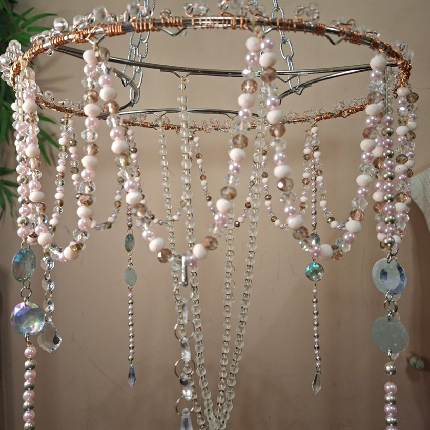 Delicado atrapasol plateado con tirantes de cadena plateada y perlitas sintéticas rosa claro, cuentitas de cristal facetado en tonos café claro e incoloro enrollados cuidadosamente a la estructura con hilo de cobre 99% pureza.