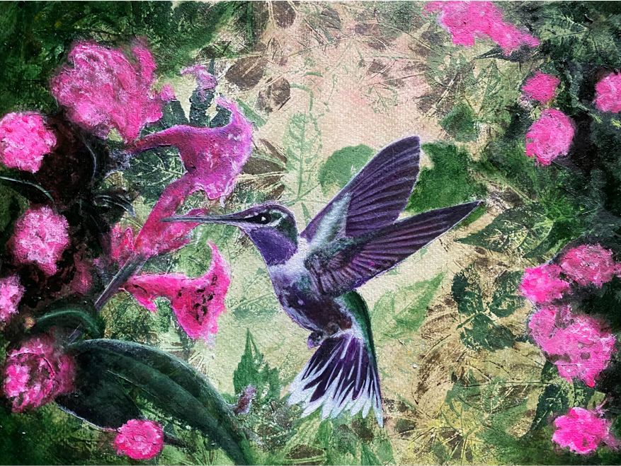 Lo que motiva esta serie es la amalgama entre la impresión colorida de hojas frescas y la transferencia de imágenes de aves; con lo que pretendo reproducir la magia de la naturaleza en el papel o el lienzo y trasladarla a la mirada de quien decida tener a su alcance cotidiano un pedacito de realidad.