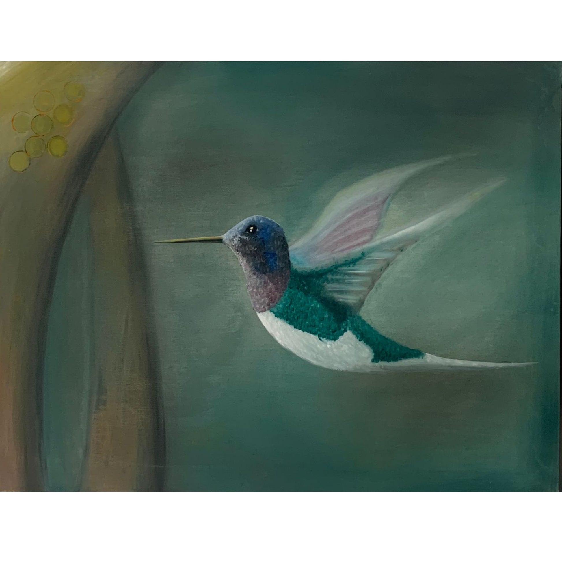 Pintura al óleo de un colibrí, vibrante y llena de vida, captura la belleza y el movimiento de esta fascinante ave. En la obra, el colibrí está representado en pleno vuelo, con sus alas extendidas y un brillo iridiscente que resalta en tonos verdes, azules y púrpuras. La luz del sol se refleja en sus plumas, enfatizando su delicadeza y agilidad.