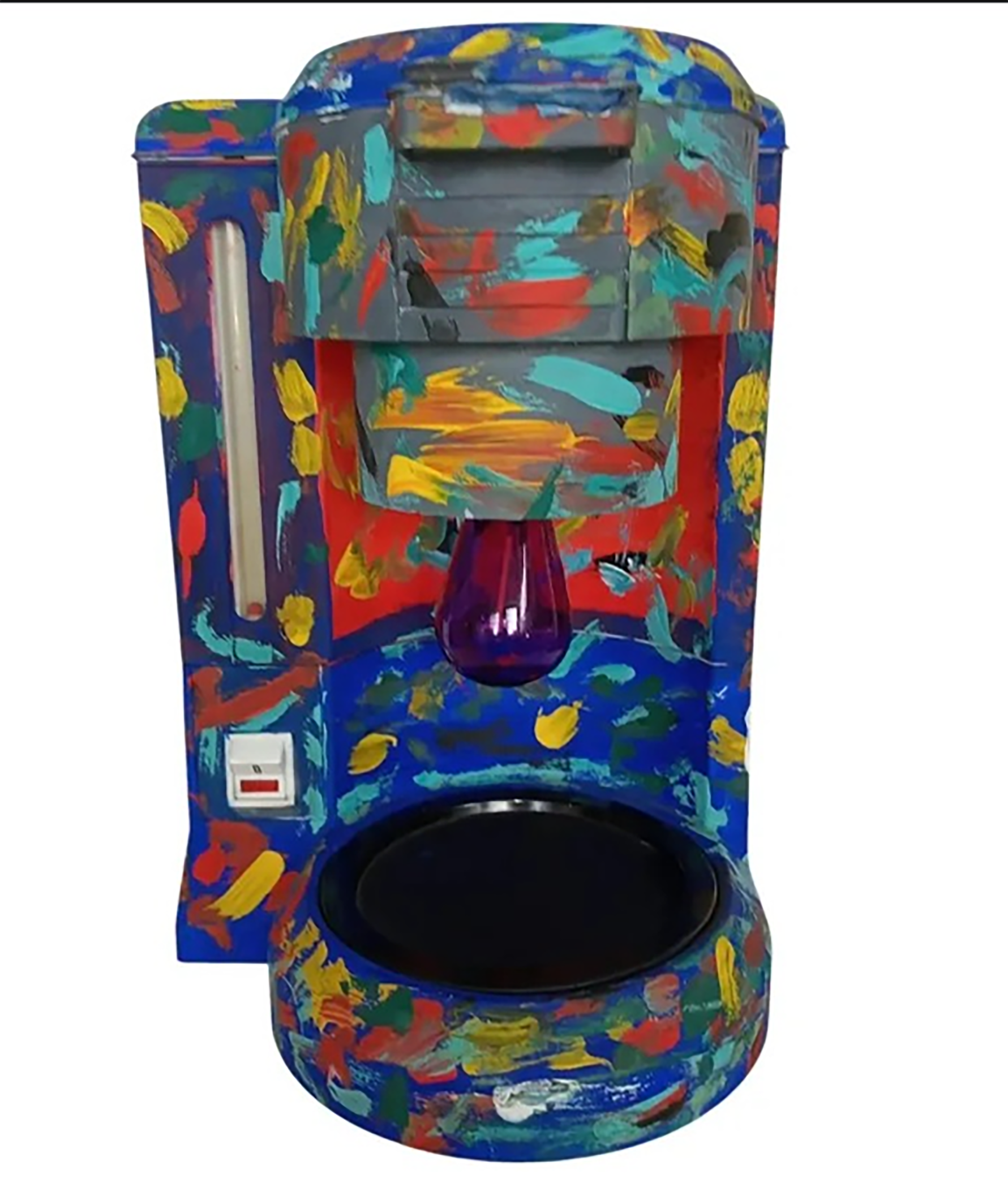 Obra realizada con material reciclado, cafetera eléctrica marca Oster modelo CM-991, intervenida por el artista creando una creativa lampara escultura, dándole vida y uso a nuestros desechos materiales. Ademas de promover la creatividad y la reutilización como una forma de expresión consciente y comprometida con el medioambiente.♻