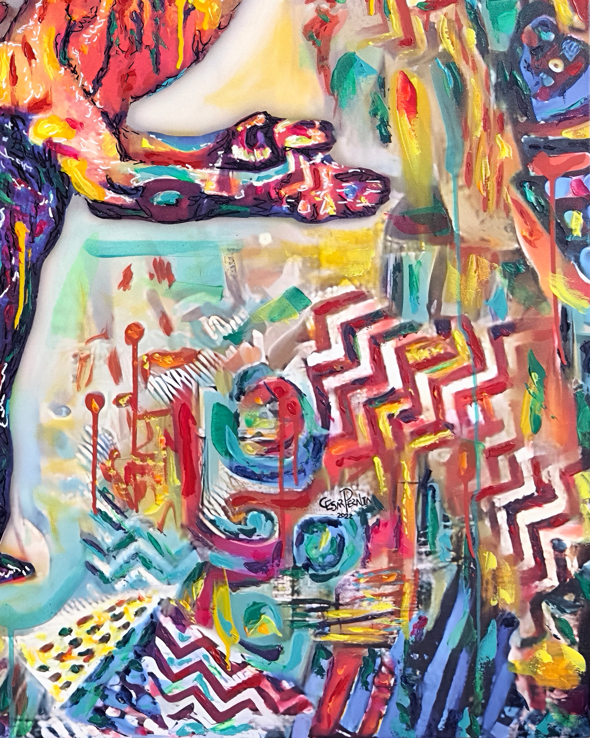 Esta obra es parte de mis trabajos de arte híbrido, una fusión de arte digital con arte tradicional, en este caso pintura. Esta obra lleva tres procesos: la ilustración digital impresa sobre lienzo, la cual despues se monta sobre bastidor de madera y me la llevo a mi taller donde hago la intervención con pintura acrílica. Finalmente realizo una animación digital la cual puedes ver a través de tu telefono o tablet como realidad aumentada.