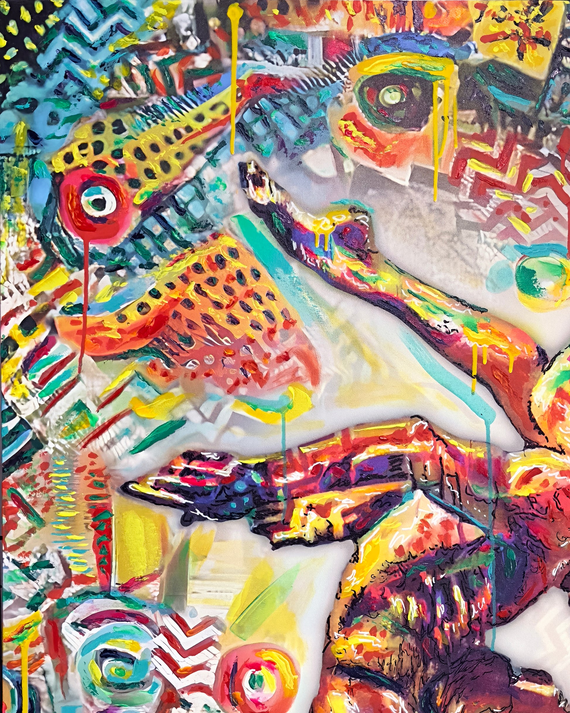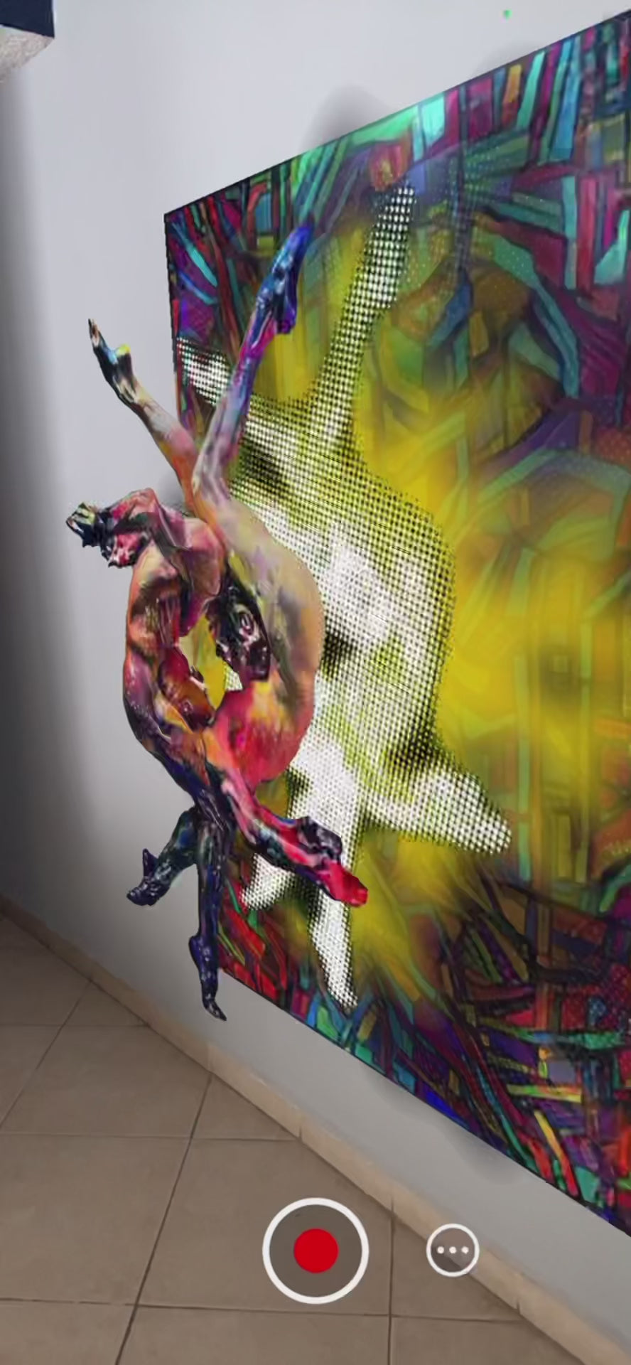 Ilustración digital impresa sobre lienzo, intervenida con pintura acrílica y realidad aumentada 3D