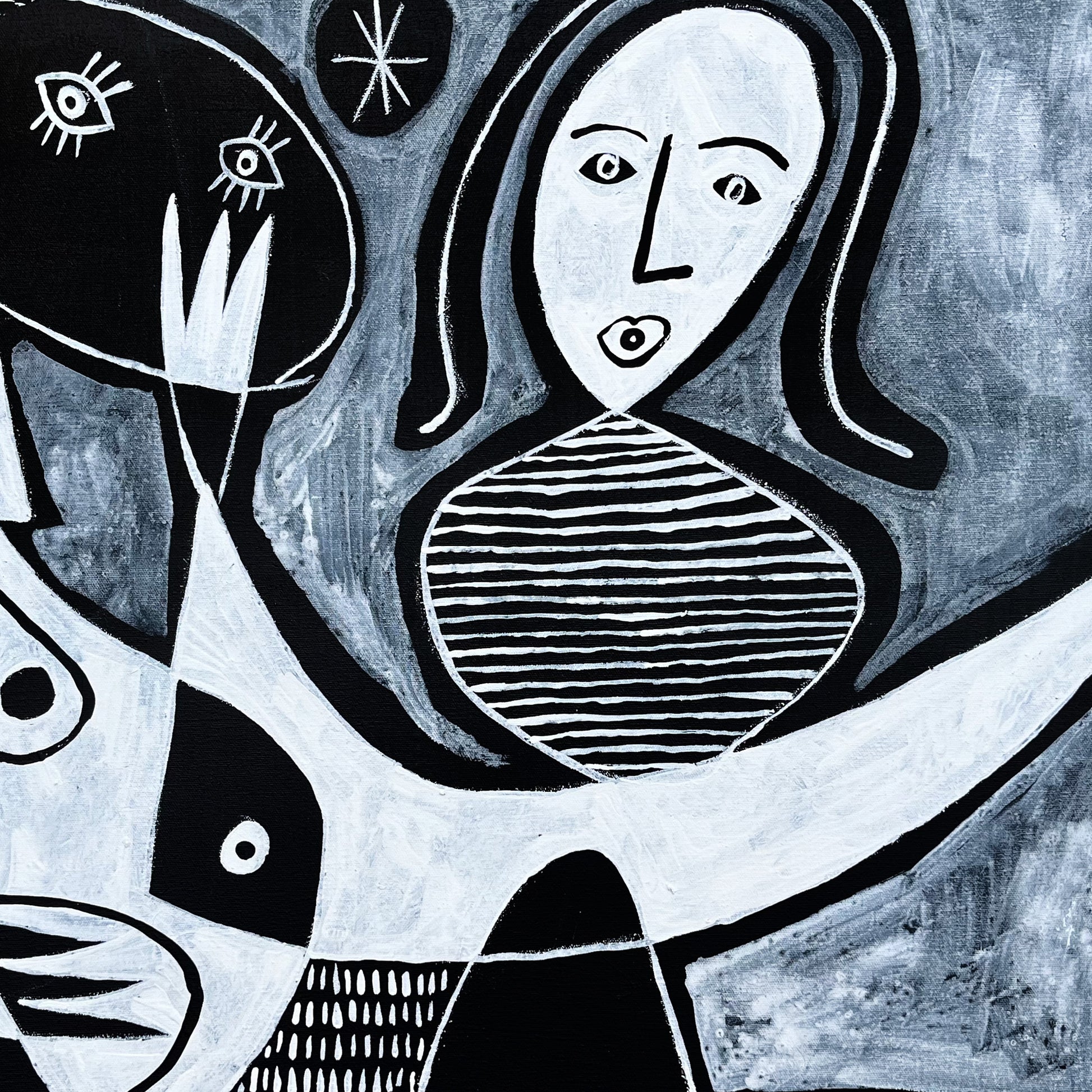 El trabajo de Pichardo es una amalgama de influencias que lo mantienen vigente. De Jean Dubuffet, toma la espontaneidad del arte bruto, mientras que de Basquiat adopta la energía urbana y la integración de lo visual con lo textual. Estas influencias se reflejan en Composición en blanco y negro, creando un juego visual que invita al espectador a sumergirse en un universo emocional único.