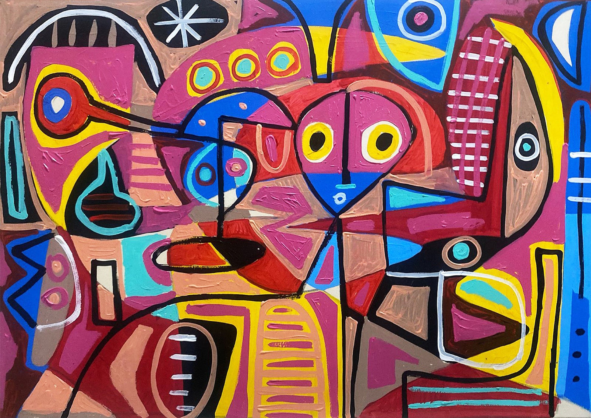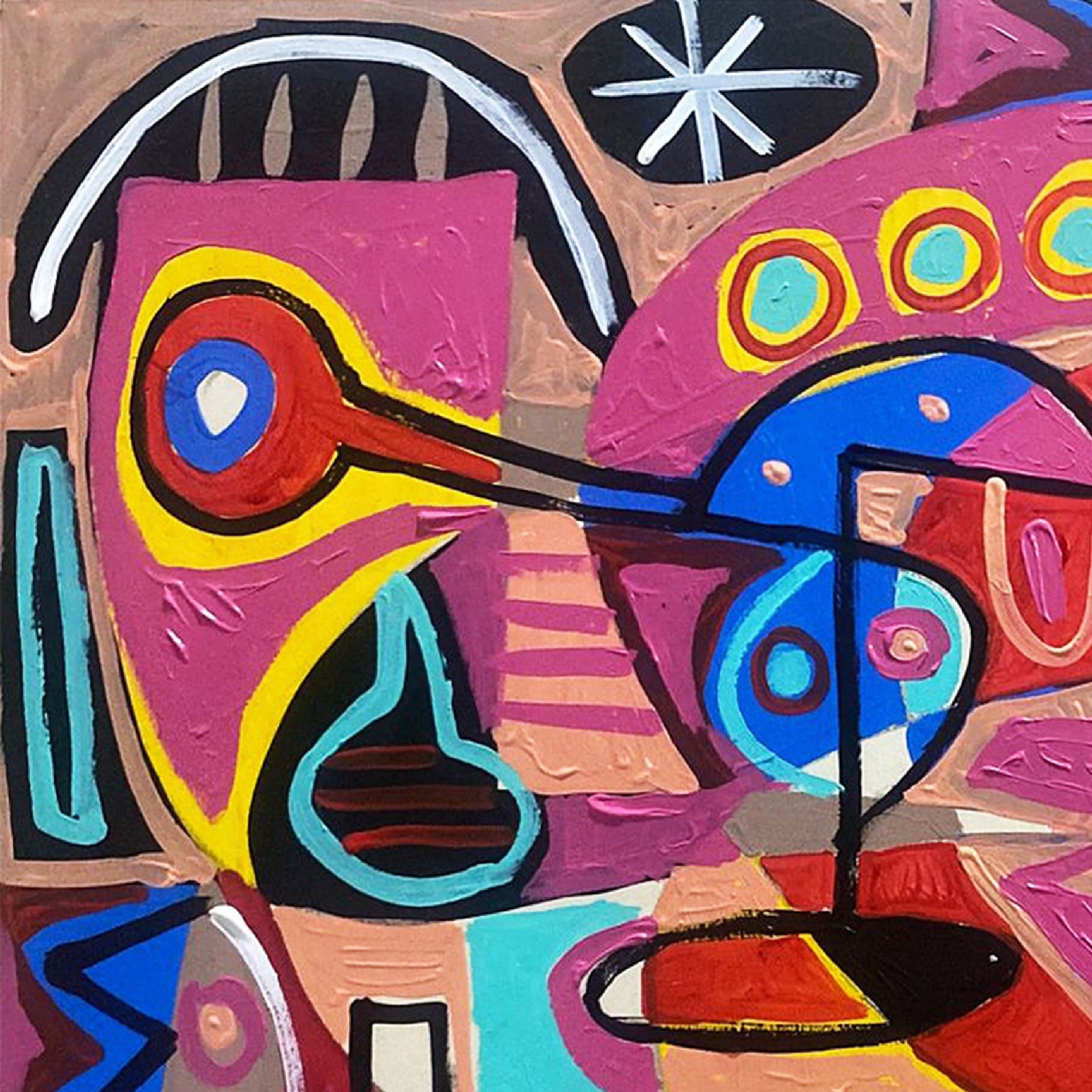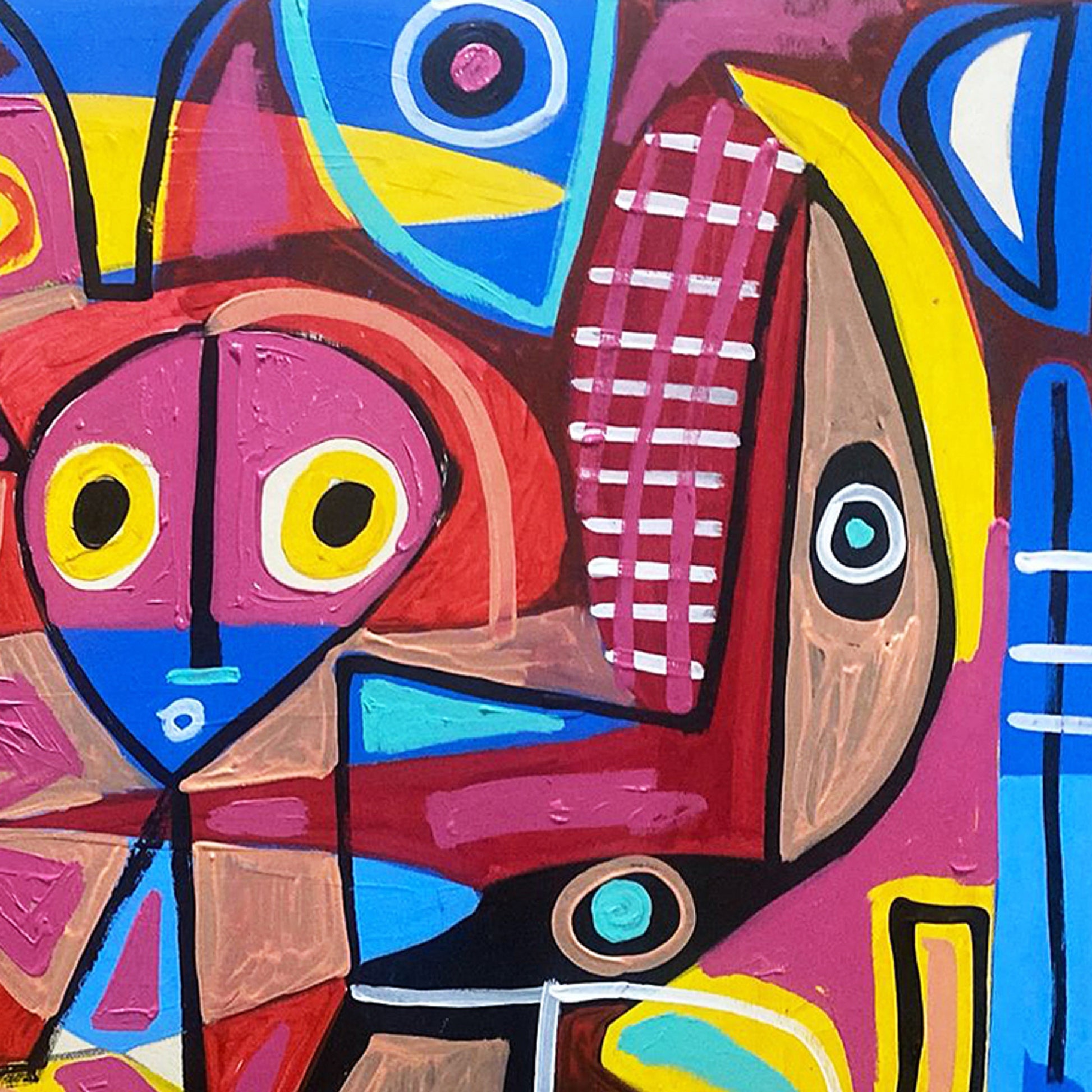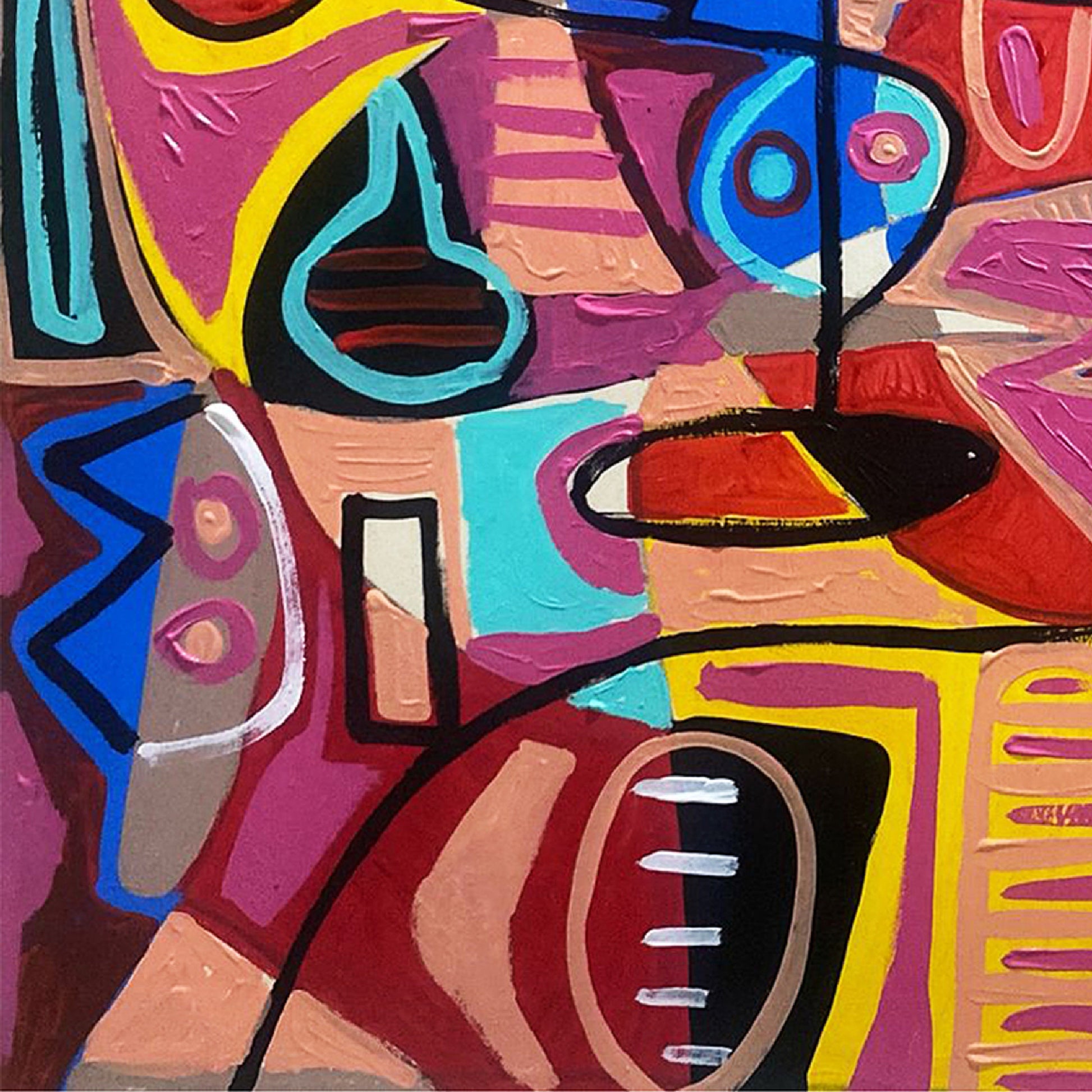 La pieza se construye a partir de un entramado de colores intensos: fucsias eléctricos, azules profundos, amarillos radiantes y toques de turquesa y negro que generan contrastes visuales de gran fuerza. En el centro, un rostro estilizado con ojos circulares y máscara azul parece emerger entre múltiples planos, sugiriendo un personaje que dialoga con el espectador desde lo onírico. La composición dinámica evoca la libertad gestual y lúdica del arte moderno, en la línea de Joan Miró y Jean Dubuffet, pero con una energía singularmente mexicana que caracteriza la obra de Pichardo.