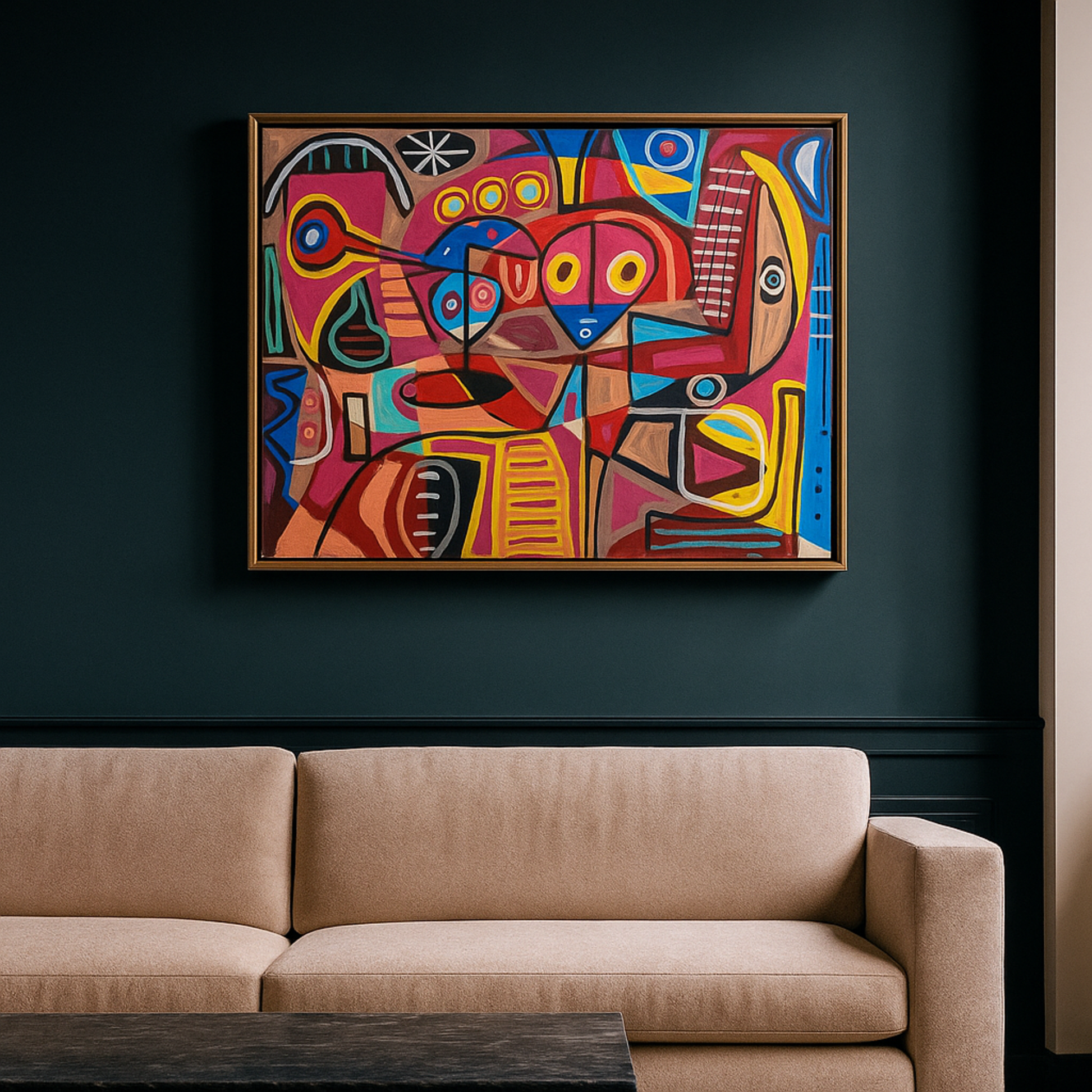 Composición es más que una pintura: es un universo simbólico que celebra la vitalidad, ideal para coleccionistas que buscan piezas únicas con poder cromático, lenguaje abstracto y un fuerte impacto visual para espacios contemporáneos.