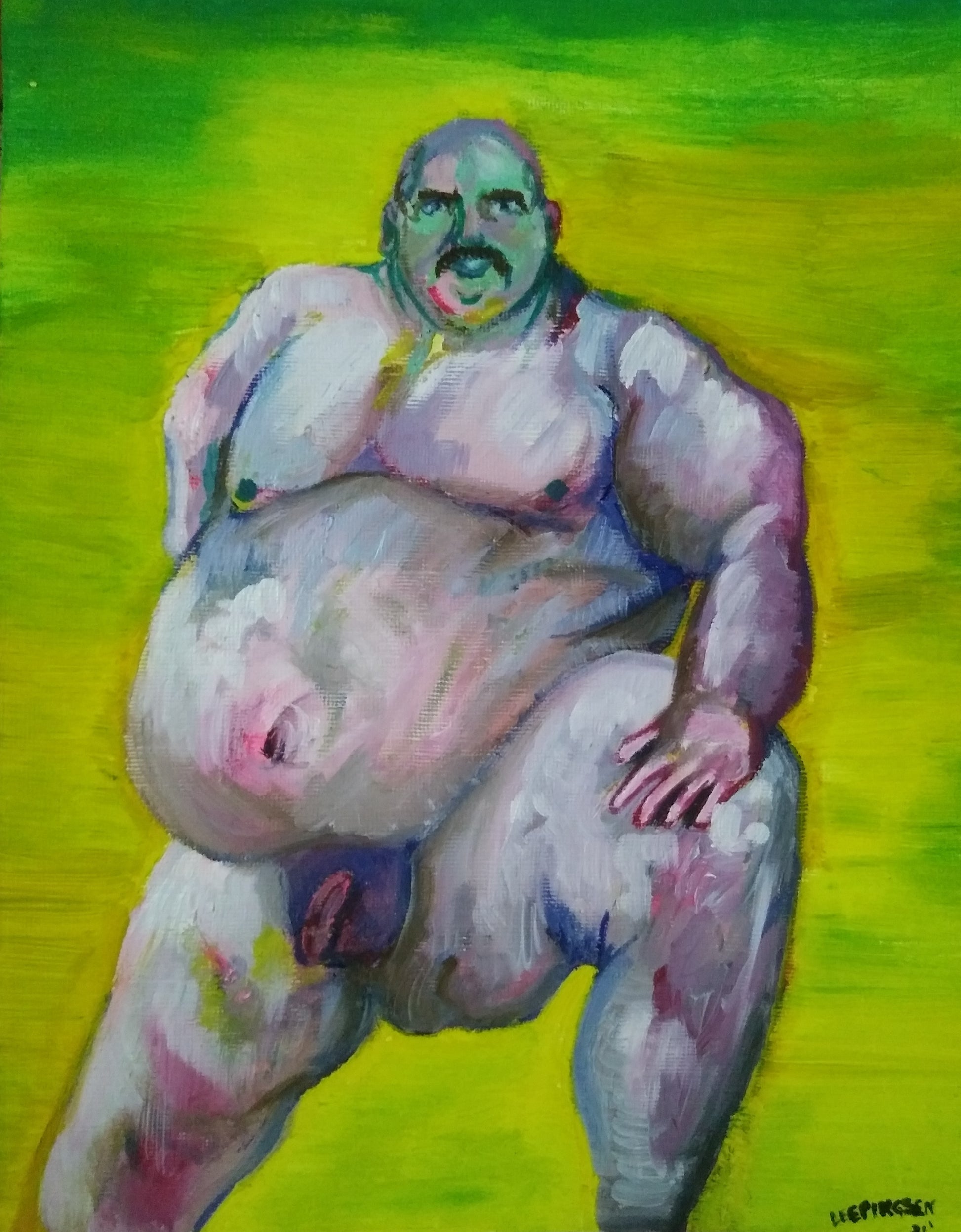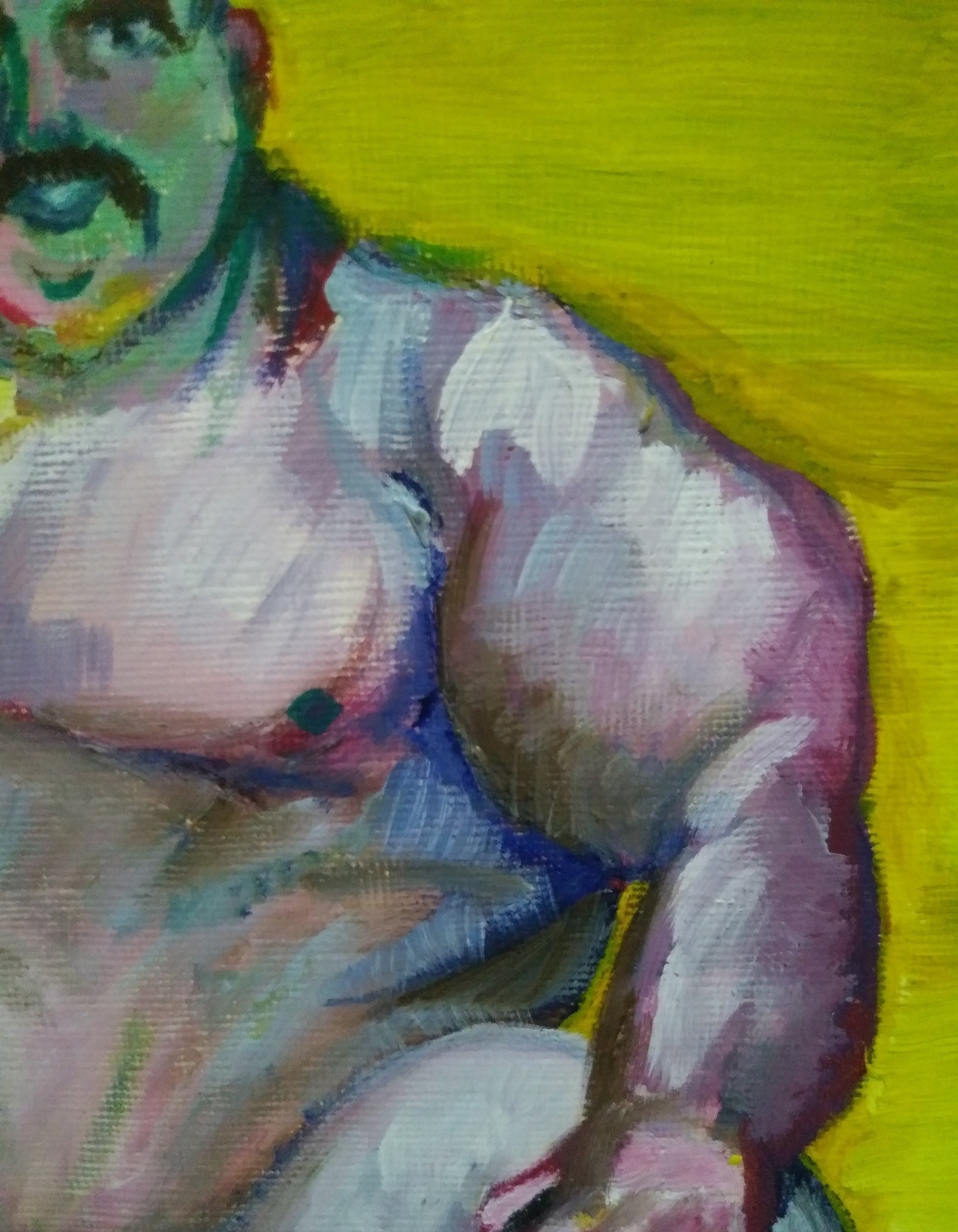 El personaje está divirtiéndose con el espectador al mostrarse como un estereotipo de hombre homosexual con sobrepeso, por ello solo se "vanaglorea de tener bigote de macho".