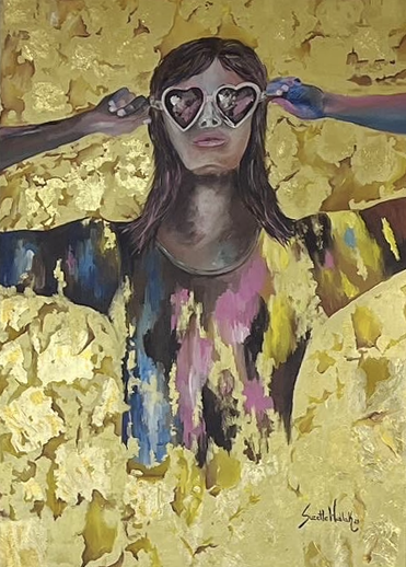 La obra refleja la mirada filtrada por el amor como lente transformador. El dorado alude a lo sagrado y lo eterno, mientras que la ironía de los lentes en forma de corazón juega con la manera en que elegimos ver la vida. Una invitación a cuestionar la percepción y a abrazar lo luminoso en medio de lo cotidiano. Esta obra juega con la ironía y la luz. La figura con lentes de corazón se convierte en un símbolo de la mirada filtrada por la ilusión y el deseo, mientras el fondo dorado evoca lo sagrado y lo efímero. Es un retrato del contraste entre lo superficial y lo profundo, entre lo que vemos y lo que ocultamos. Y por otro lado de los lentes que queremos usar ante cada situacion o momento de la vida para ver.