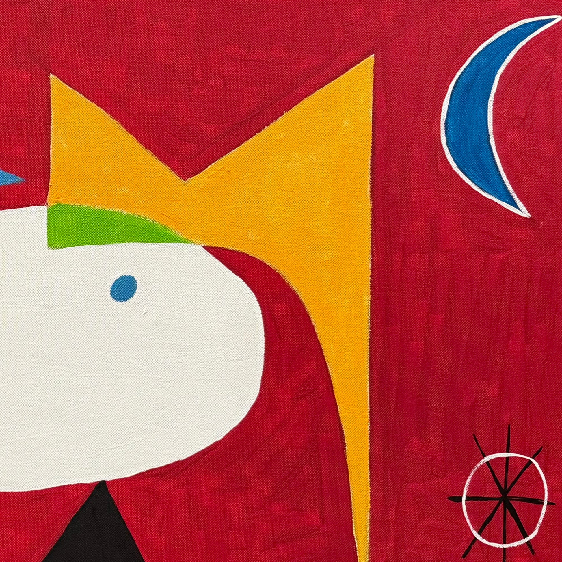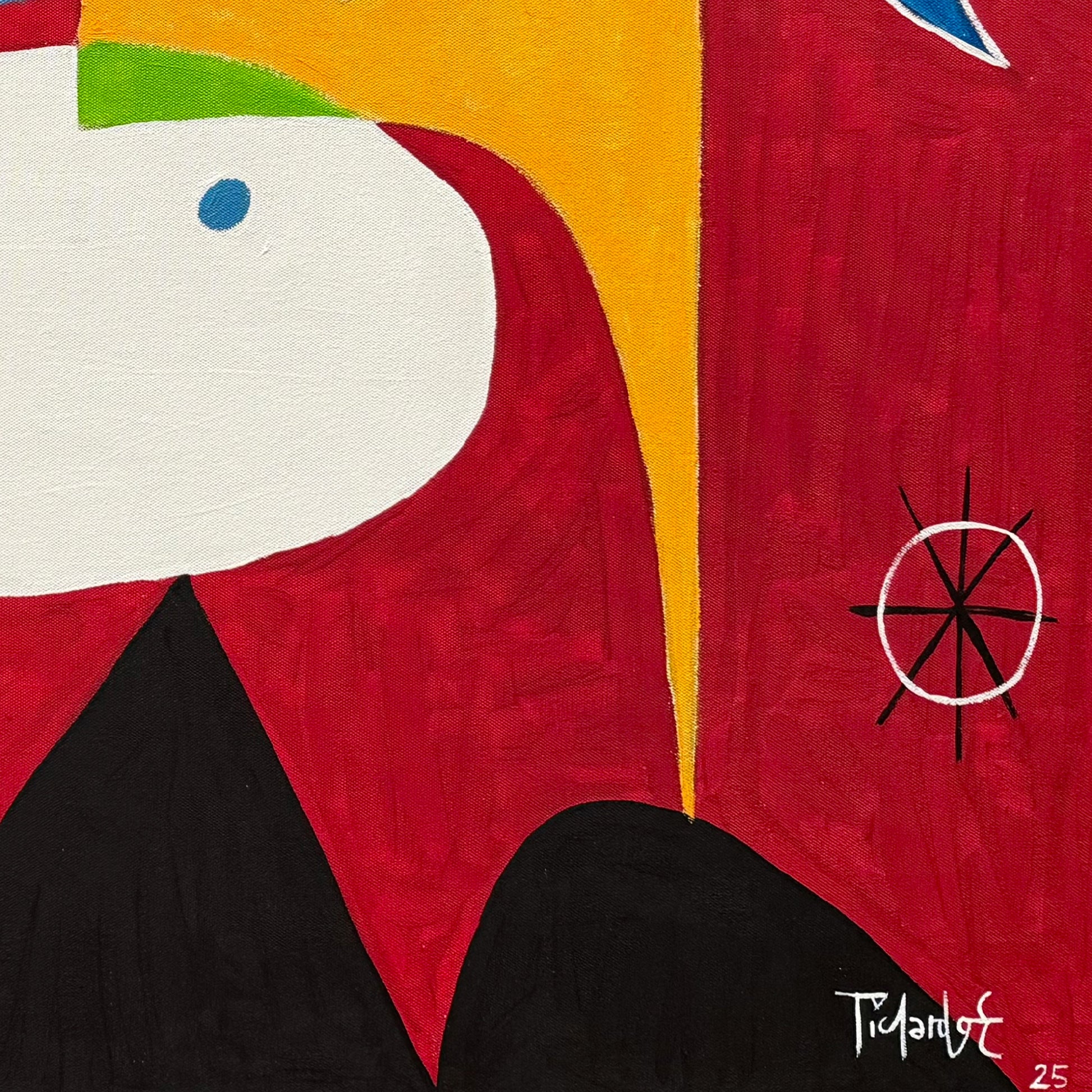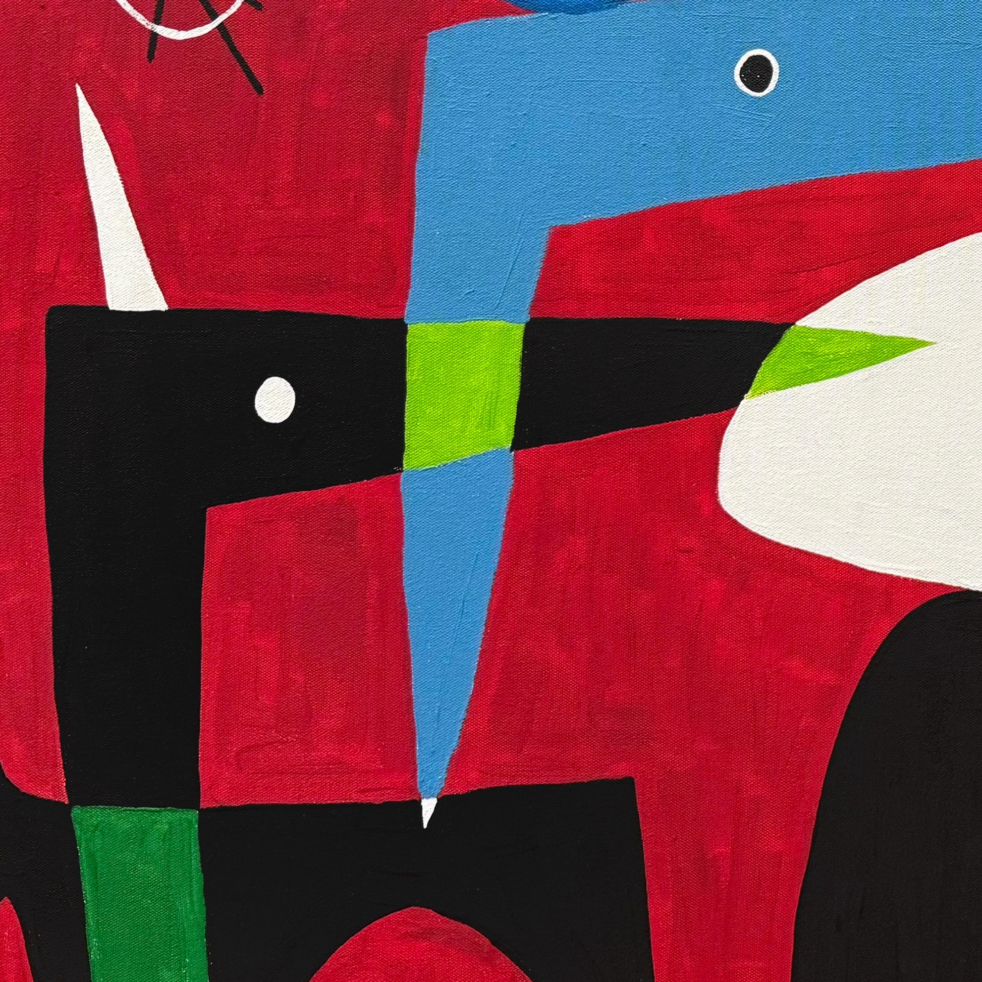 Esta pintura destaca por su equilibrio cromático y su narrativa visual. Los tonos primarios y secundarios se combinan en planos definidos que evocan un diálogo entre el instinto animal y la abstracción. Los círculos con trazos negros y la media luna azul aportan ritmo y estructura al conjunto, generando una sensación de cosmos interior. El uso del acrílico sobre tela confiere intensidad y profundidad al color, mientras la composición horizontal amplía la percepción espacial del espectador. Esta propuesta estética remite a la libertad creativa del arte moderno europeo, con resonancias del espíritu de Miró, reinterpretado desde la sensibilidad mexicana.
