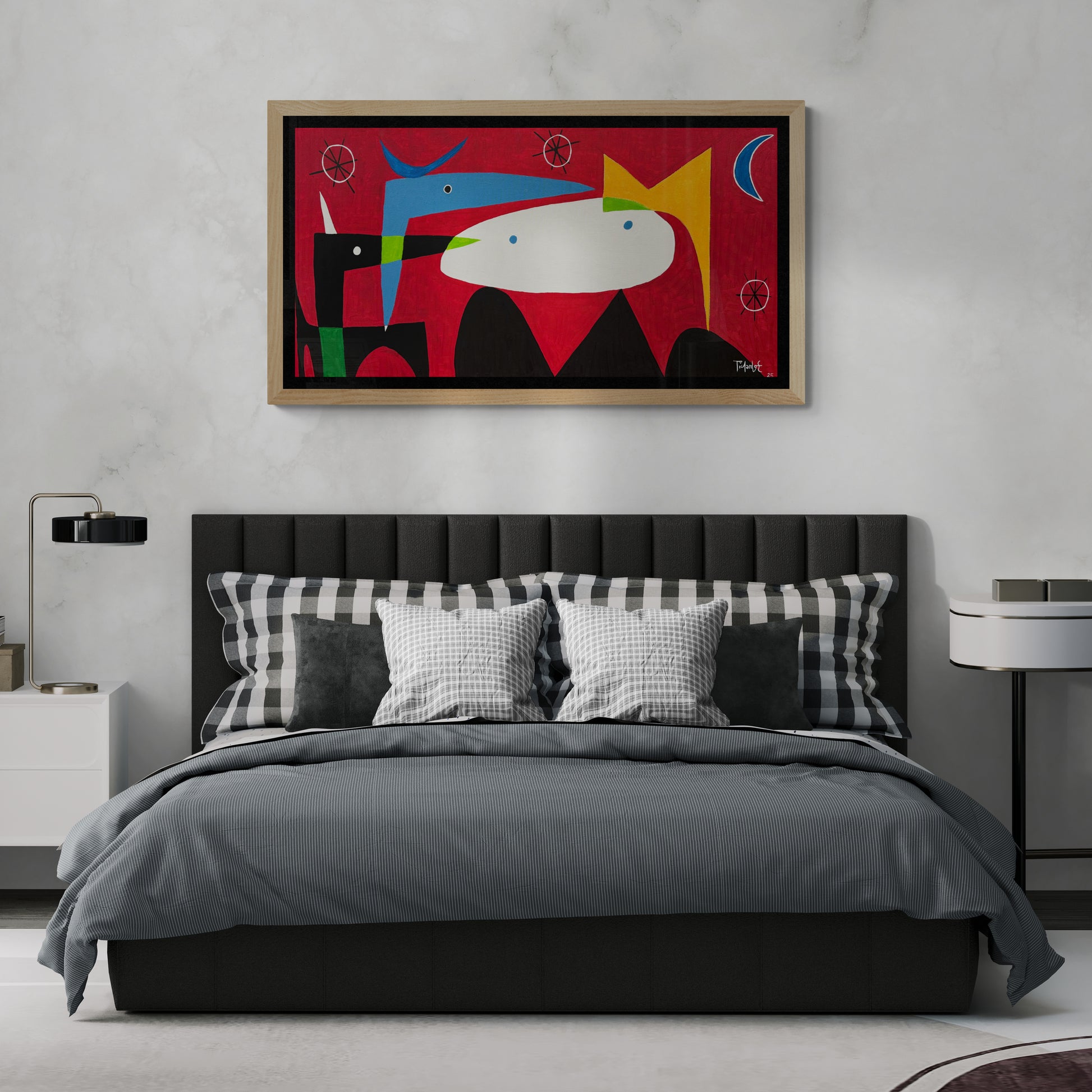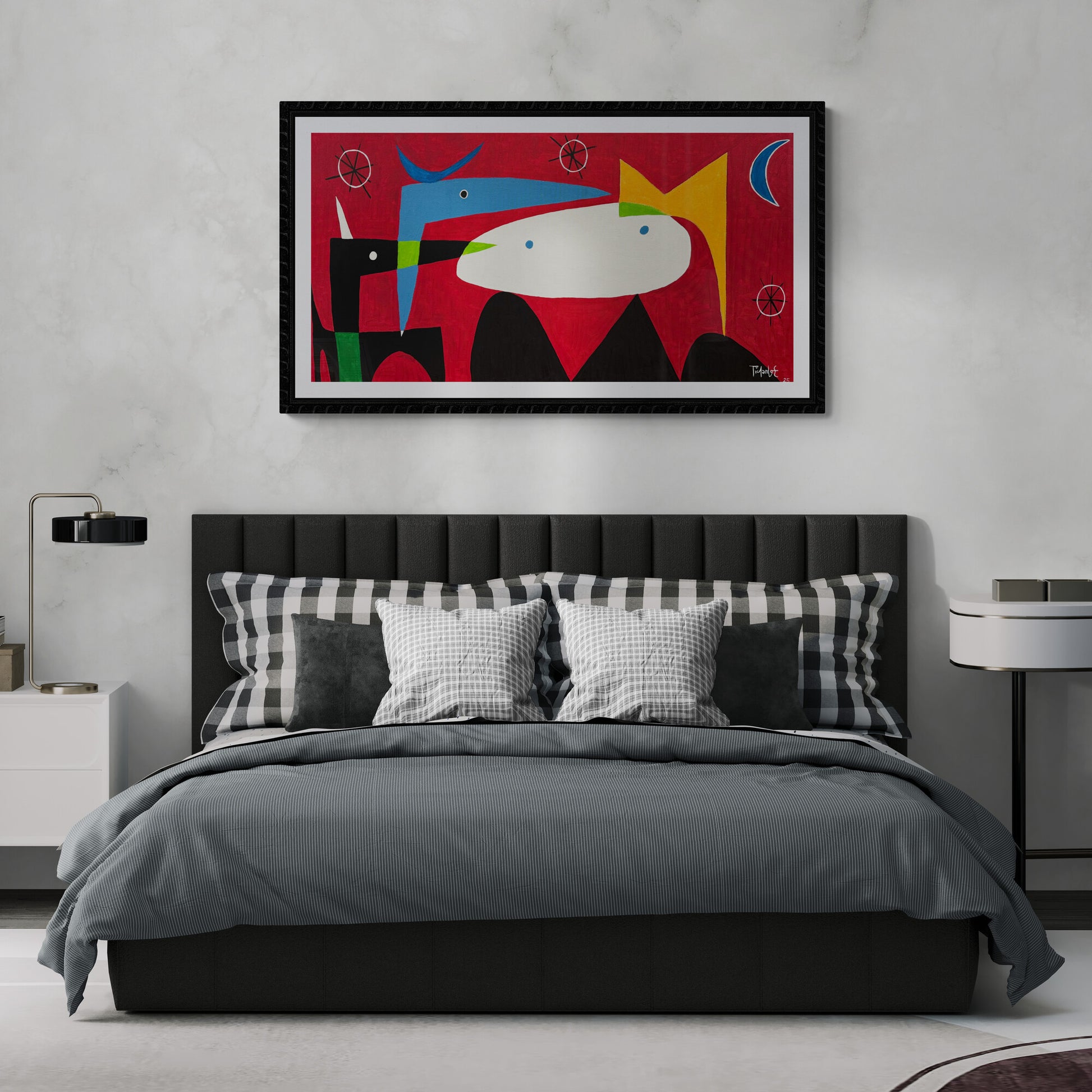 Con los coyotes del artista Enrique Pichardo resume la esencia lúdica y espiritual que define toda su creación. Con colores intensos, composición simbólica y trazos seguros, esta pintura representa una celebración de la imaginación. Su estética abstracta, su tono optimista y su ejecución impecable la convierten en una pieza ideal para coleccionistas que valoran el arte contemporáneo vibrante, intuitivo y profundamente humano.