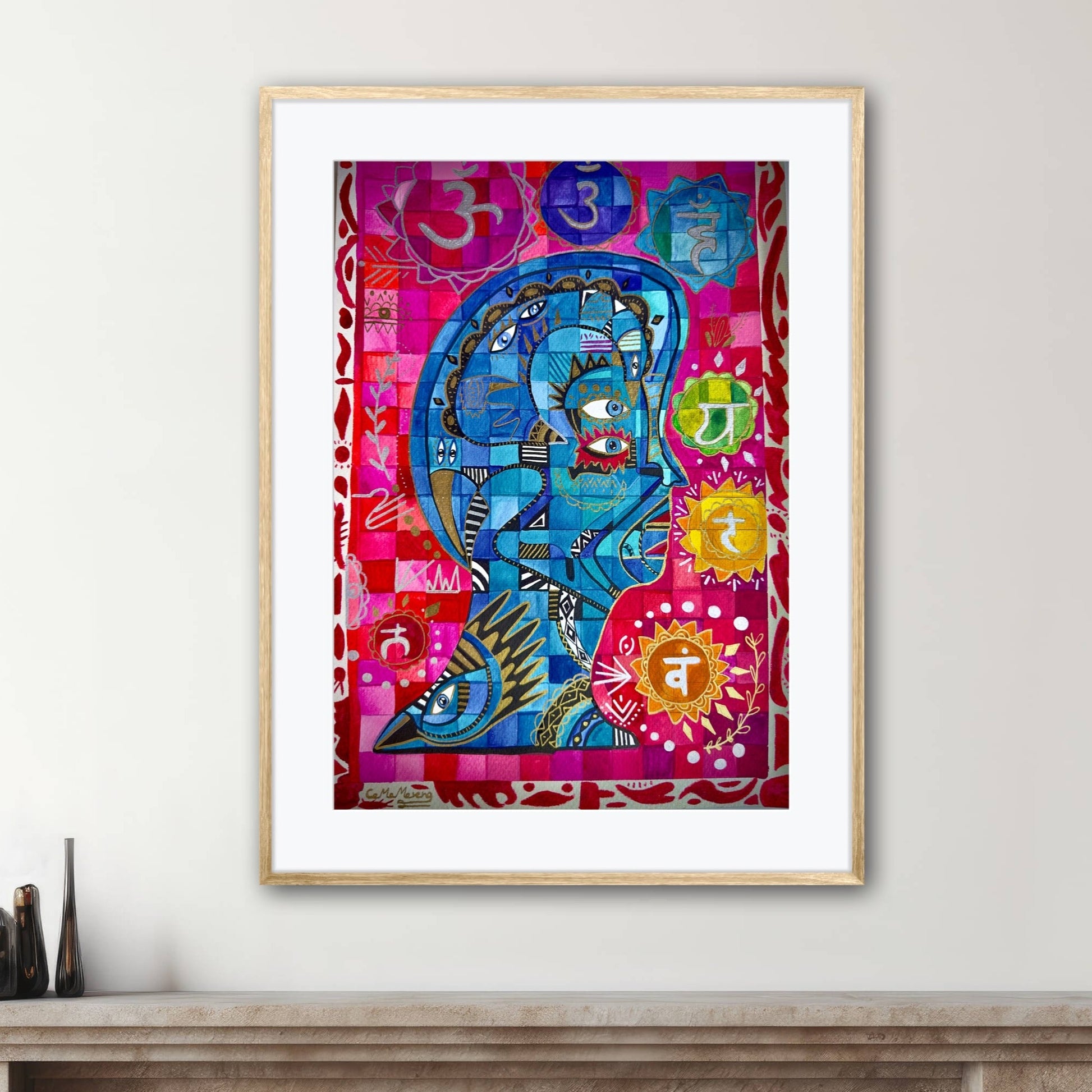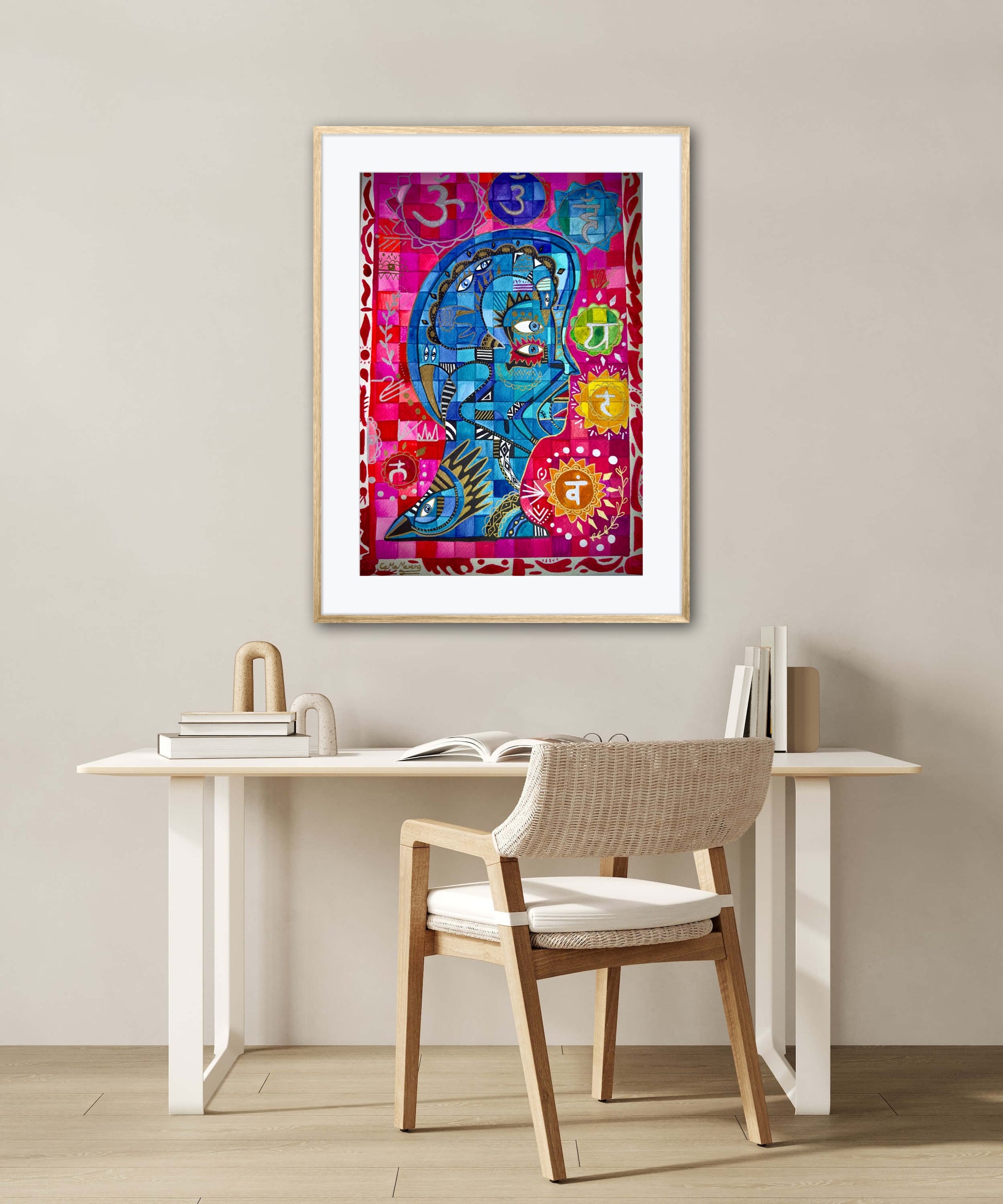 “Es una pieza llena de Explosión de creatividad: una fusión de formas y colores en un mundo textil y de imágenes Los chakras son centros de energía ubicados en el cuerpo humano, según la tradición hinduista y budista. Se cree que existen siete chakras principales a lo largo de la columna vertebral, desde la base de la columna hasta la parte superior de la cabeza. Cada chakra está asociado con diferentes aspectos de la vida y se cree que influyen en la salud física, mental y espiritual.