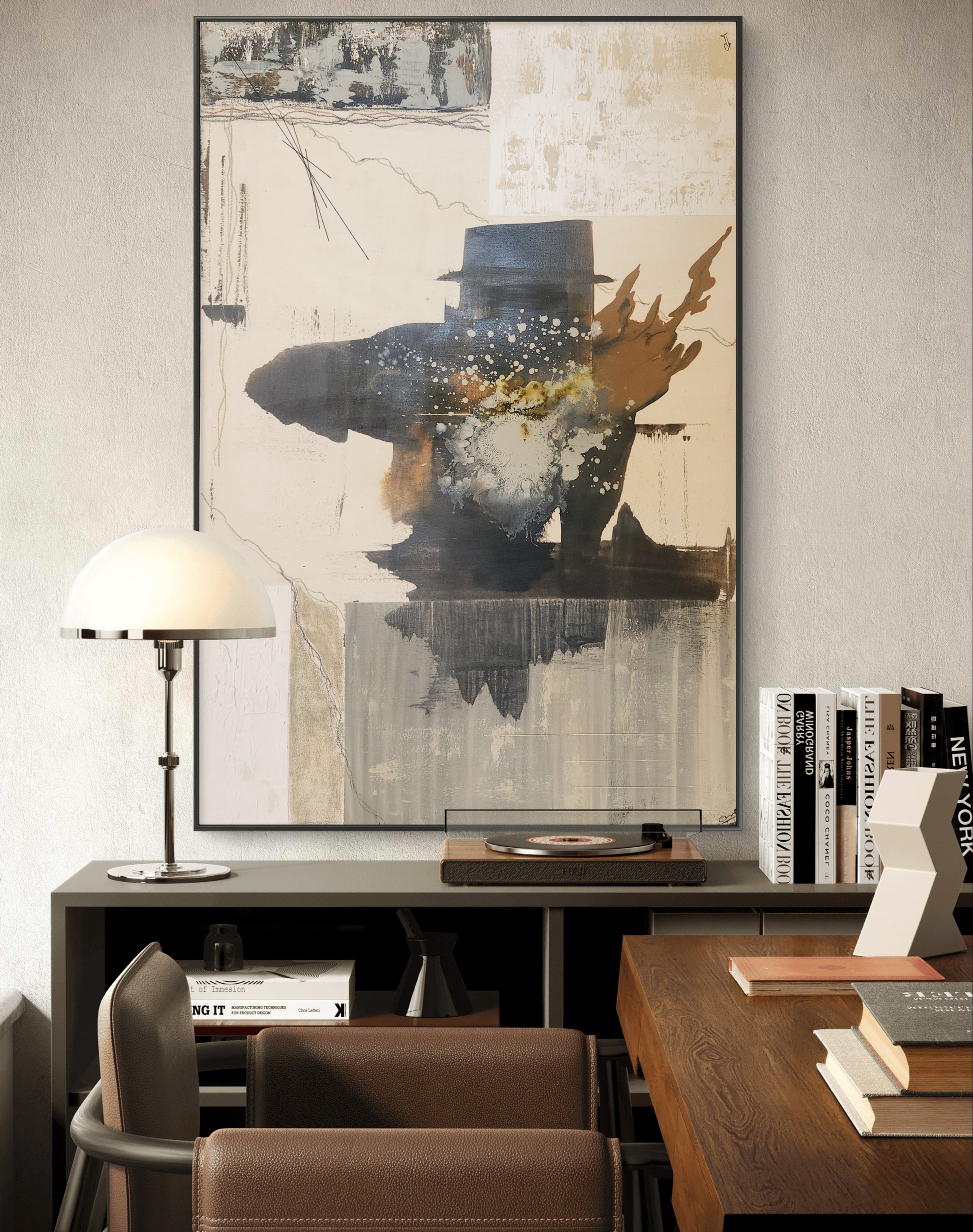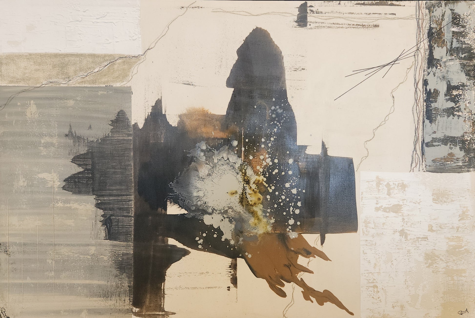 Contrastes de tiempo explora la tensión entre lo visible y lo oculto, lo efímero y lo permanente. A través de materiales mixtos y aplicaciones de hilo, la obra crea un entramado que oscila entre la memoria y la transformación. La silueta abstracta se fragmenta en capas que evocan instantes superpuestos, invitando al espectador a contemplar cómo el tiempo deja huellas en la materia y en la percepción.