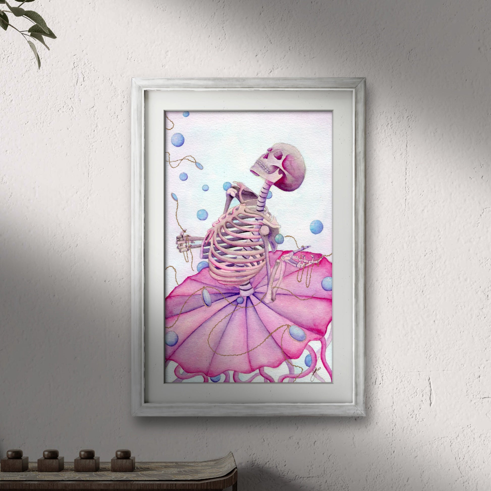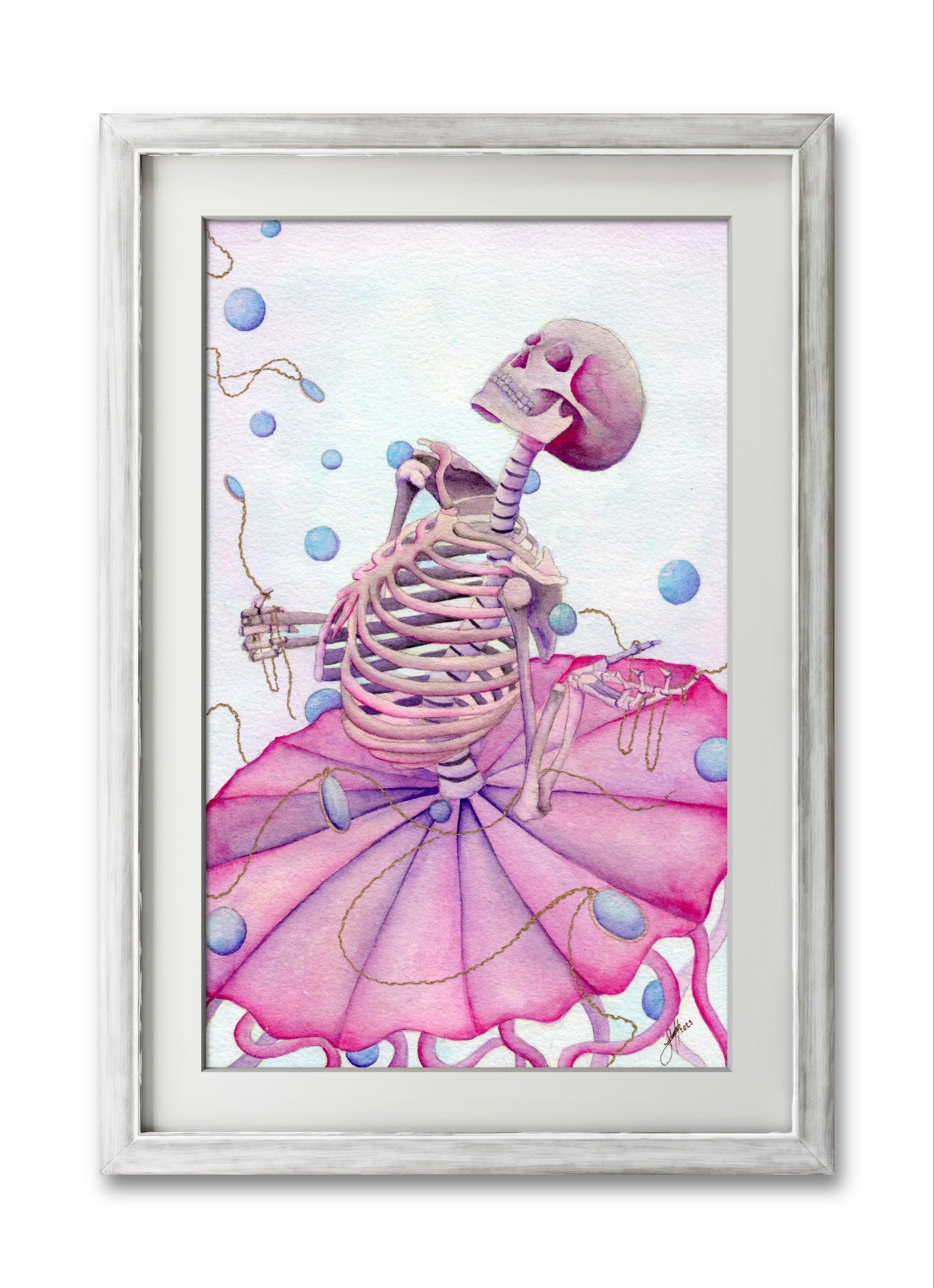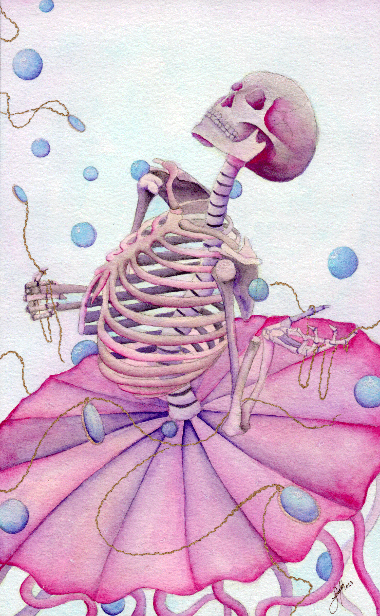 Esta pieza forma parte de una colección de cuatro acuarelas de formato pequeño, en las cuales el autor presenta un esqueleto completamente formado, cuyos huesos parecen hechos de pura luz y sus cavidades resplandecen con un brillo hipnótico. Este ser anatómico está cubierto por una exquisita colección de joyas que parecen fusionarse con su estructura ósea, creando un contraste fascinante entre la fragilidad humana y la eternidad que simbolizan las gemas. Realizada en junio del 2023, es una obra 100% original del artista. Acuarela sobre papel fabriano, (no incluye marco).