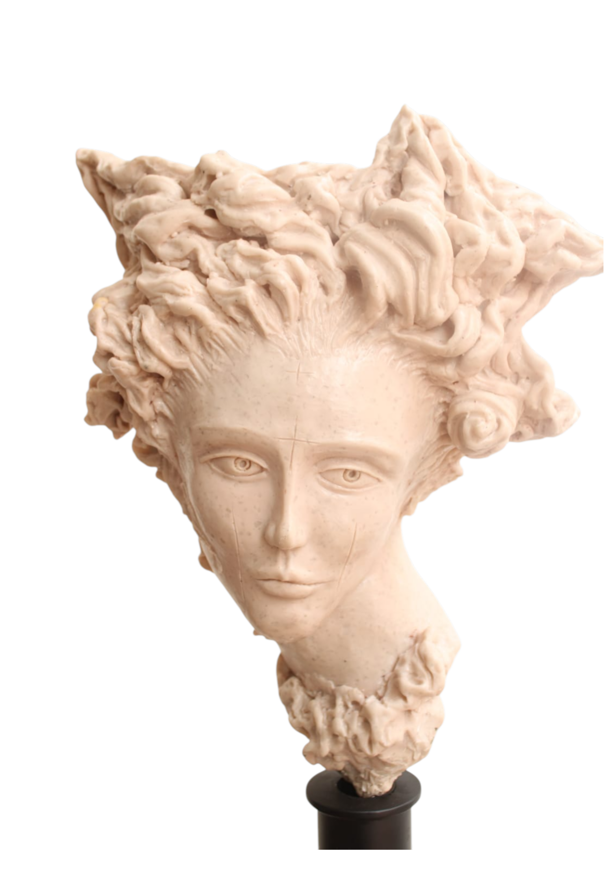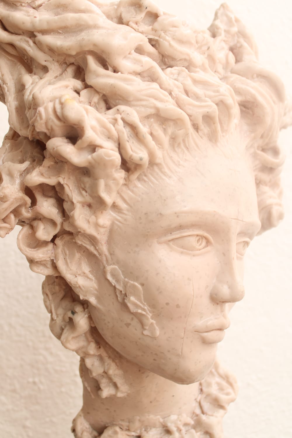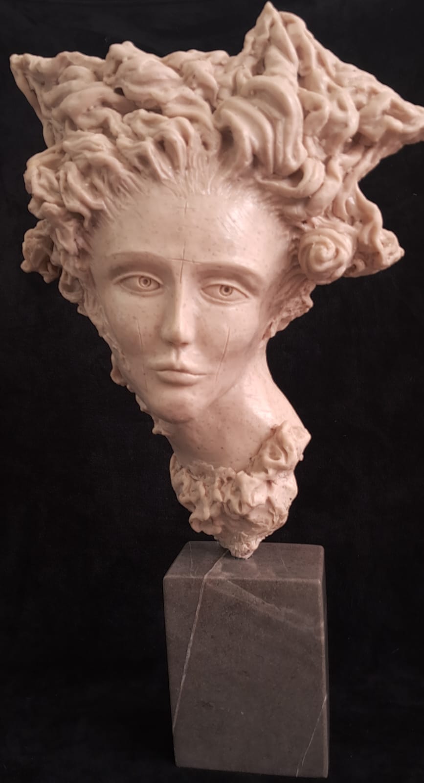 Cabeza de mujer, terminada en resina poliester mezclada con sal de mar con base de marmol santo tomas.