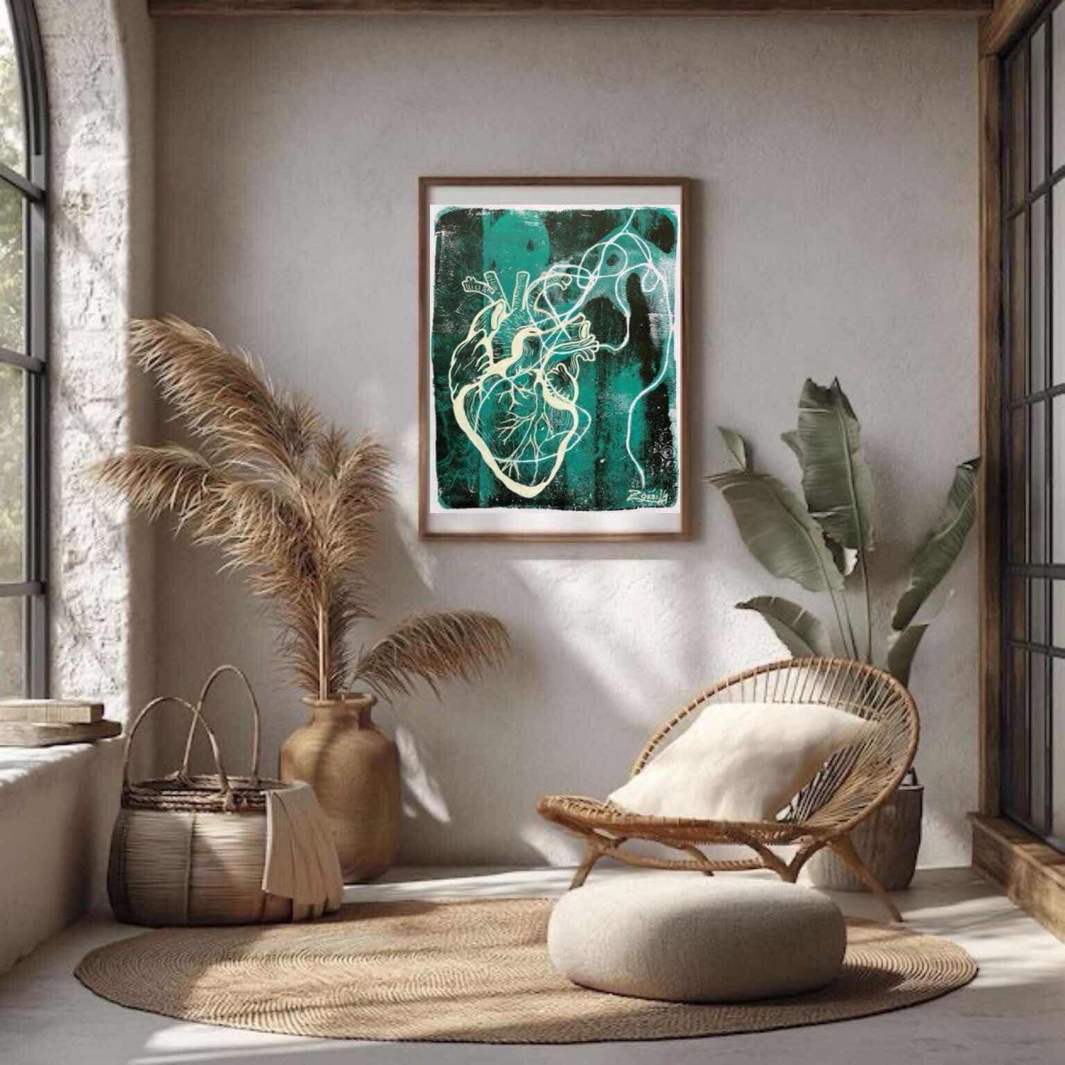Impresión giclee papel Fine Art Textured silk de 270g a partir de obra original realizada por la artista en técnica mixta con pintura acrílica sobre papel. Esta pintura forma parte de la serie "Habitáculo del Alma", con un tema en común, el corazón como un órgano en el cual habita en alma mientras encarna en el cuerpo. La obra se encuentra actualmente expuesta en la Casa de Cultura San Rafael en CDMX hasta el 27 de febrero.