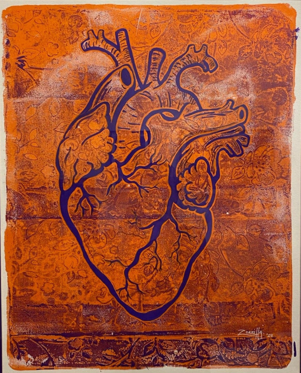 Impresión giclee papel Fine Art Textured silk de 270g a partir de obra original realizada por la artista en técnica mixta con pintura acrílica sobre papel. Esta pintura forma parte de la serie "Habitáculo del Alma", con un tema en común, el corazón como un órgano en el cual habita en alma mientras encarna en el cuerpo. La obra se encuentra actualmente expuesta en la Casa de Cultura San Rafael en CDMX hasta el 27 de febrero.
