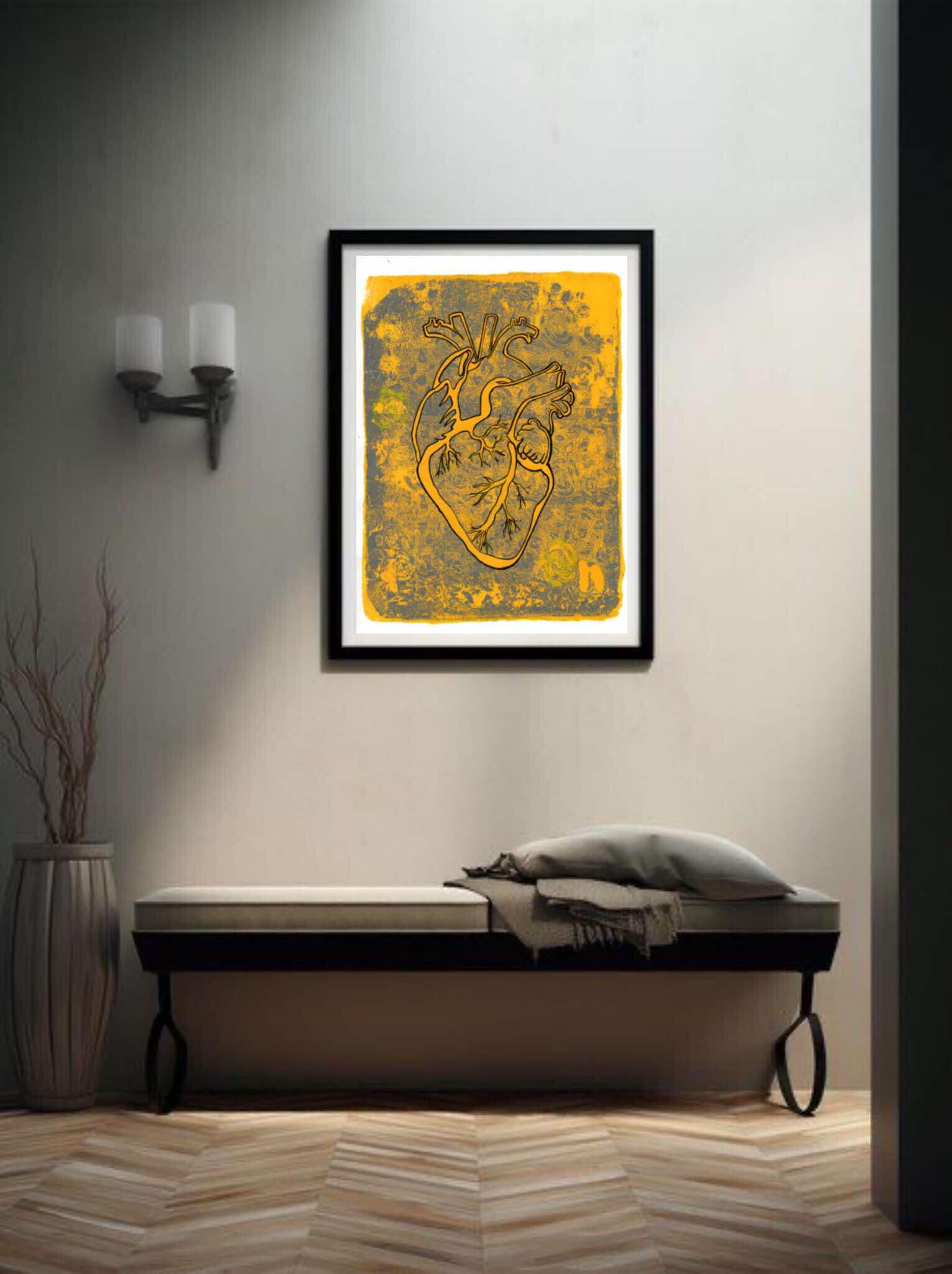 Impresión giclee papel Fine Art Textured silk de 270g a partir de obra original realizada por la artista en técnica mixta con pintura acrílica sobre papel. Esta pintura forma parte de la serie "Habitáculo del Alma", con un tema en común, el corazón como un órgano en el cual habita en alma mientras encarna en el cuerpo. La obra se encuentra actualmente expuesta en la Casa de Cultura San Rafael en CDMX hasta el 27 de febrero.
