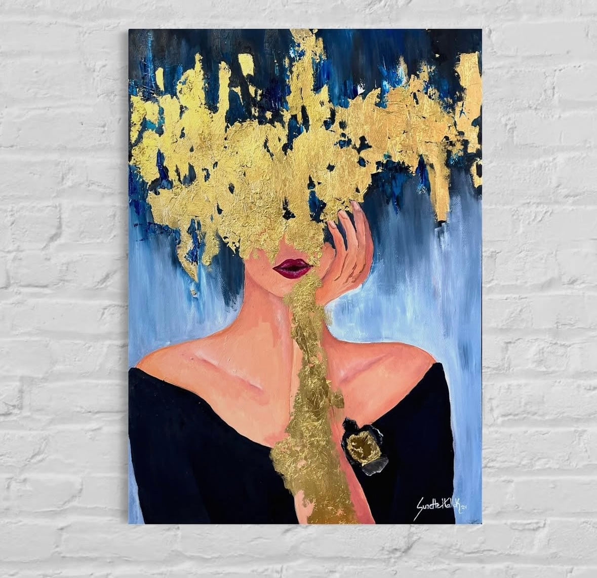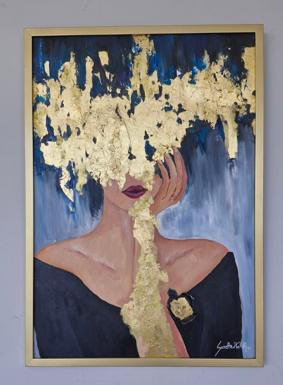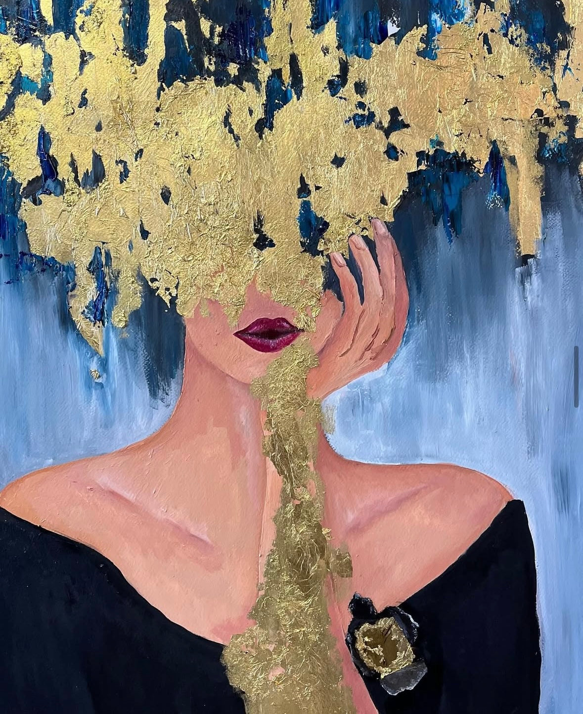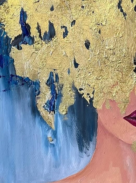 La figura expuesta con el dorado como herida y ofrenda expresa vulnerabilidad y entrega. El oro funciona como símbolo de lo sagrado en el acto de abrir el corazón, de mostrarse frágil y fuerte al mismo tiempo. Una invitación a abrazar la imperfección como belleza. El dorado irrumpe en la figura como un estallido que revela lo íntimo. Esta obra habla de la fragilidad y al mismo tiempo de la potencia de mostrar el interior y nuestra capacidad de amar. Es un gesto de apertura que invita al espectador a reflejarse en la valentía de sentir sin máscaras y amar y amarse.