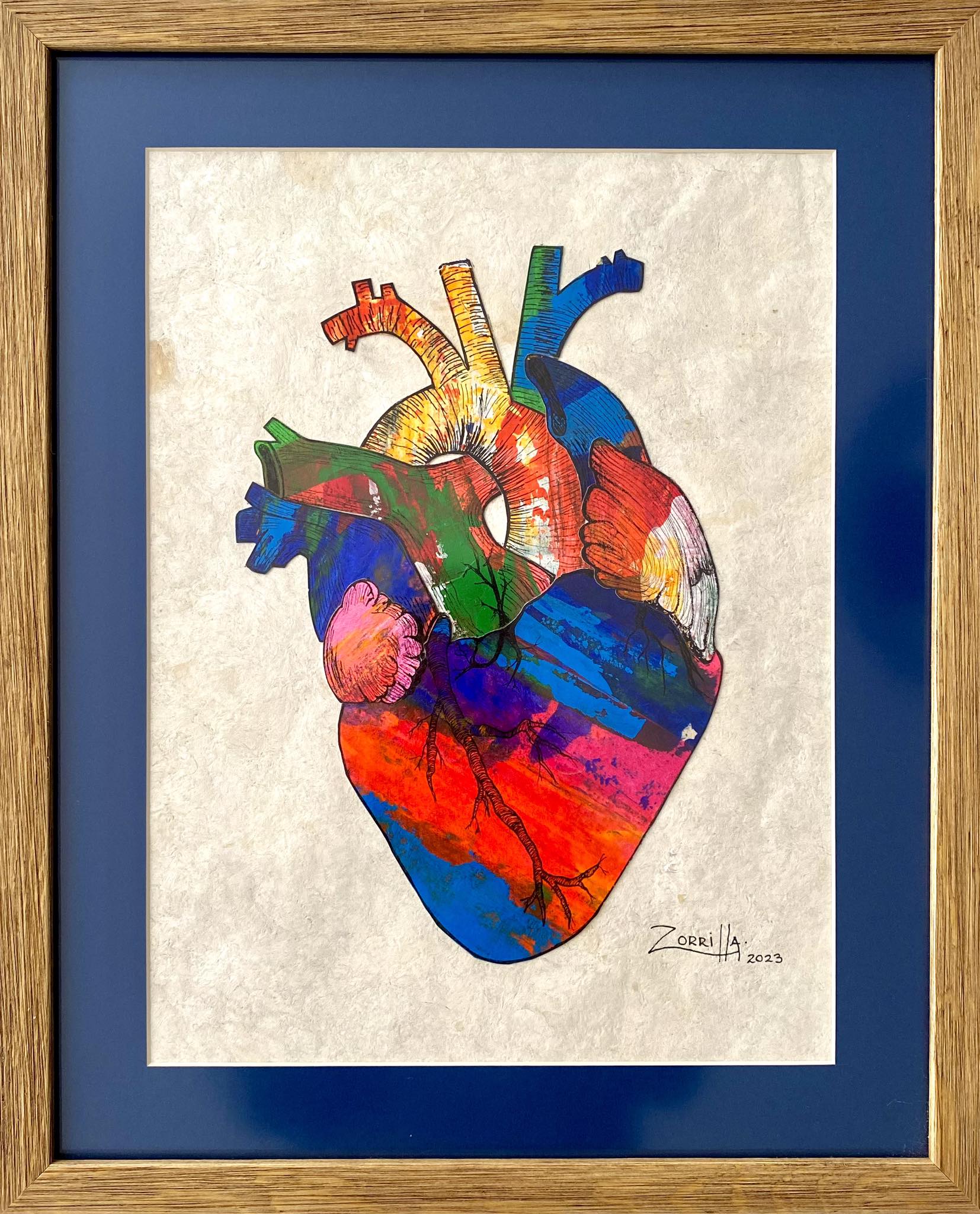 Esta obra es parte de una serie de corazones. Esta realizada en formato de collage con fragmentos de pinturas abstractas que fueron seccionadas minuciosamente para poder confeccionar el corazón y por último se detalló con trazos en tinta, todo hecho a mano. La obra se encuentra enmarcada con un marco de madera natural tipo rústico, marialuisa color azul y cristal antirreflejante.