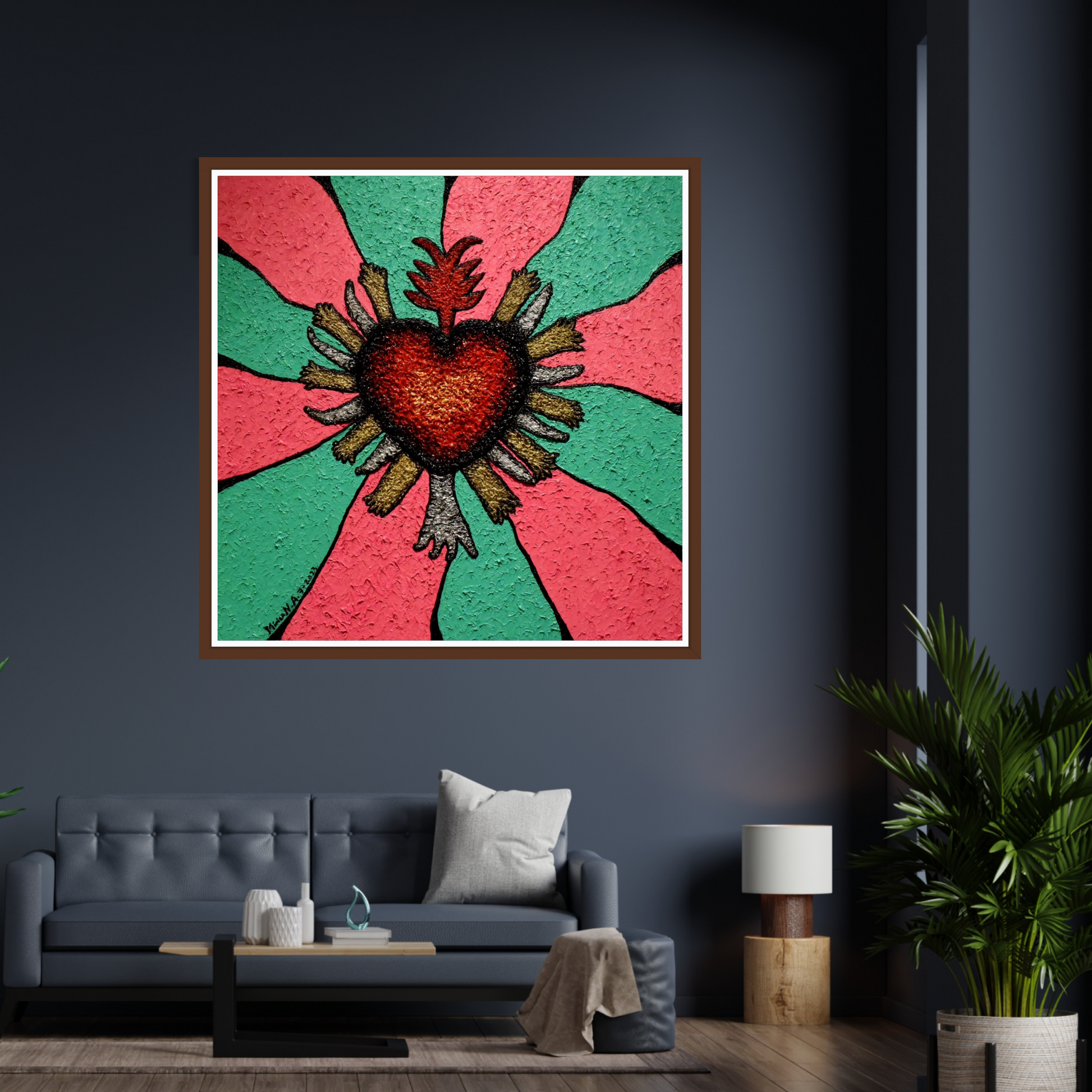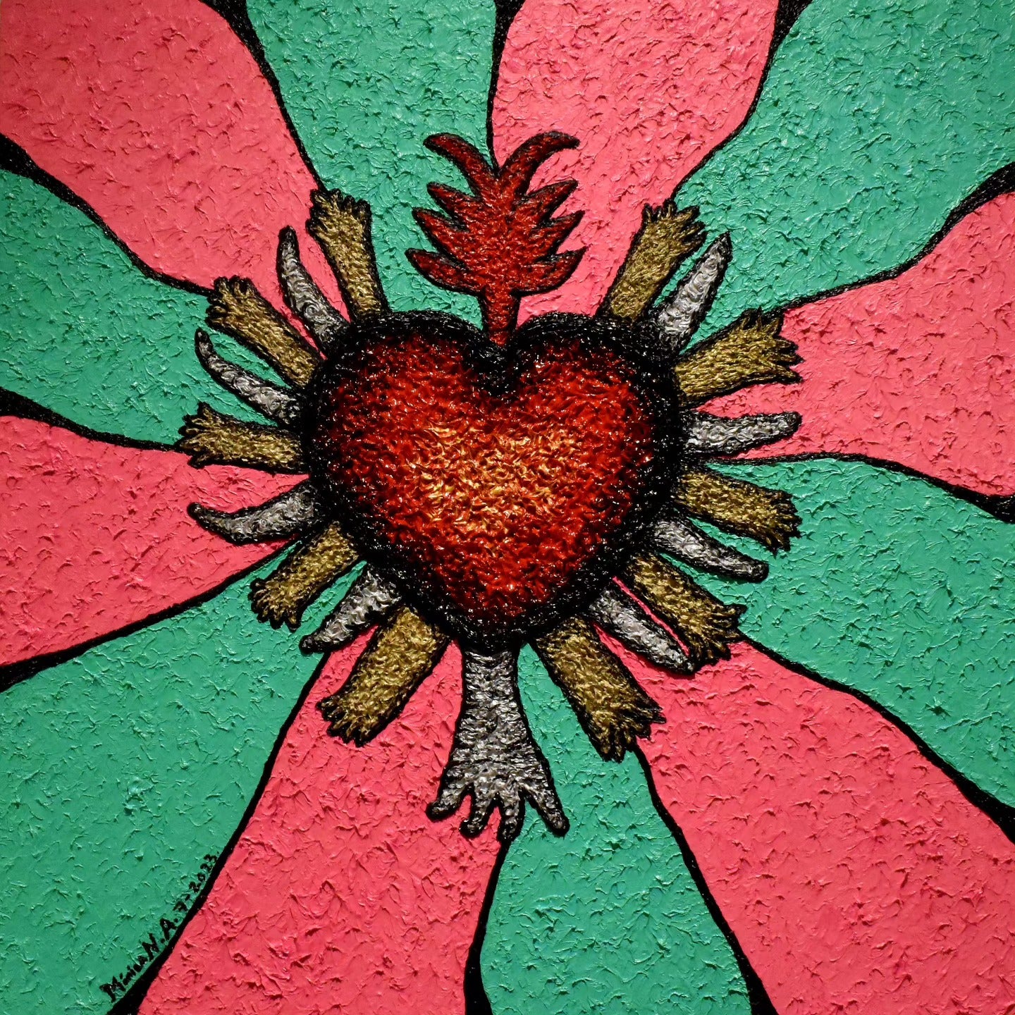 Los corazones sagrados, comúnmente llamados "Milagros", son una artesanía mexicana que data de la época colonial. En esa época, la gente los ofrecía a cambio de un milagro. Esta pintura representa la gratitud por una época que termina y el principio de una nueva. También representa mi gratitud por muchas cosas, no solamente las cosas grandiosas, pero también a las cosas cotidianas que me motivan a seguir adelante.