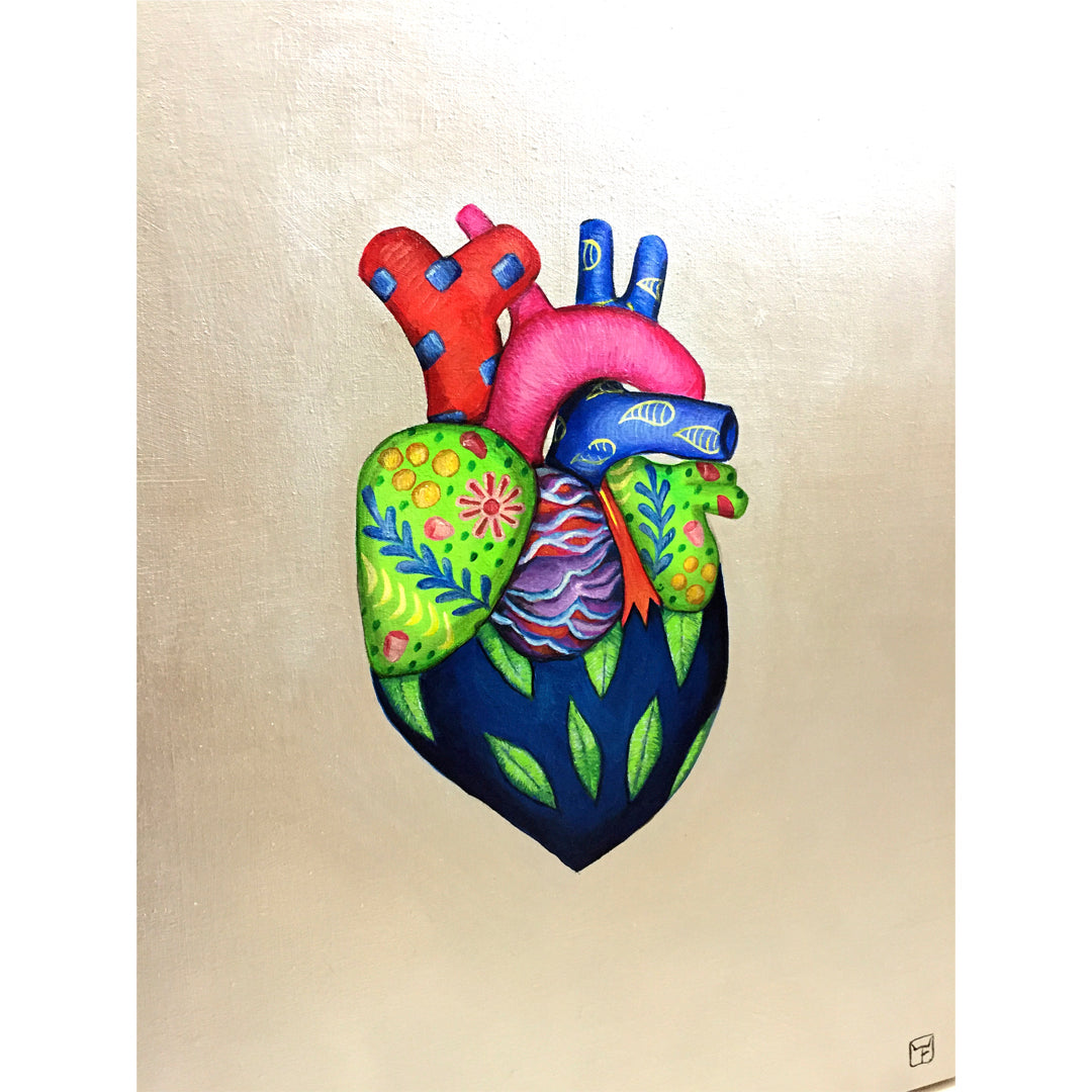 En Corazón Mexicano, un corazón vibrante palpita con tonos de rojo, rosa, verde y azul. El diseño está adornado con motivos florales y geométricos típicos del arte popular mexicano, irradiando vida y tradición. El fondo de hoja de plata brilla suavemente, como un manto celestial, destacando el corazón como un emblema sagrado de identidad y pasión. La obra es un homenaje a la riqueza cultural, donde lo moderno y lo ancestral se encuentran en un resplandor eterno.