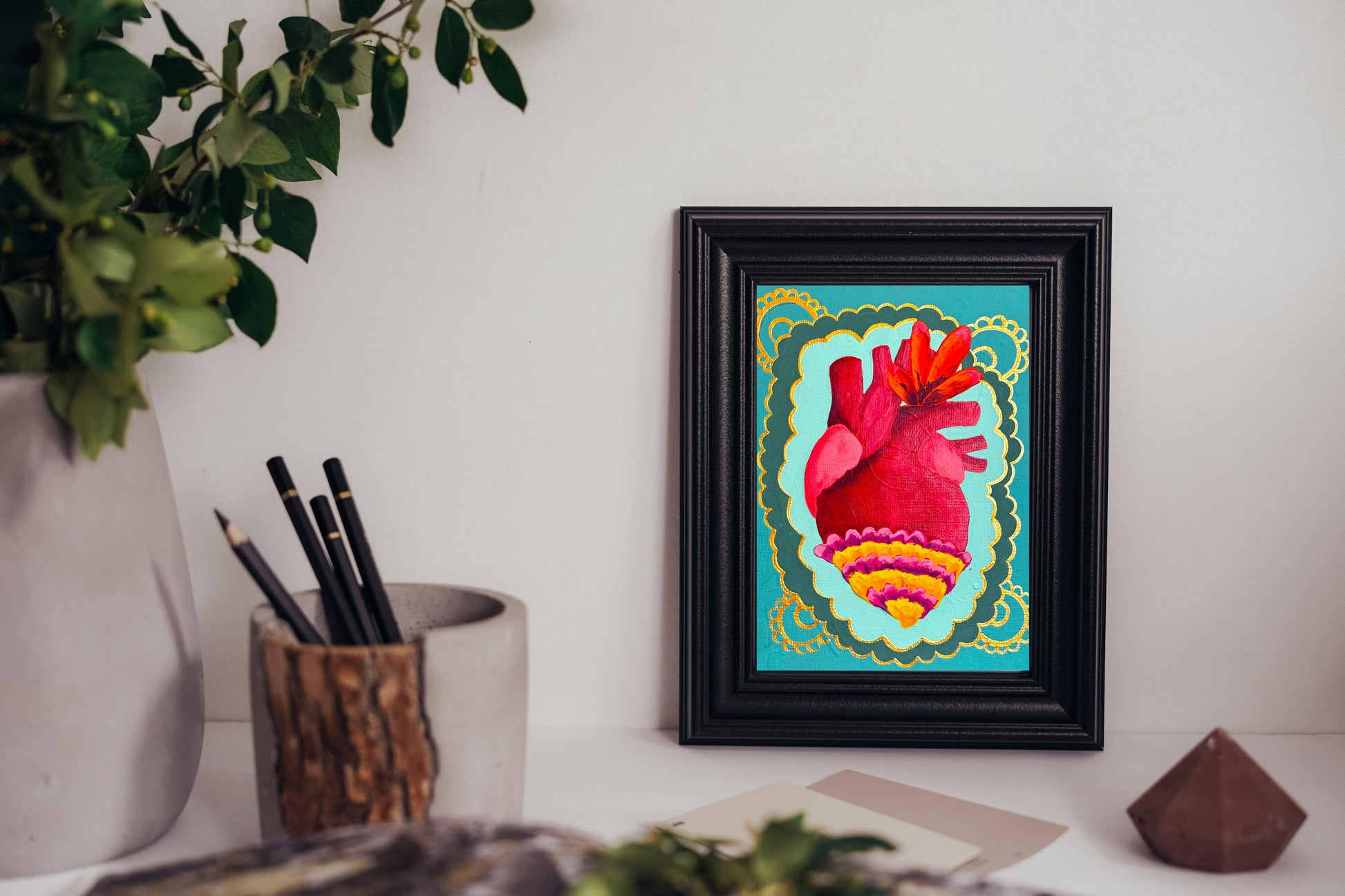 Una vez ubicada la obra en su lugar de exposición, te recomendamos evitar tocarla, no la expongas a cambios bruscos de temperatura y ten cuidado exponiéndola mucho a la luz. Procura mantenerla limpia, libre de polvo y comida y trata de no limpiarla con productos químicos que usarías normalmente en tu casa. Con esto lograrás tener una obra como nueva.